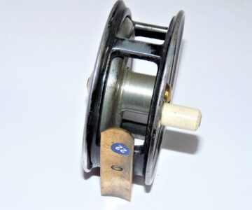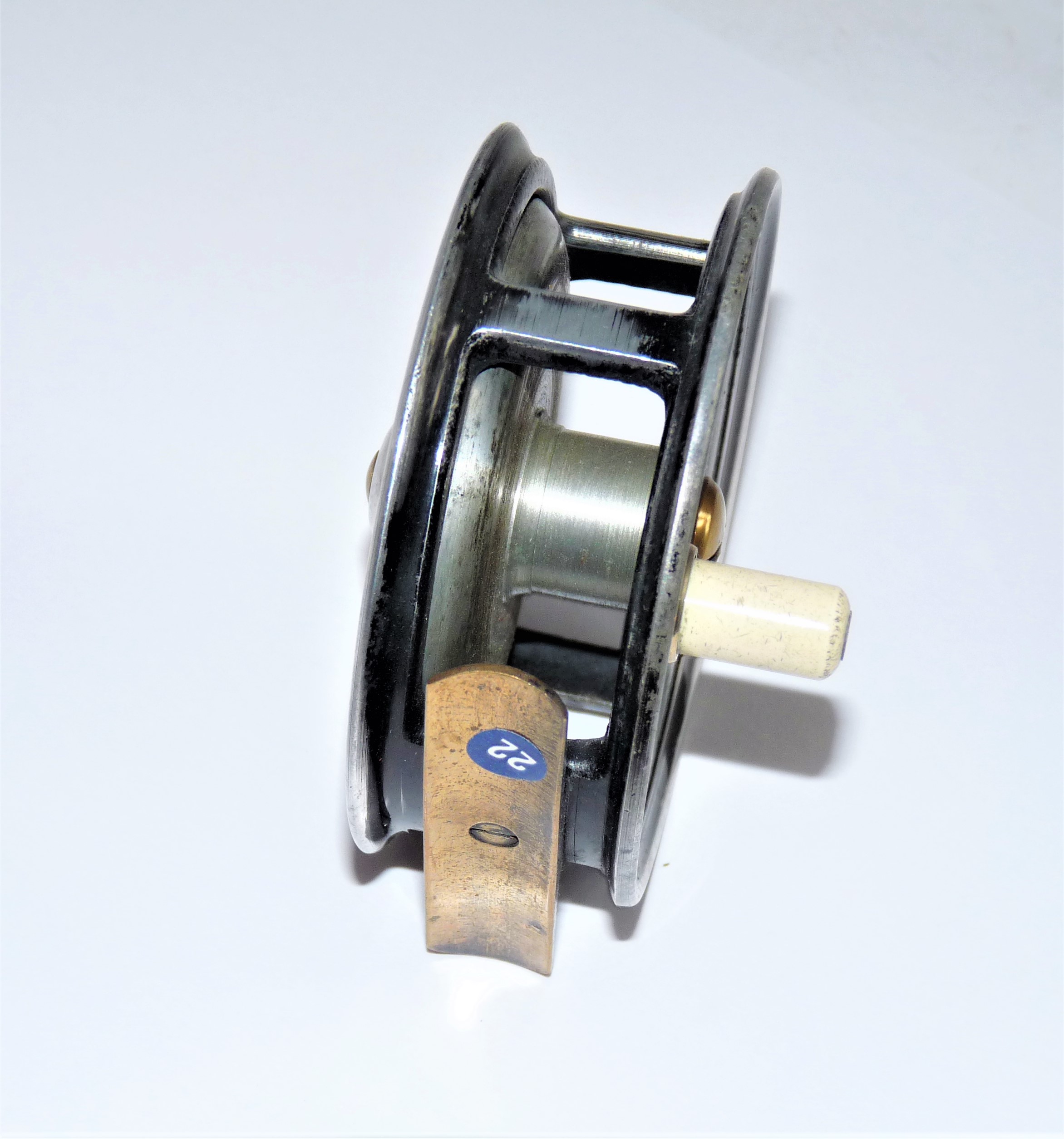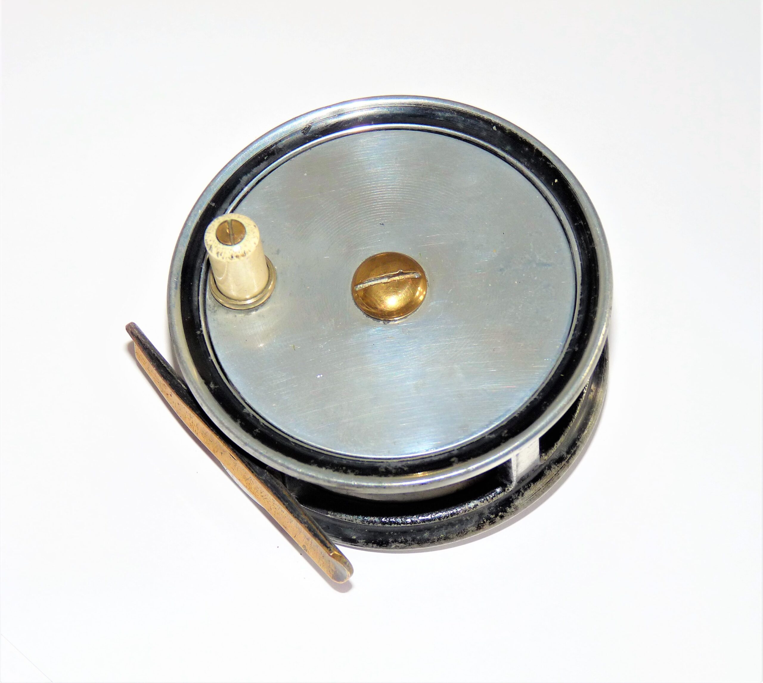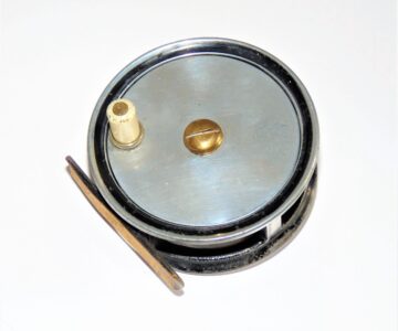 Fine little 3″ diameter Trout fly reel by Odgen Smiths of London with xylonite handle, brass central removalable drum screw, straight brass 60mm foot, single check with bright finish.