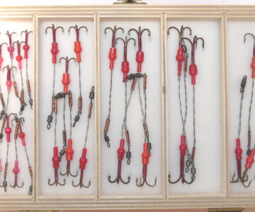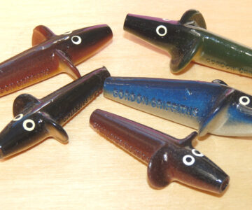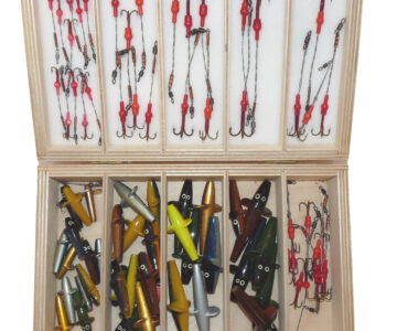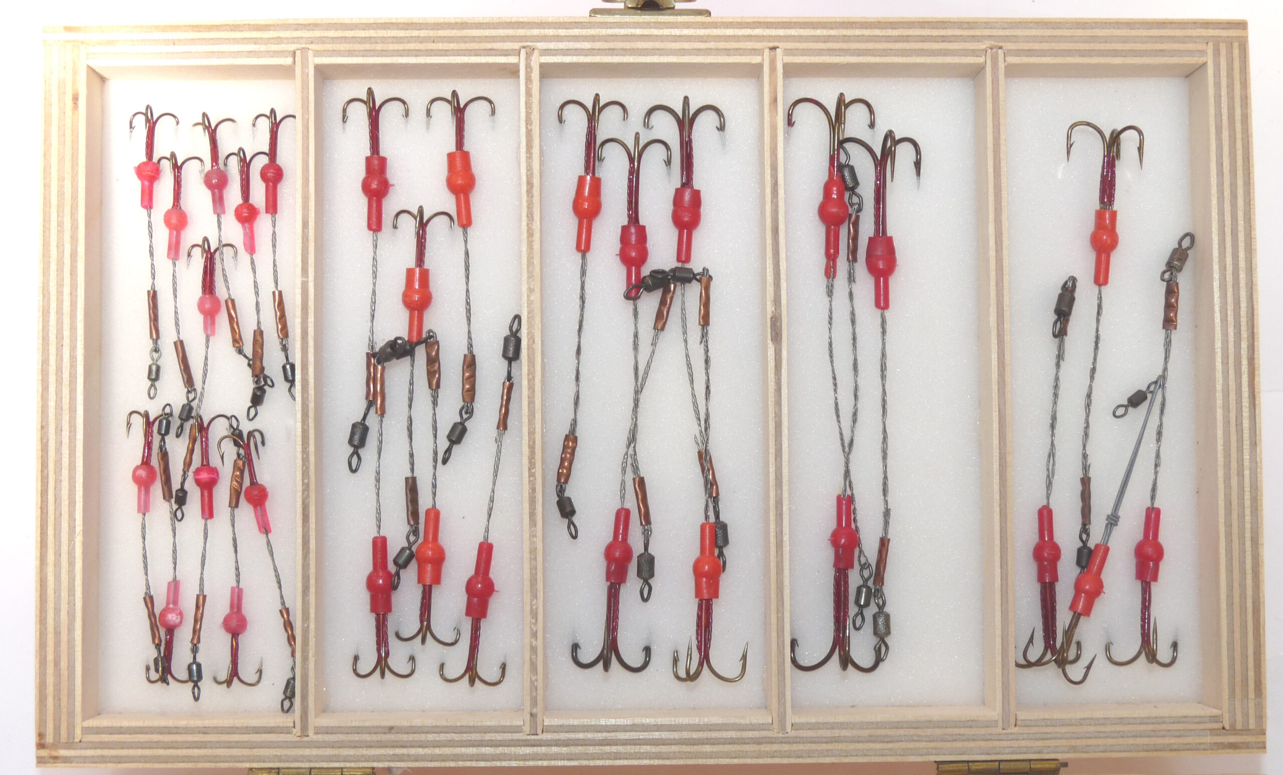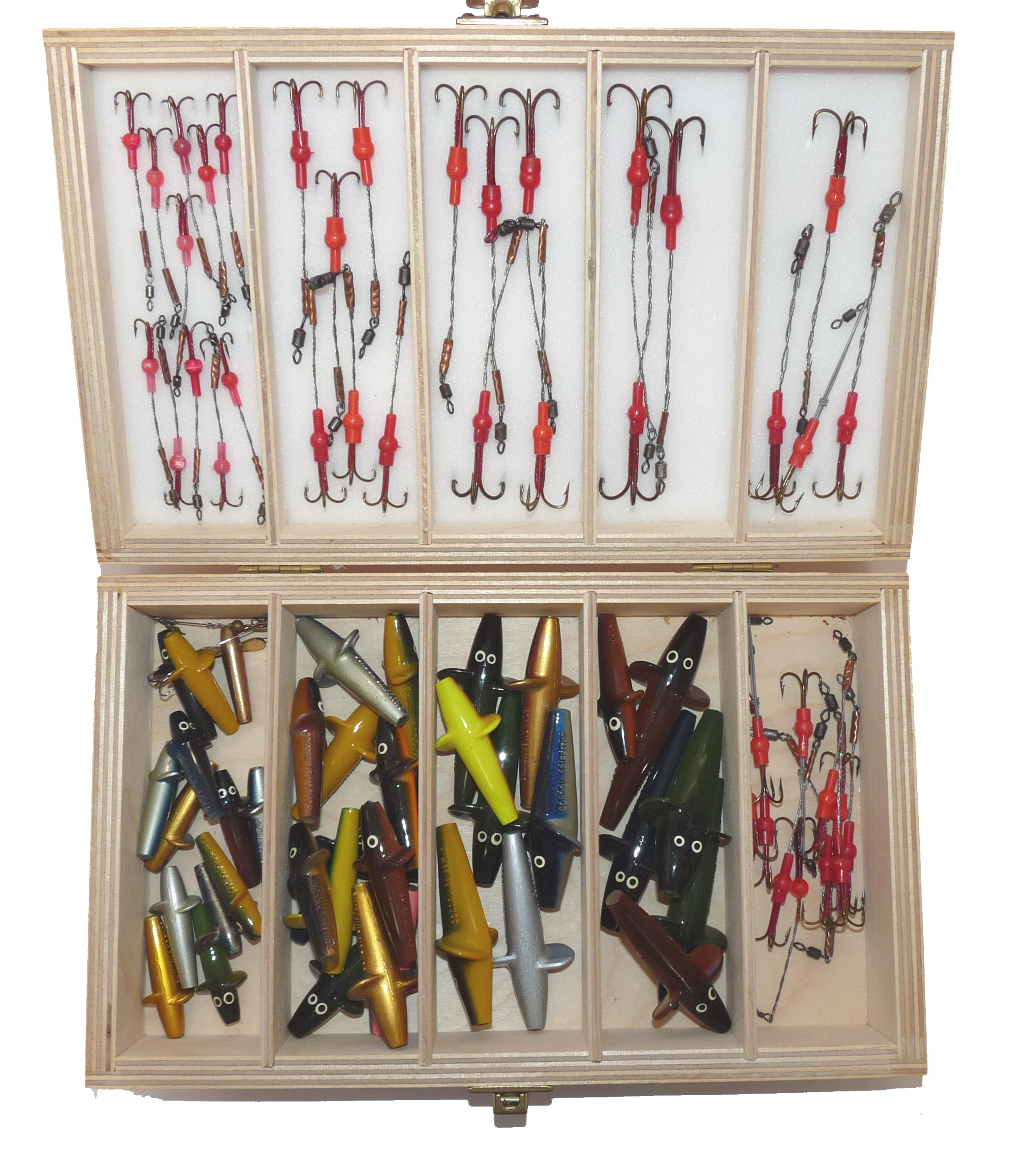 A collection of approx. 40 high quality Devon minnow lures by Gordon Griffiths. Sizes ranging from 1.25 t0 3”.Assorted colours and patterns, all appear unused with a selection of matching hook mounts with swivels, ready to fish. All contained in very smart Gordon Griffiths fitted wooden lure box measuring 10” x6” x 2.5”