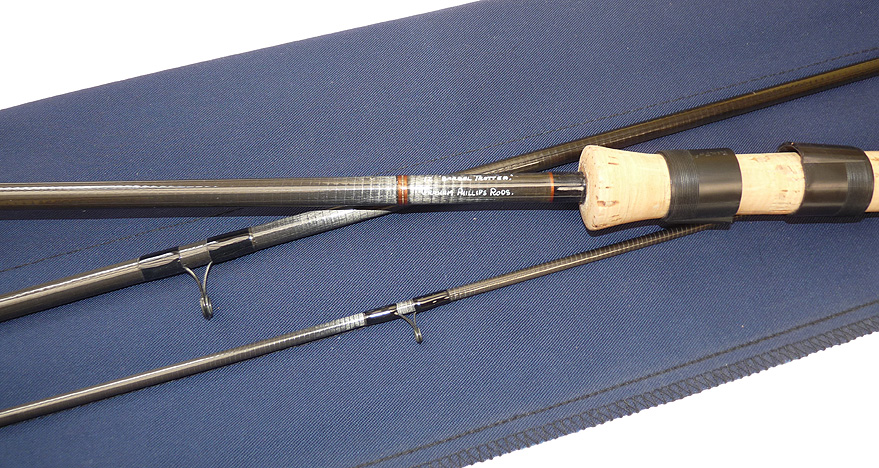 Graham Phillips Rods, Barbel Trotter 12’ 3 piece coarse fishing rod, in as new condition. Stunning lightweight slim rod built on a Harrison blank with black whipped lined guides, pushover ferrules, 23.5” shaped cork handle, and black reel rings. A stunning mid-top action rod that pulls through under pressure, ideal for barbel, chub, bream or even big roach. If I was on the river, I’d keep this for myself. It comes with the maker’s original cloth bag.