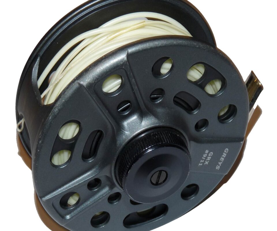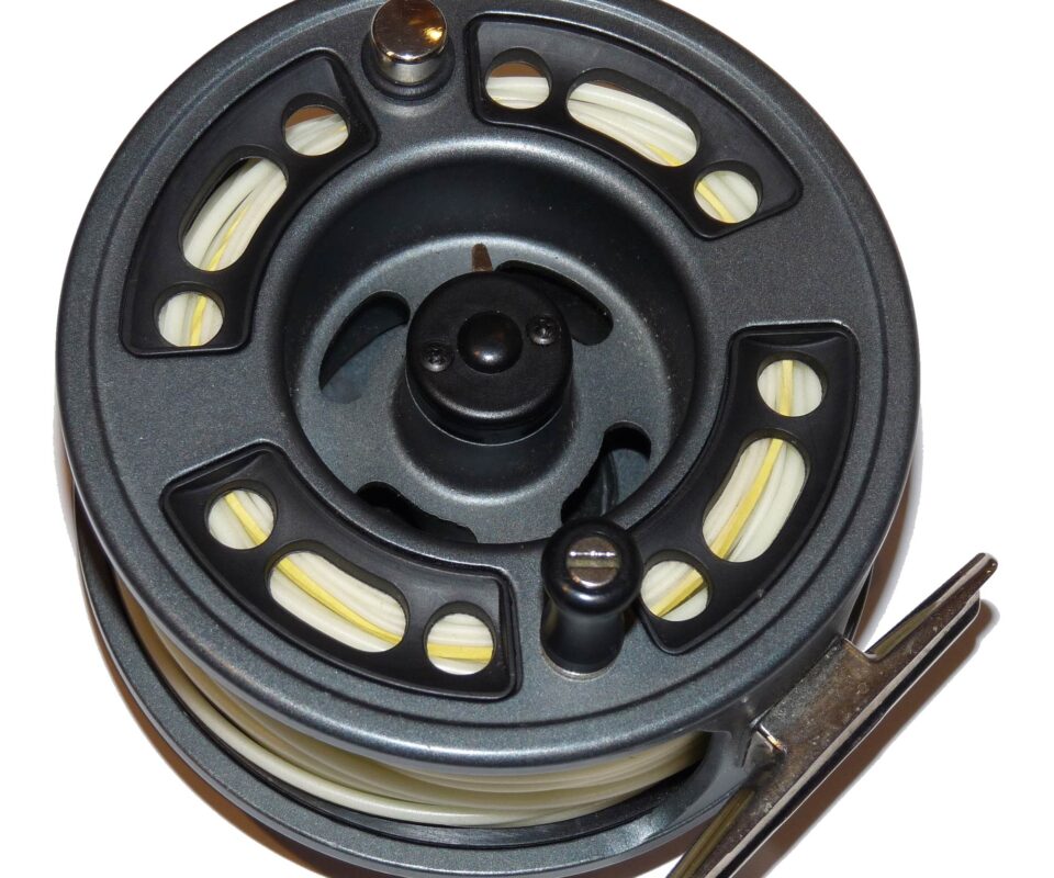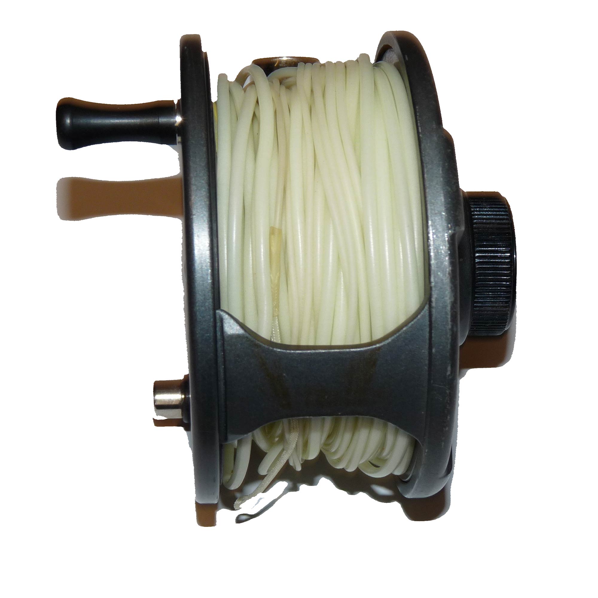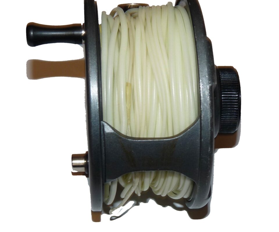 TT opinion: A find Greys salmon fly reel with black handle, silver circular counter balance, large arbor and quick release central latch. Loaded with floating line and with 4 spare spools and green case.
