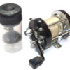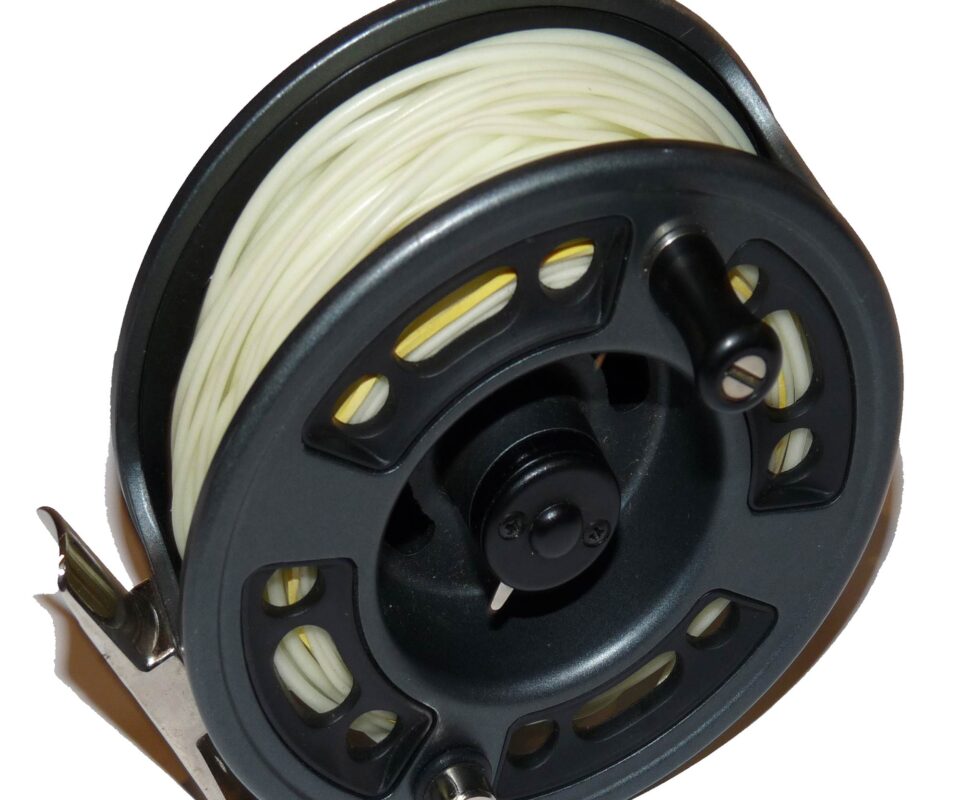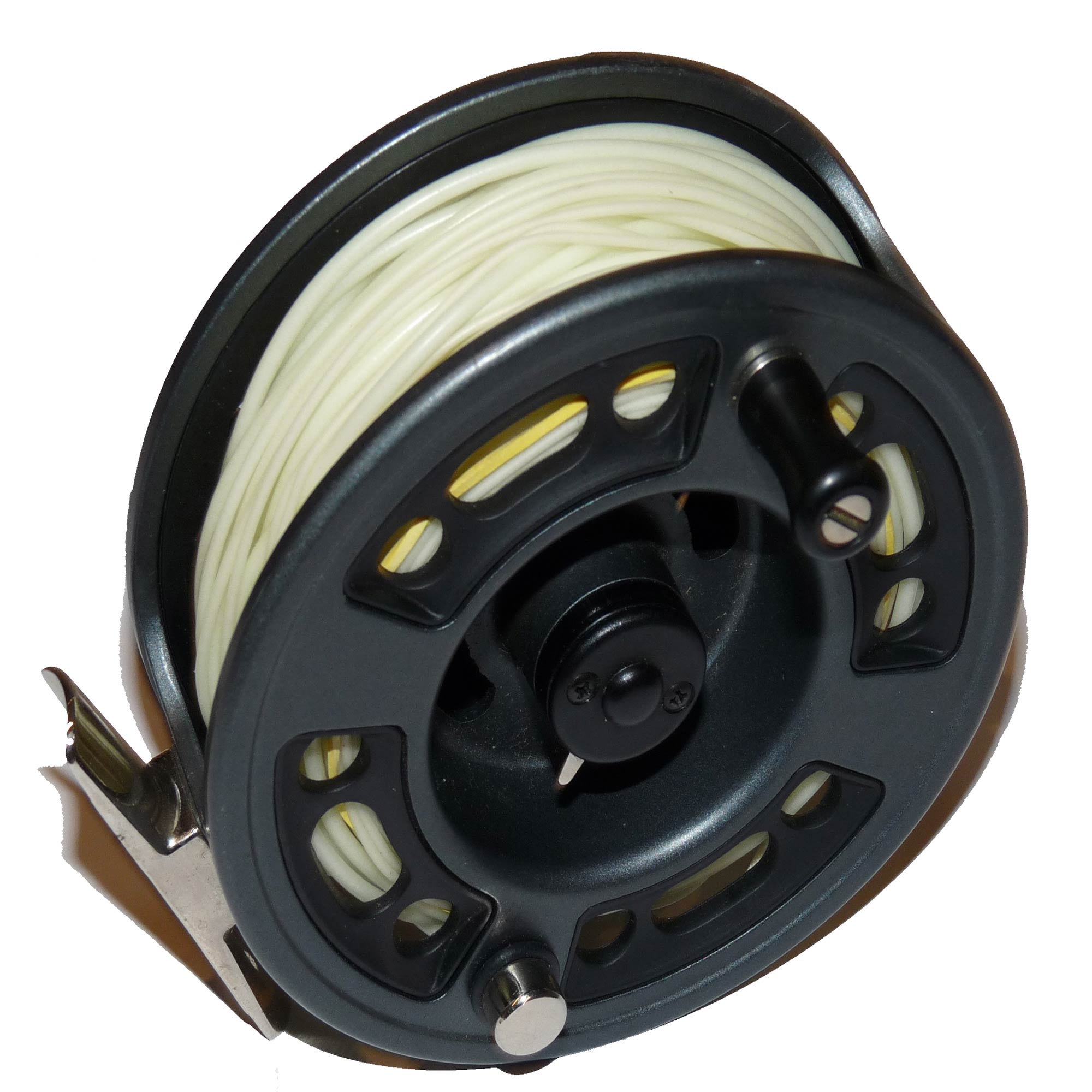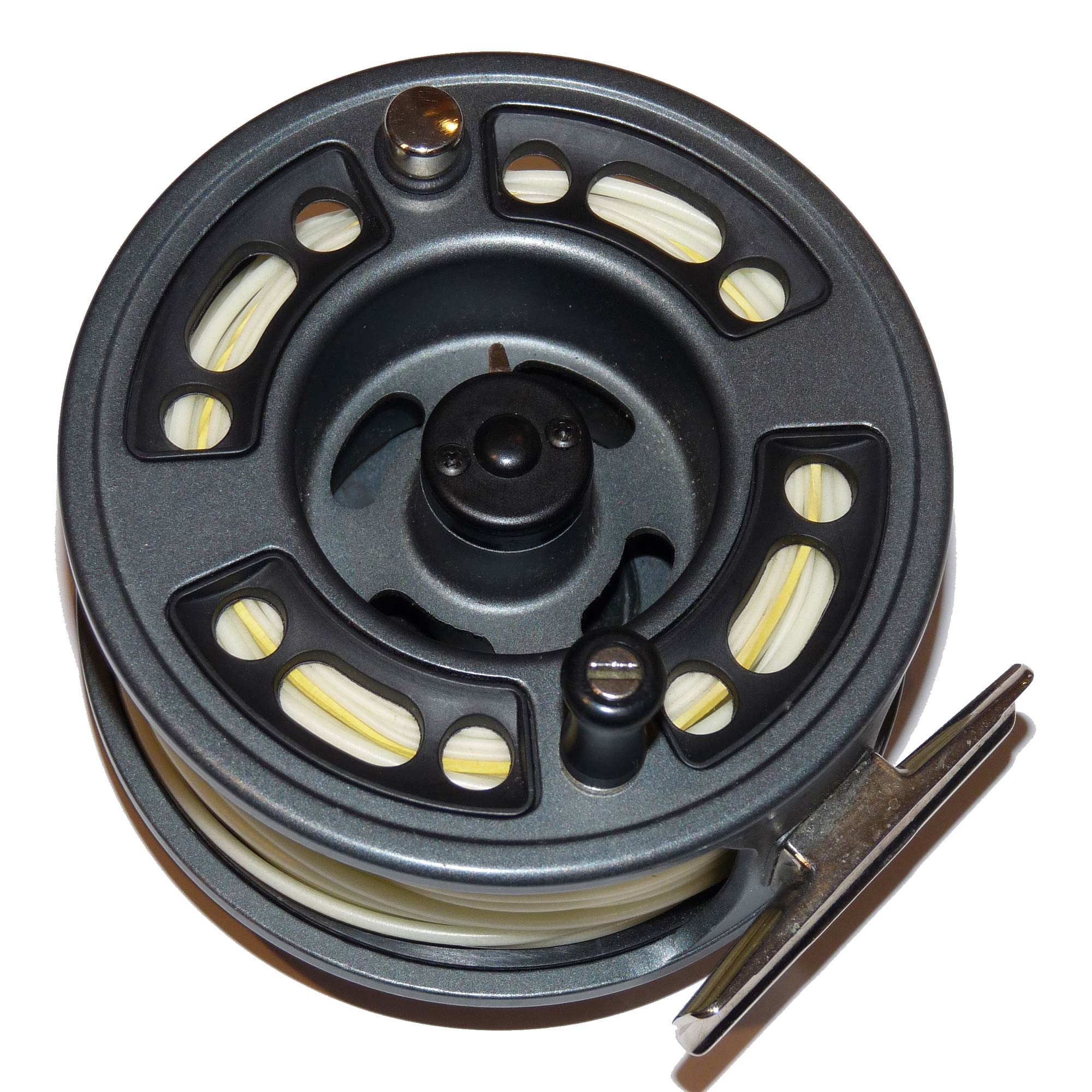 TT opinion: A find Greys salmon fly reel with black handle, silver circular counter balance, large arbor and quick release central latch. Loaded with floating line and with 4 spare spools and green case.