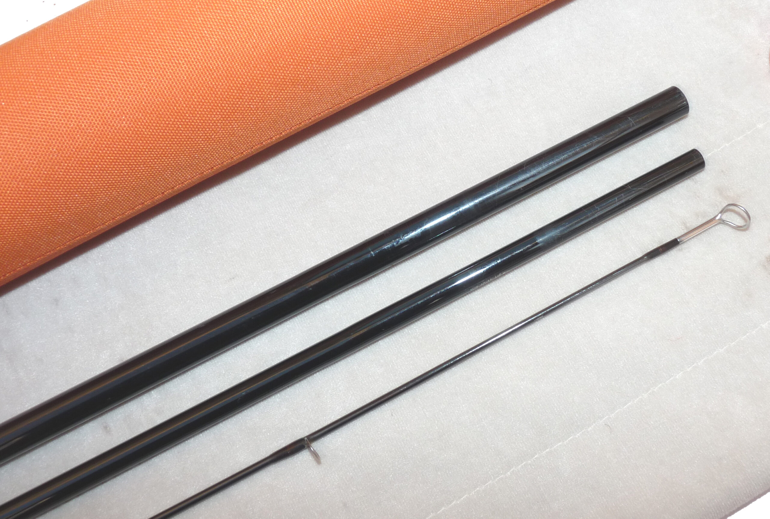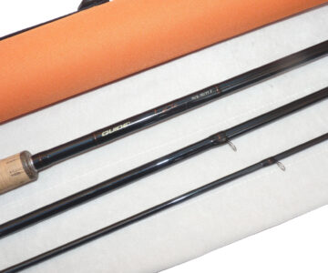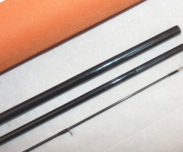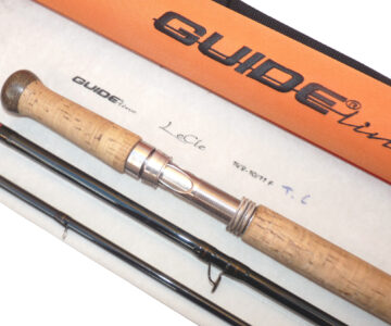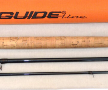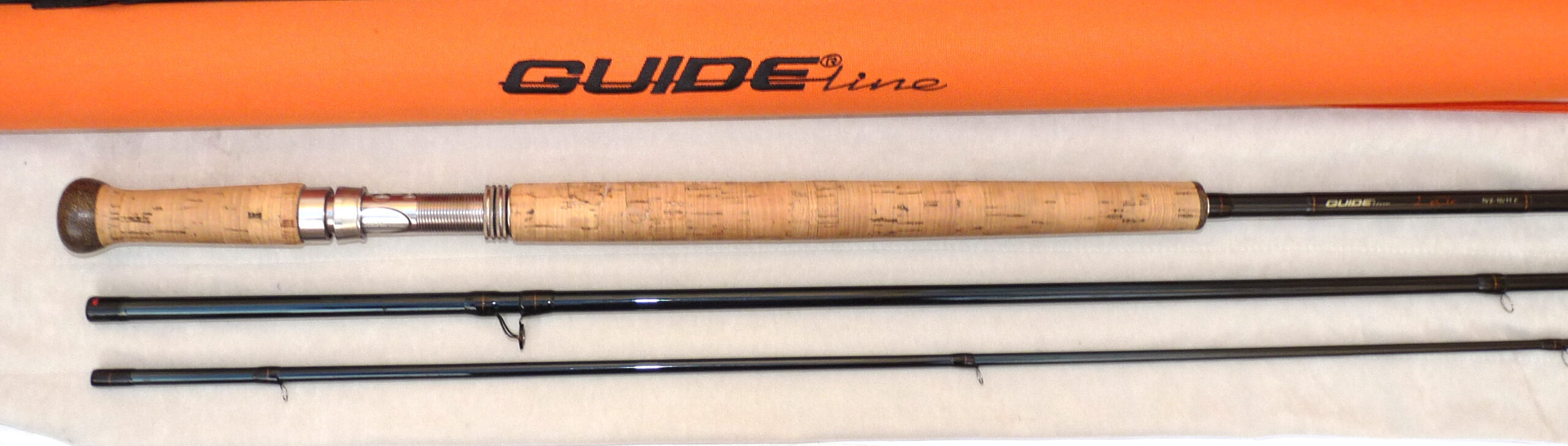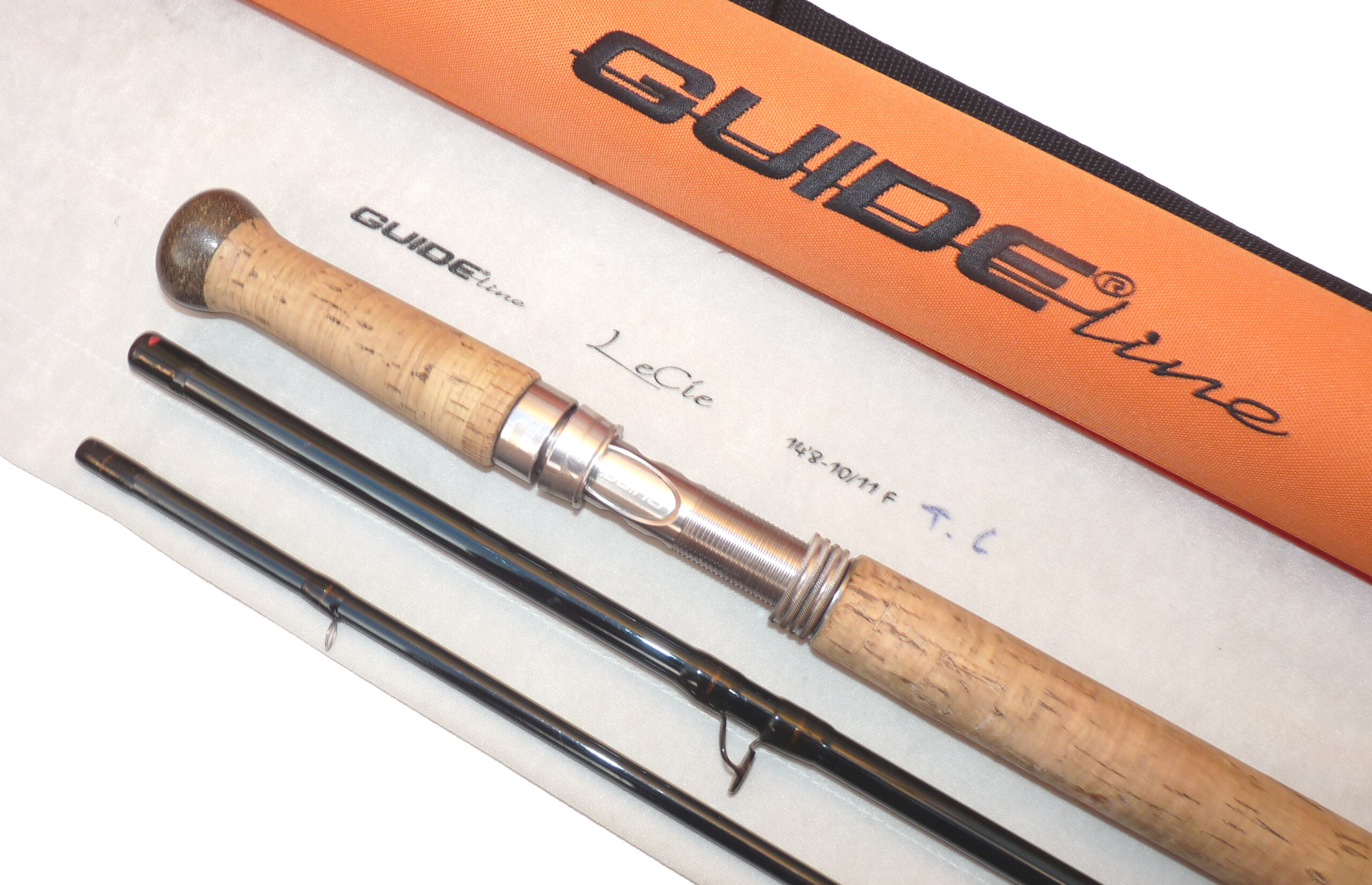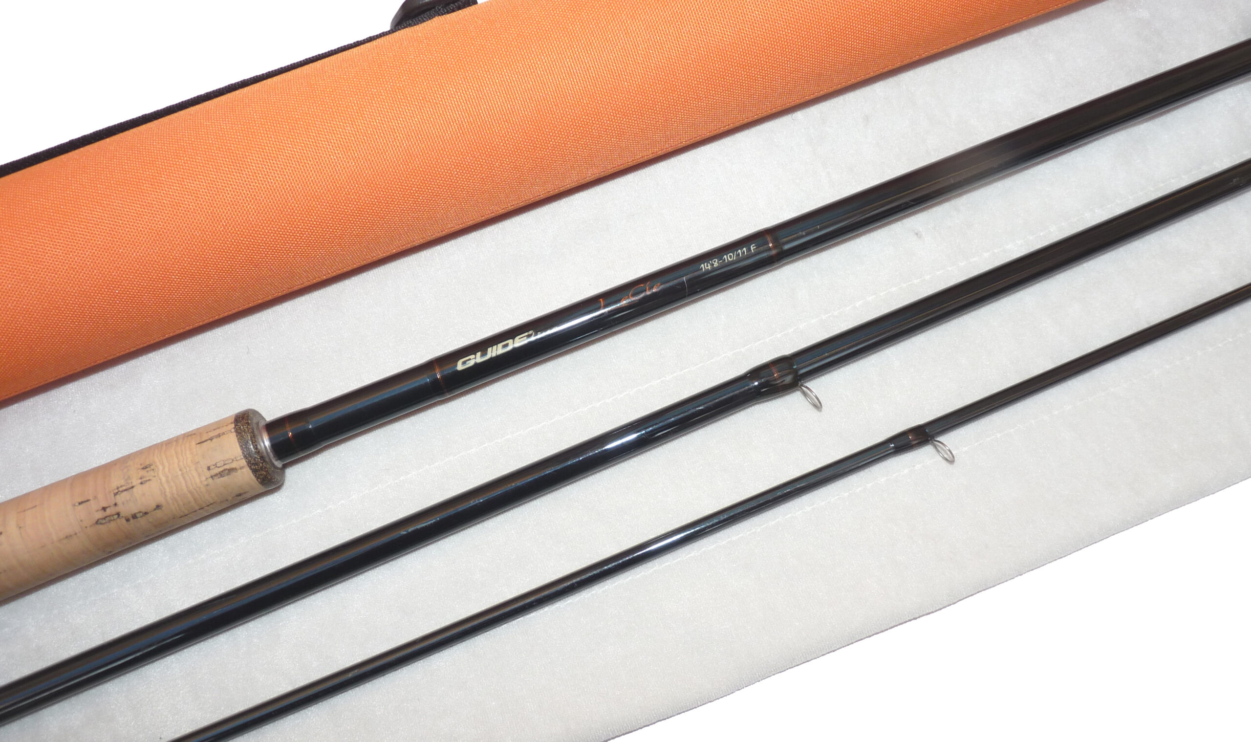Guide-Line Le Cie 14’ 8”, three piece graphite salmon fly rod, in excellent condition, line rate #10/11 F, large diameter guides whipped black, tipped gold, 22 ½” shaped cork handle with twin screw machined alloy reel fitting, fabulous quality rod, comes with maker’s original bag and Orange Cordura rod tube.