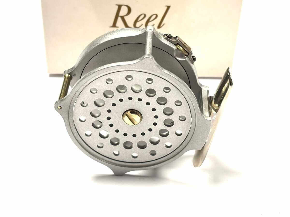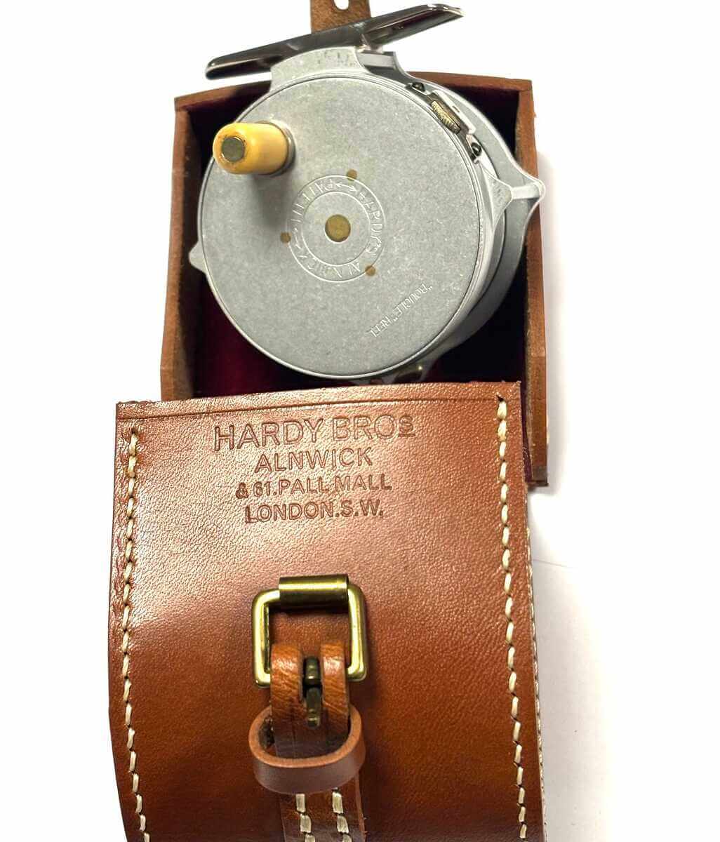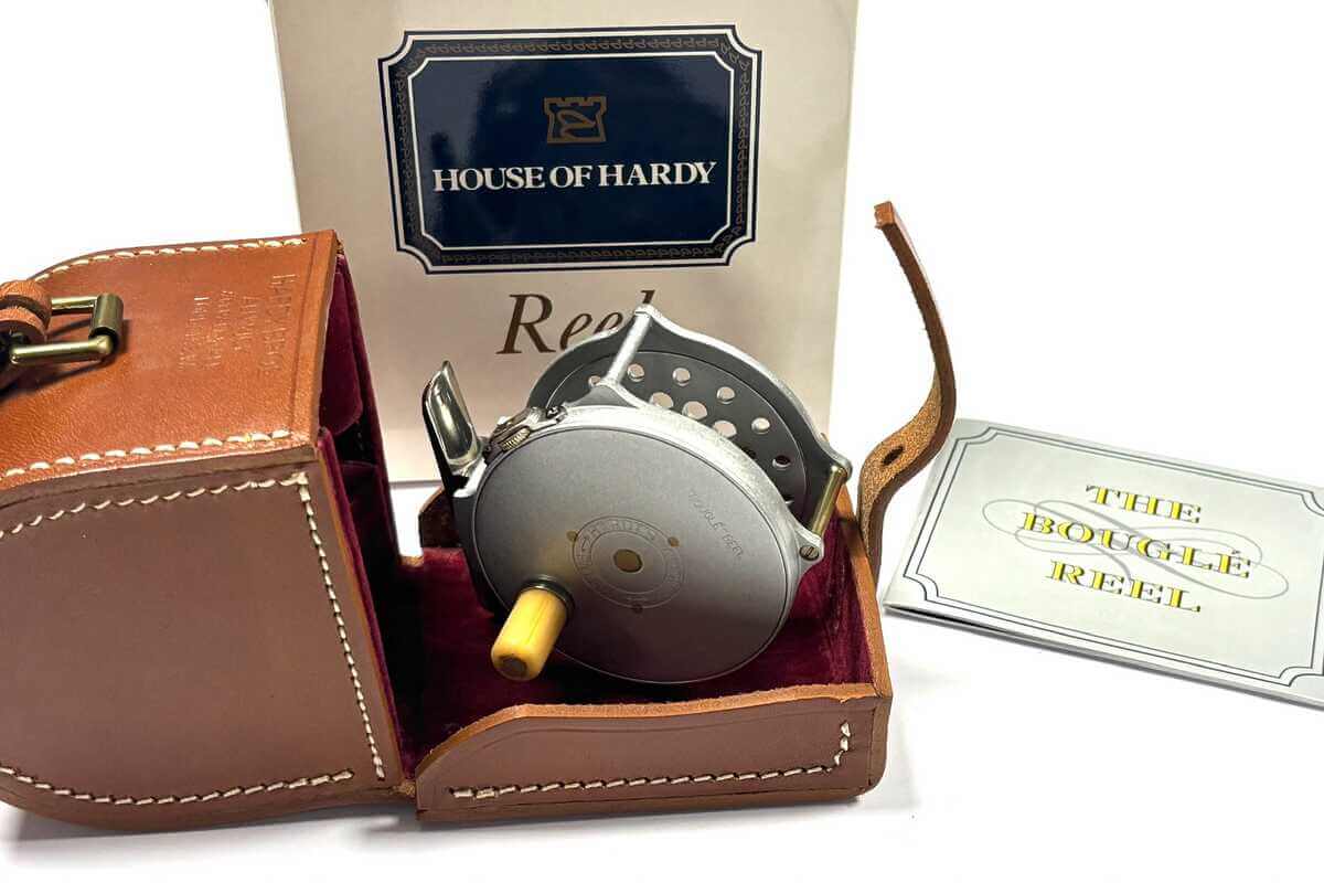 TT opinion: A mint example of the Hardy Bougle 2.5″ alloy trout fly reel, made in Alnwick England. A very good example with white handle, 1903 internal check, one roller pillar, plus rim tension regulator and 60mm smooth alloy foot. Runs lovely with smooth check clicker. A fabulous reel to mark the 125th Anniversary.