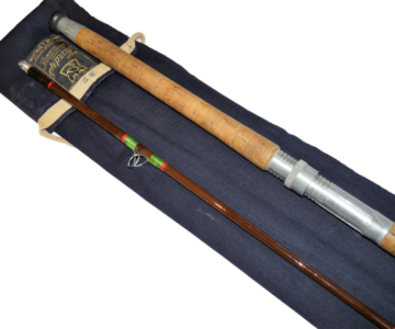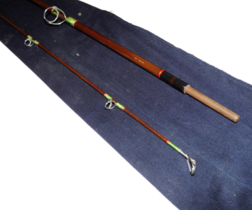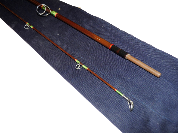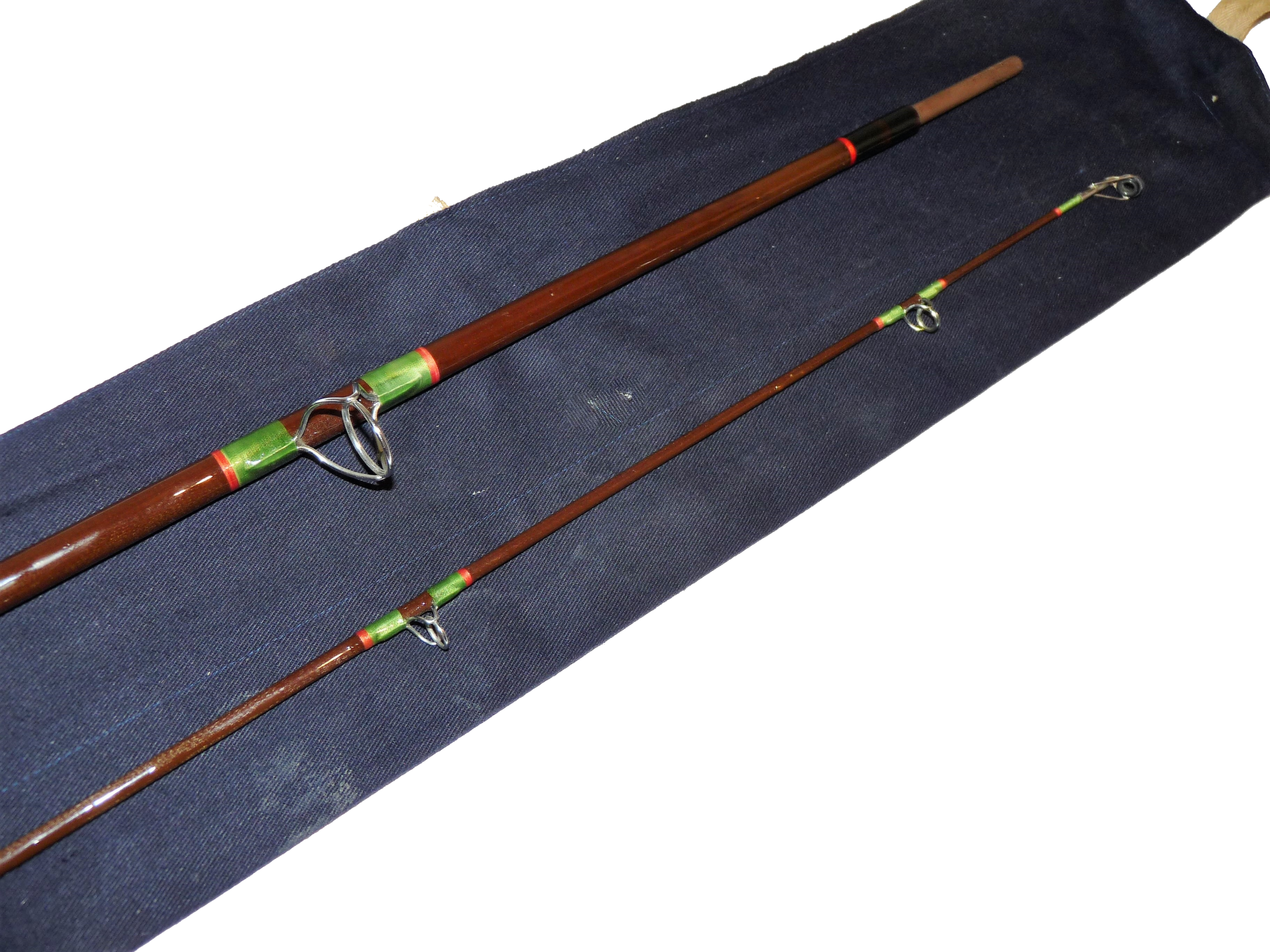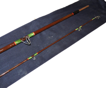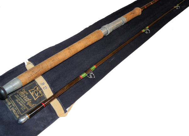 A lovely rod in fine condition, two piece, strong all through action spinning rod. Green whippings tipped in red and clean cork two section handle with alloy screw in reel fittings. Complete with Hardy blue rod bag with some spots of white paint!