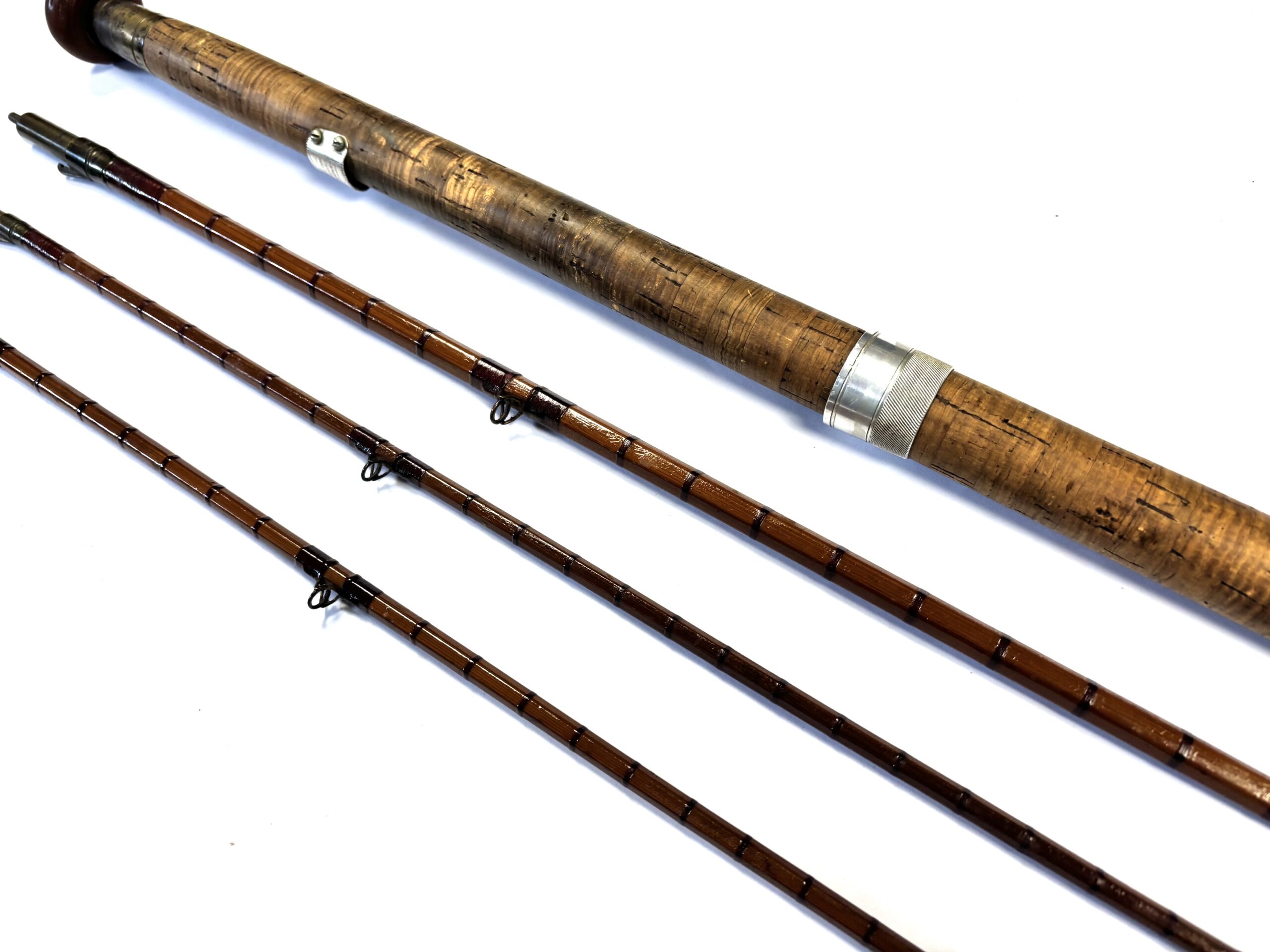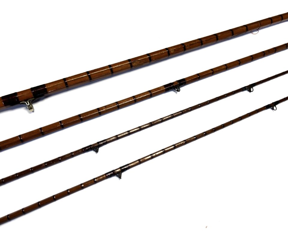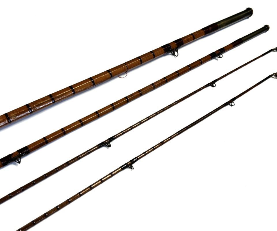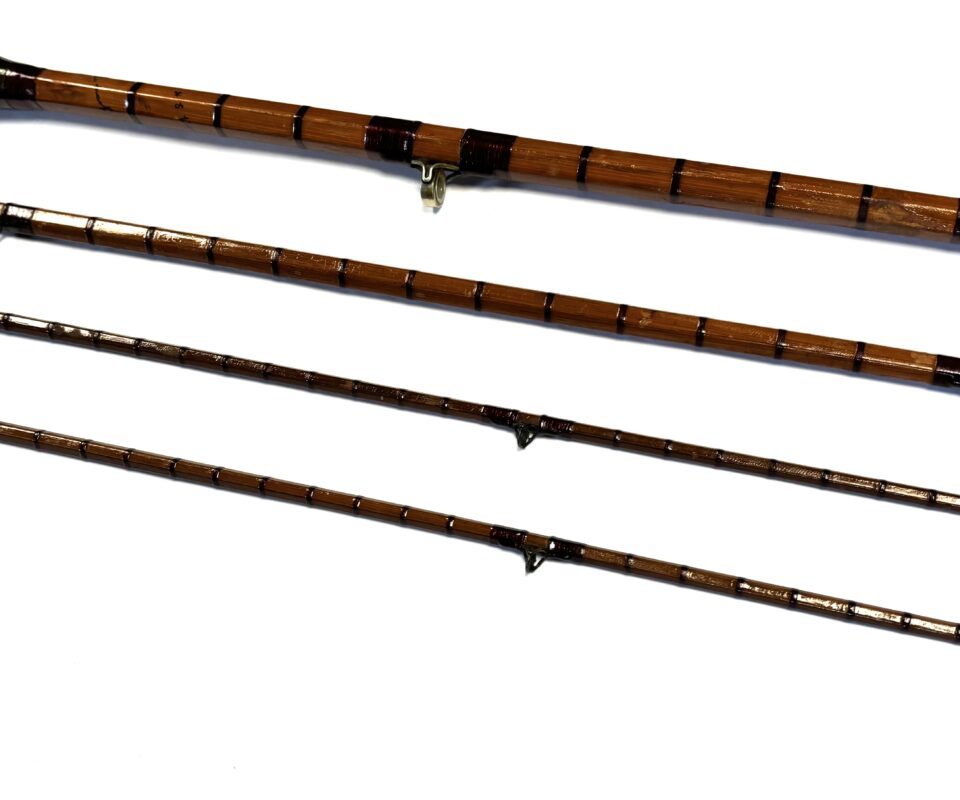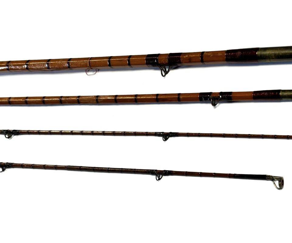 Three-piece rod with matching spare tip (slightly short), red wraps, intermediates, alloy guides and cork handle. Beige rod bag.