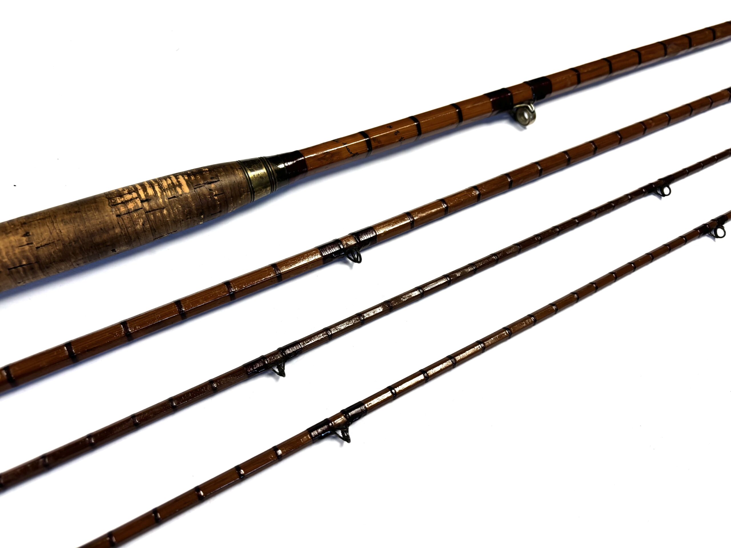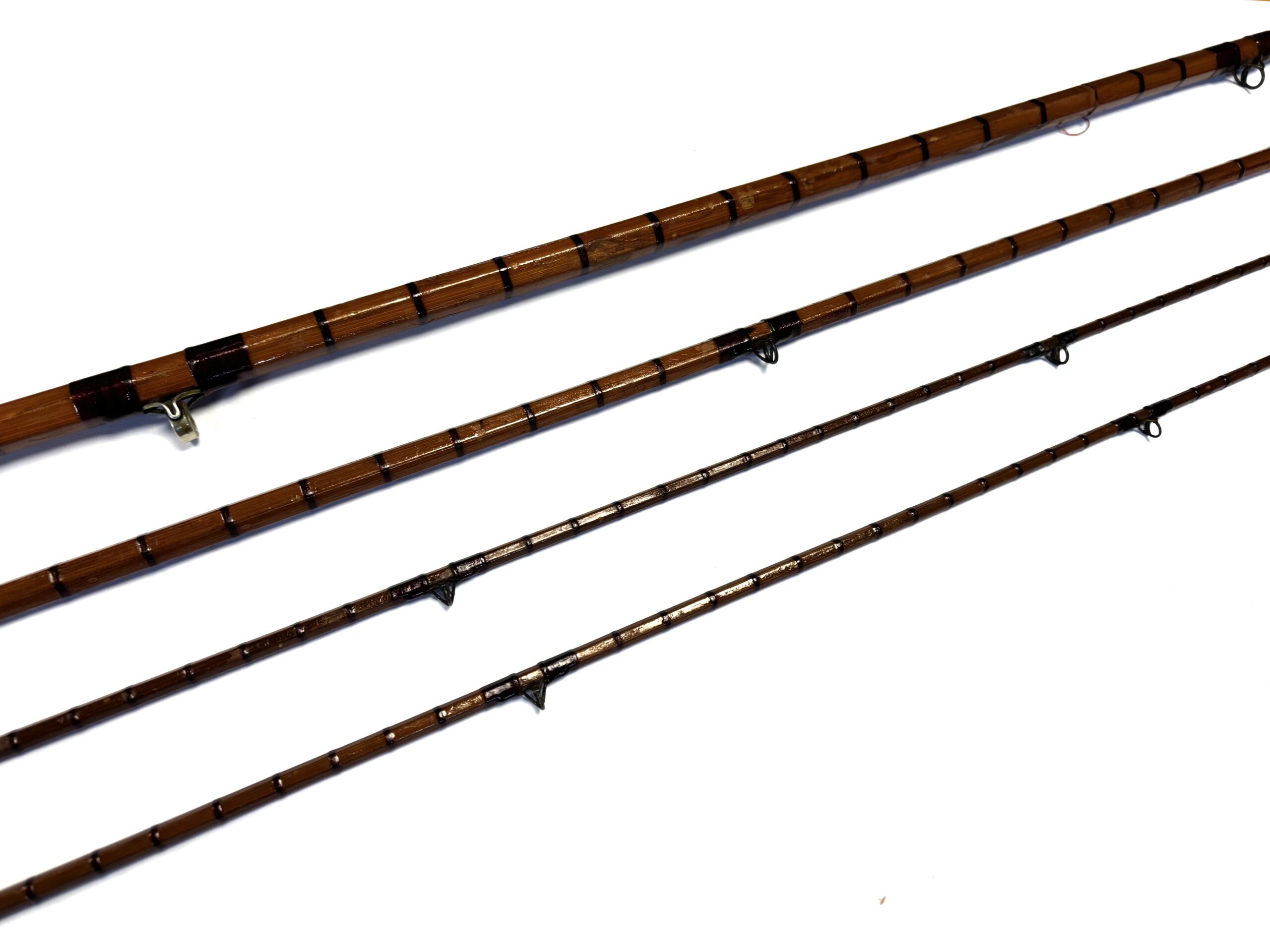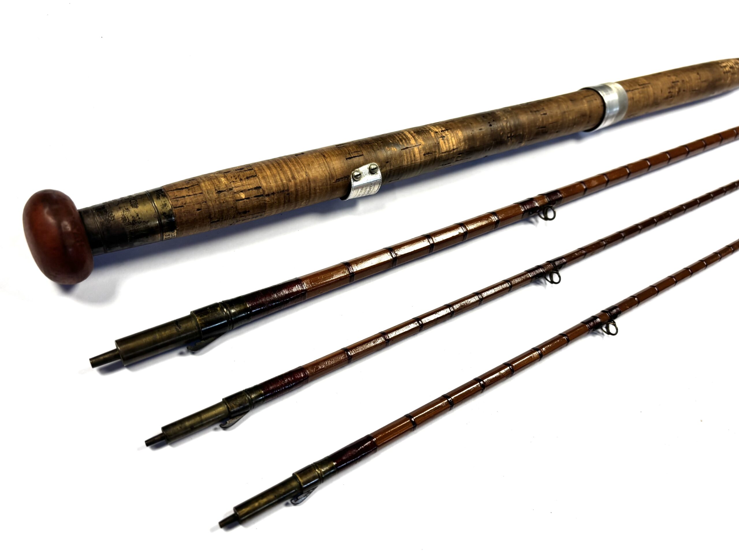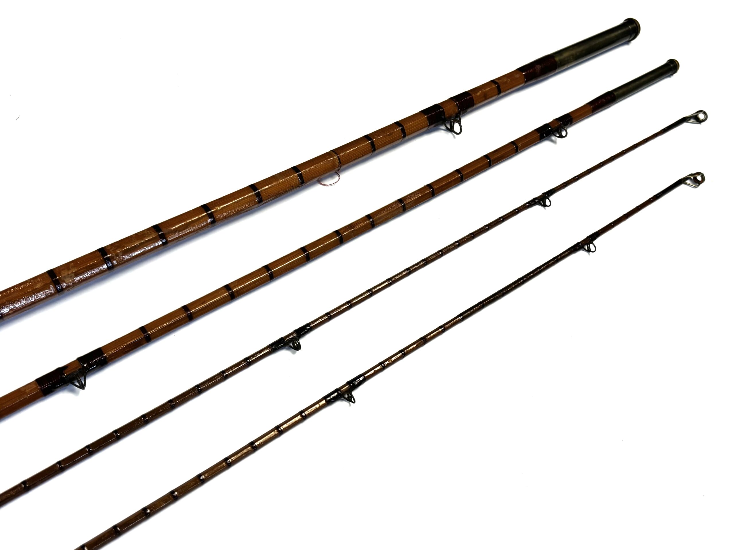 Three-piece rod with matching spare tip (slightly short), red wraps, intermediates, alloy guides and cork handle. Beige rod bag.