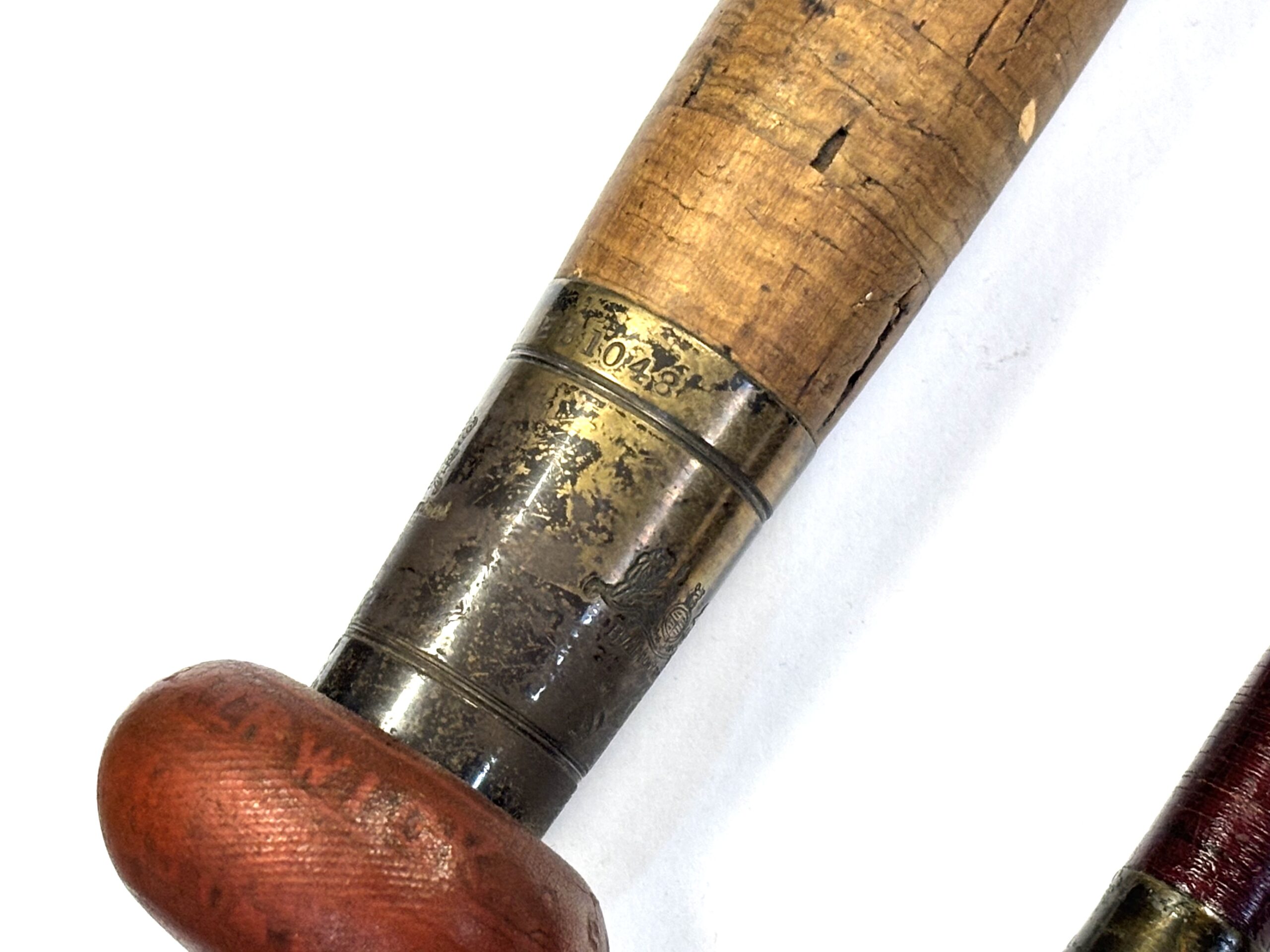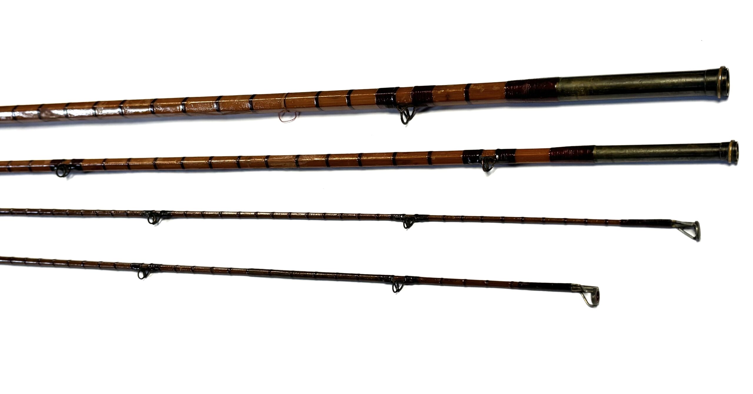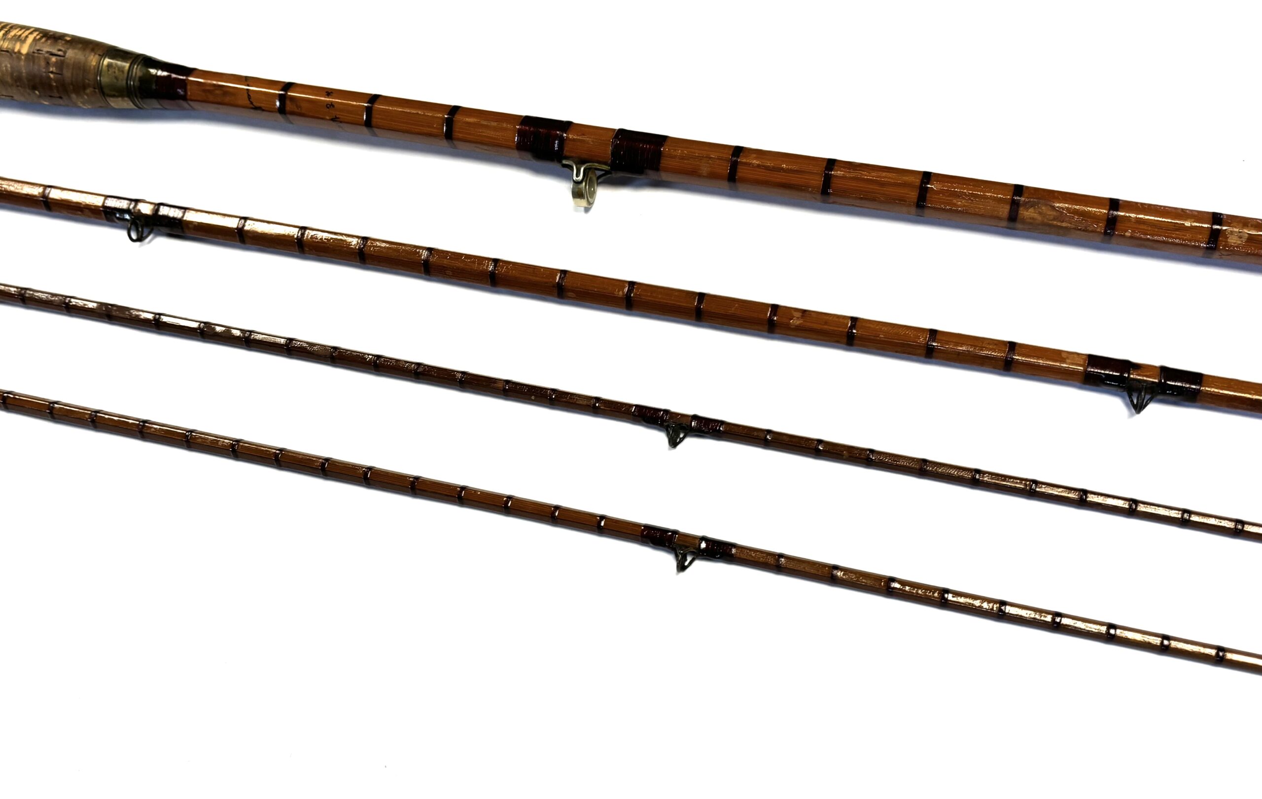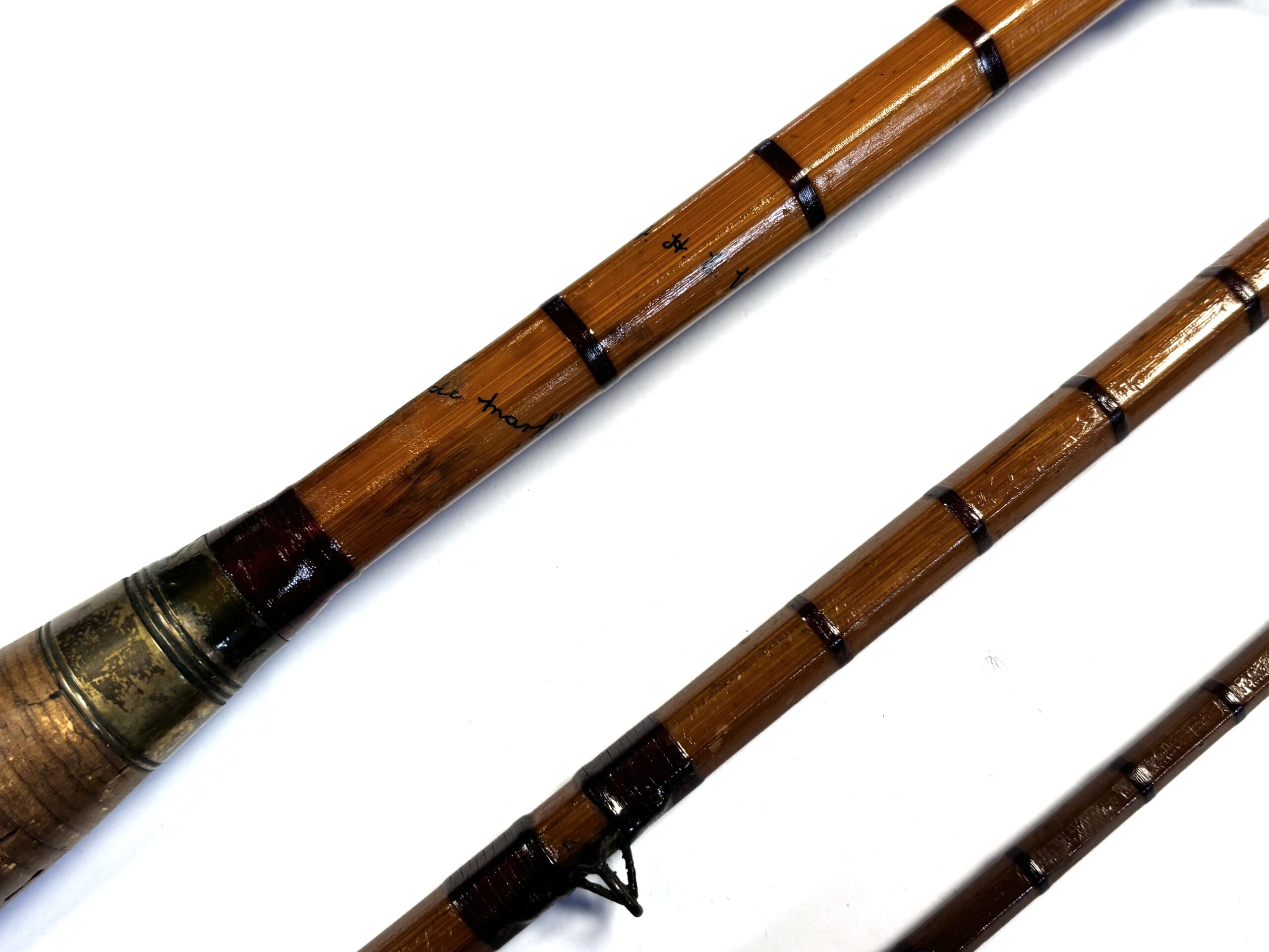 Three-piece rod with matching spare tip (slightly short), red wraps, intermediates, alloy guides and cork handle. Beige rod bag.