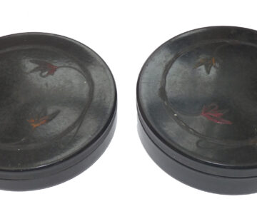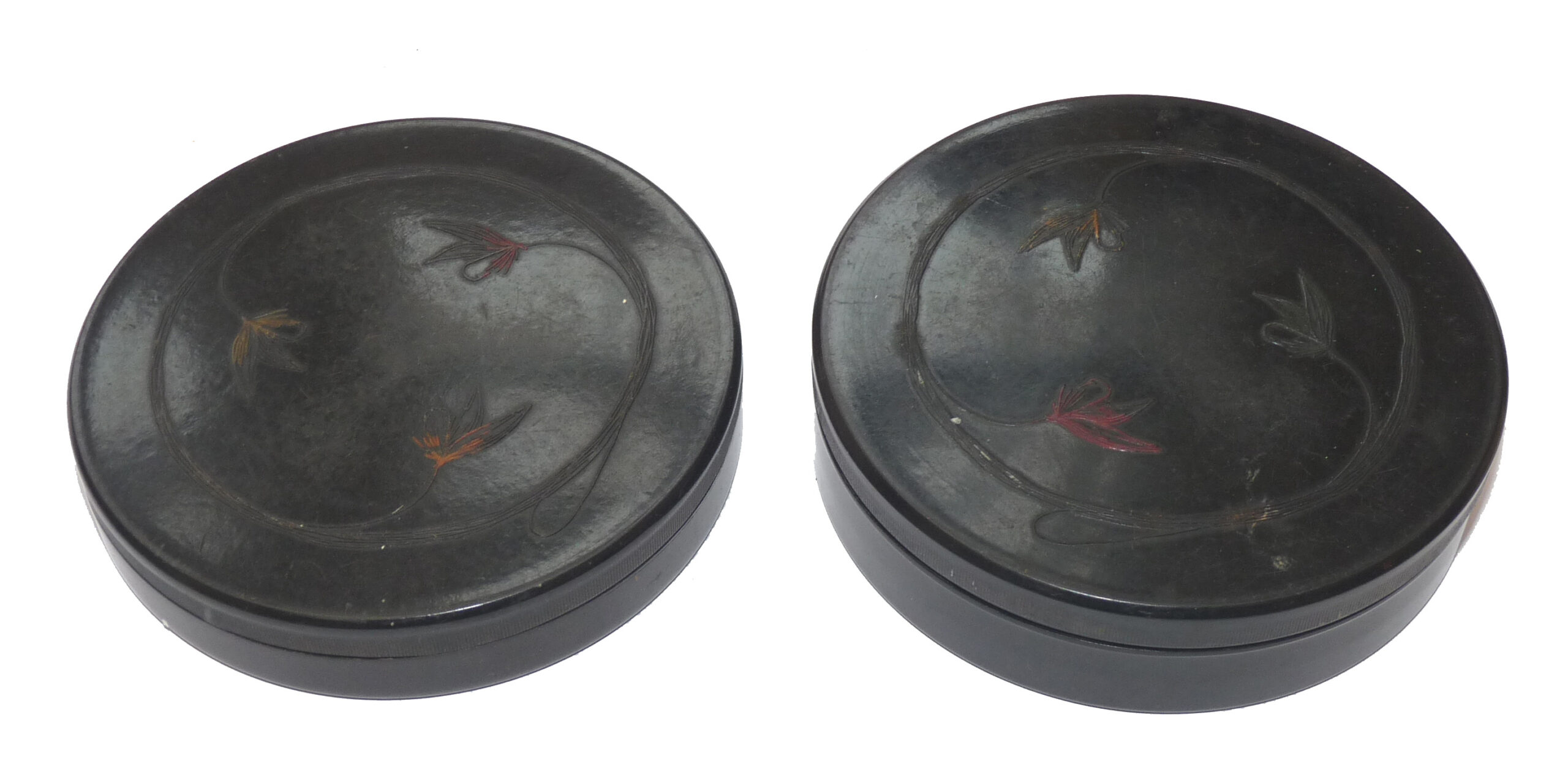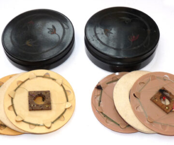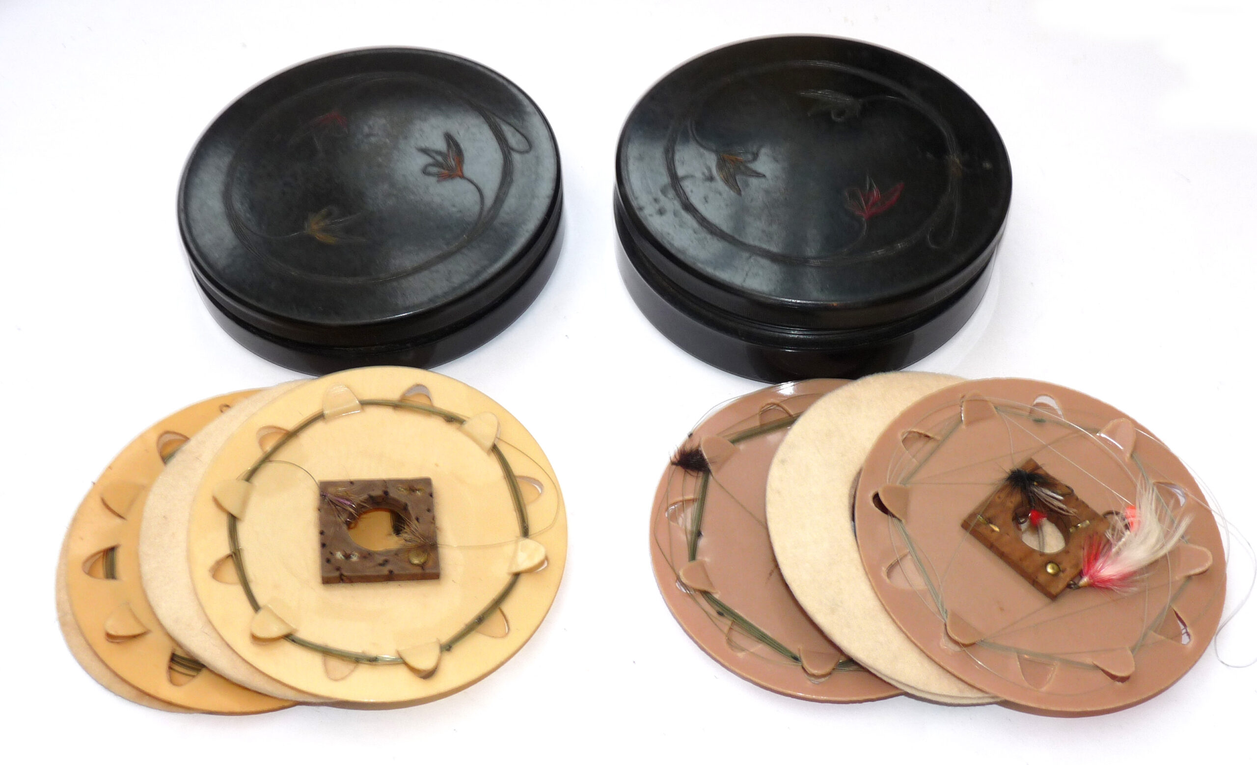 Pair of Hardy Album Bakelite cast dampers in small & large sizes. Both 4” diameter, 1 x 26mm deep, the other 20mm deep, embossed flies to lids, and containing internal cast winders with felt dampers. Great collector pieces.