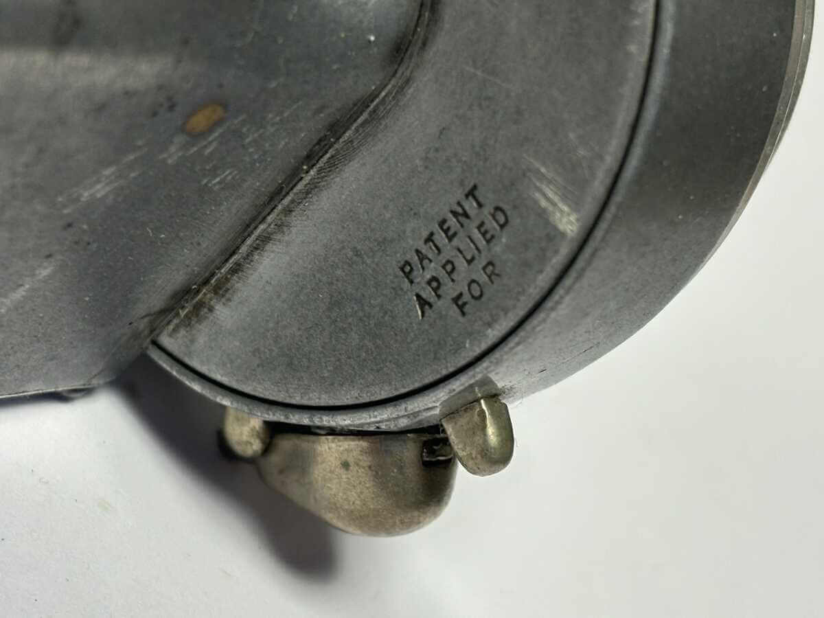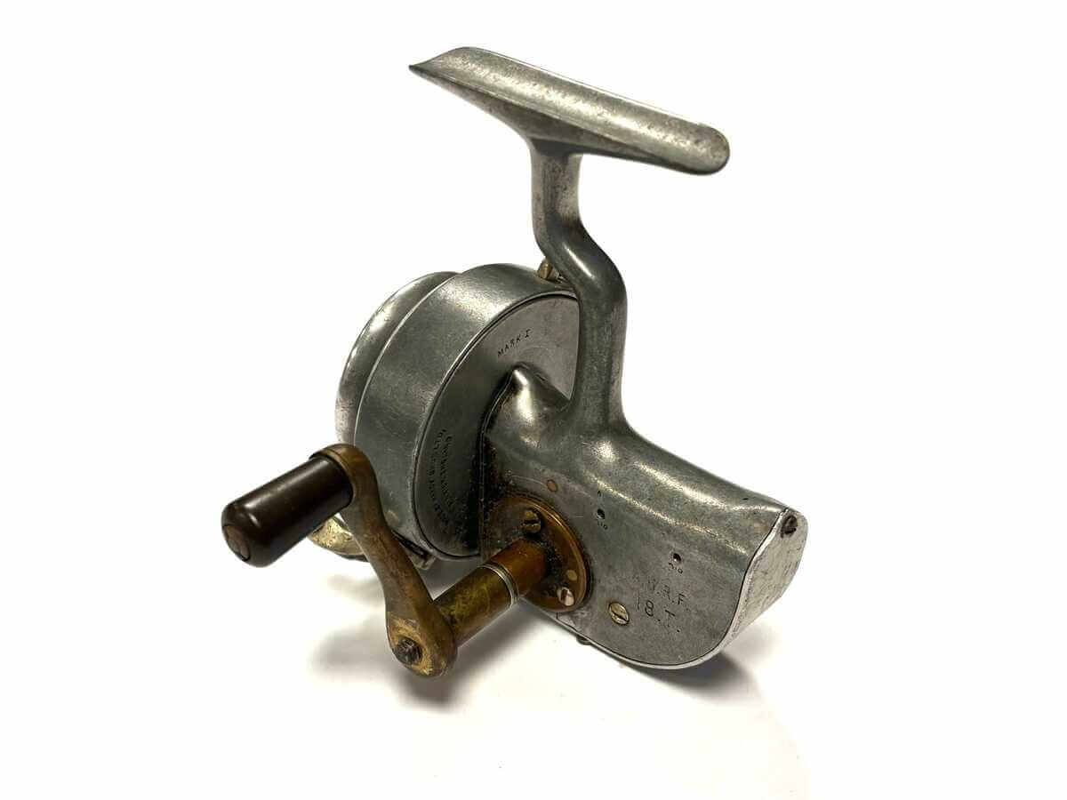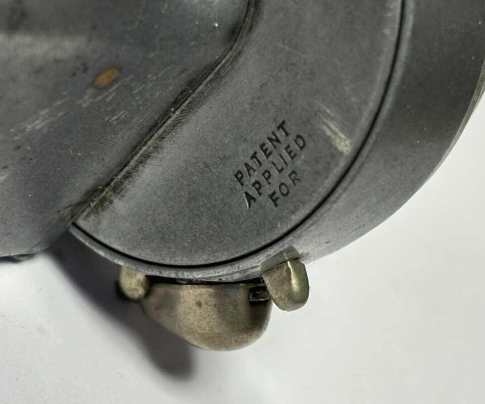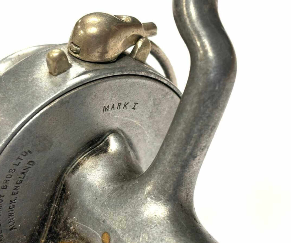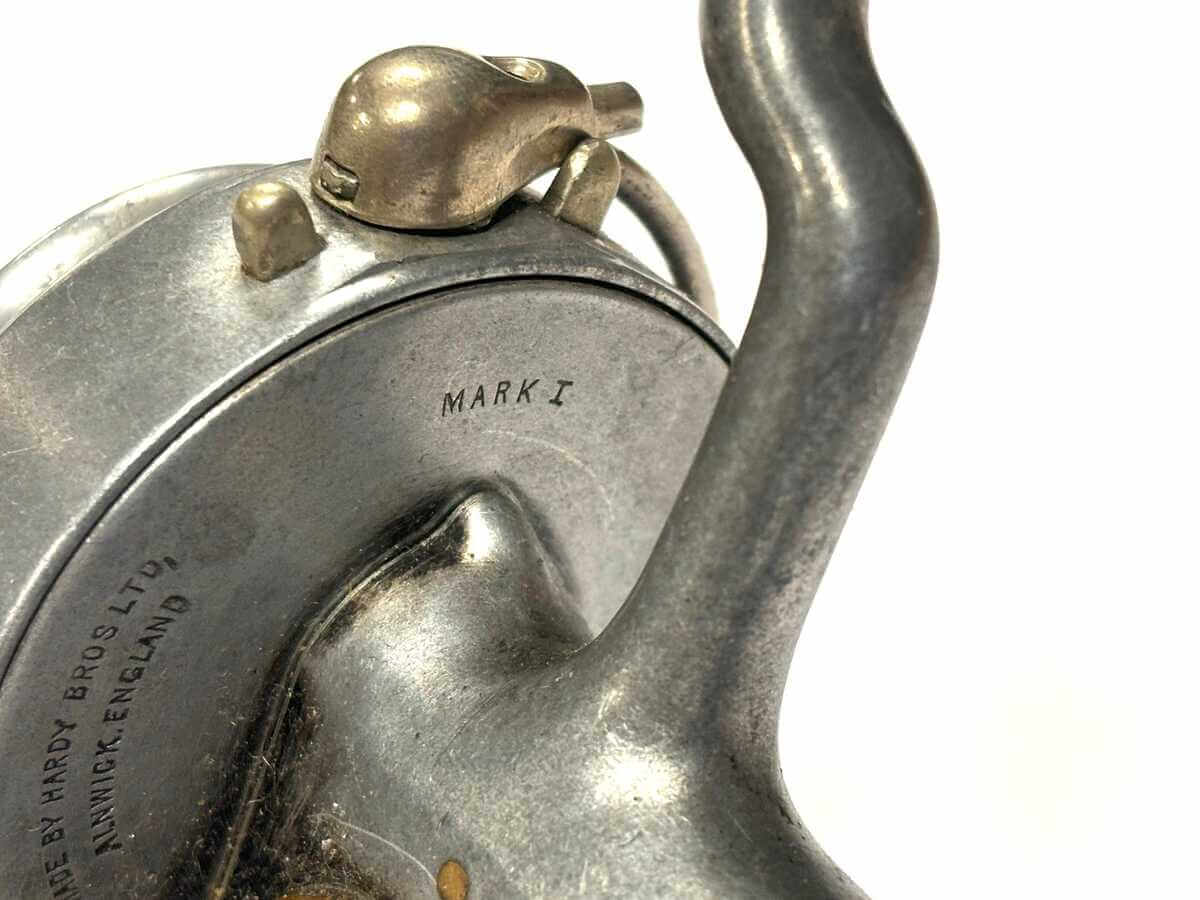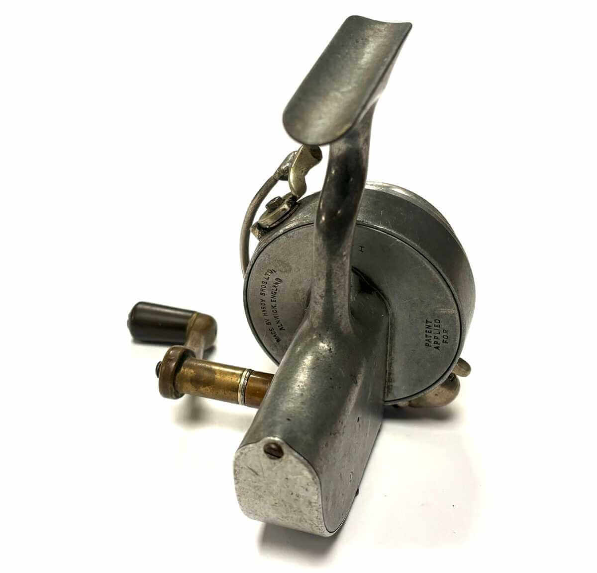 Here we have a fine and very rare Hardy Altex ‘Ducks Foot Upturned’ fixed spool reel. The upturn foot is believed to be earlier than the down turn foot model making this around 1932. The reel is in excellent original condition with fixed stationary handle, fully working snap back alloy bail arm and stamped with ‘PATENT APPLIED FOR’, ‘MARK I’ and Hardy details. These reels do not appear that often. Extremely rare.