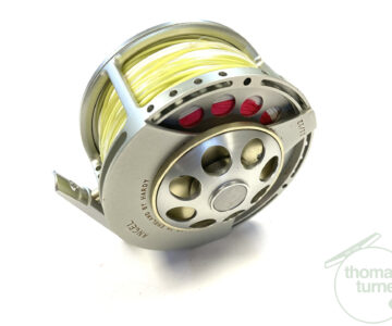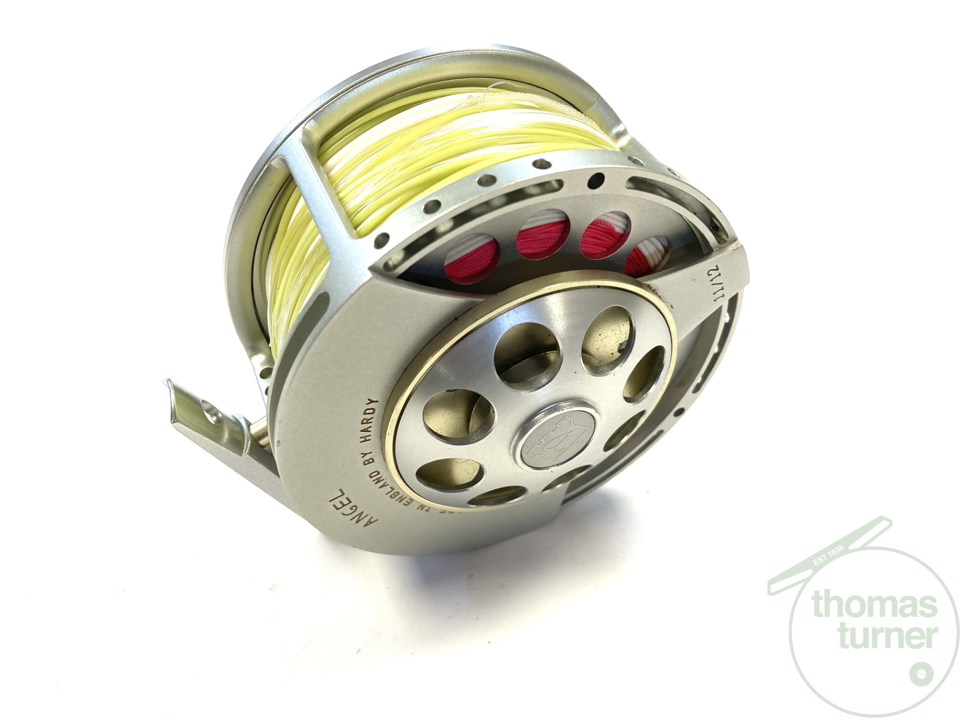 From a very large collection of Hardy reels just in, this large salmon size hardy Angel 10/11 reel, all alloy construction and numbered A39346. The reel is in very good overall condition. Perforated front plate with three screw drum release. This one has miles of thick floating Hardy line. A classic reel that are becoming harder to find with large pouch.