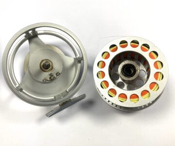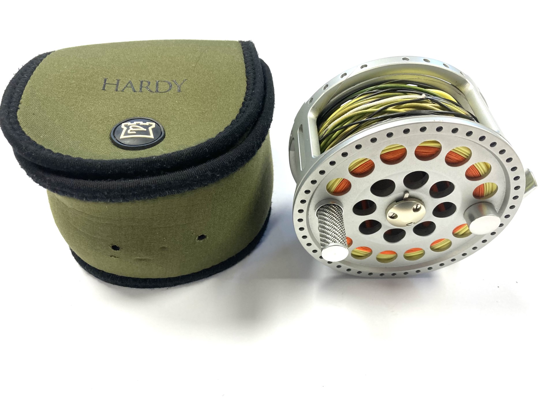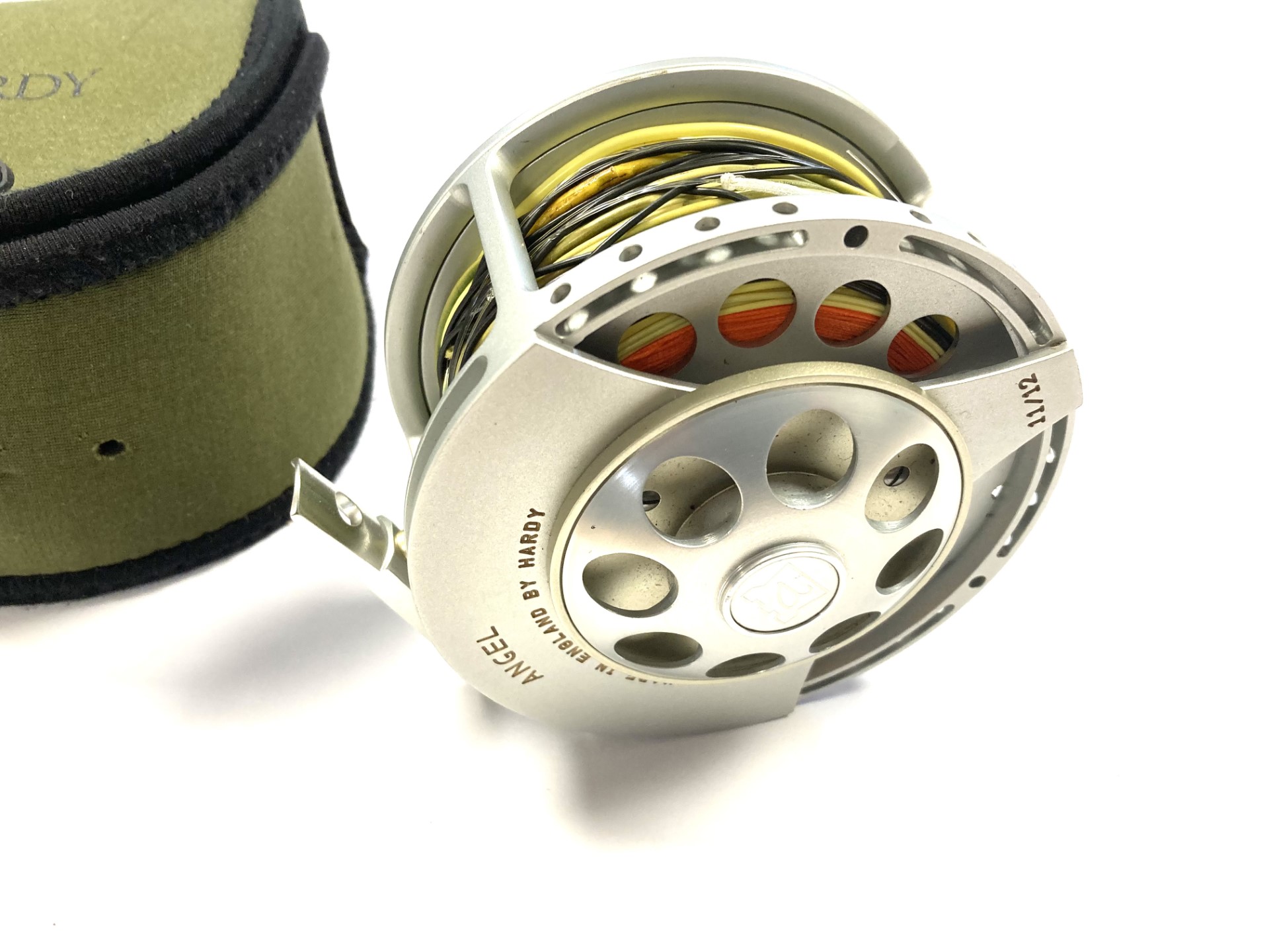 From a very large collection of Hardy reels just in, this large salmon size hardy Angel 10/11 reel, all alloy construction and numbered A39346. The reel is in very good overall condition. Perforated front plate with three screw drum release. This one has miles of thick floating Hardy line. A classic reel that are becoming harder to find with large pouch.