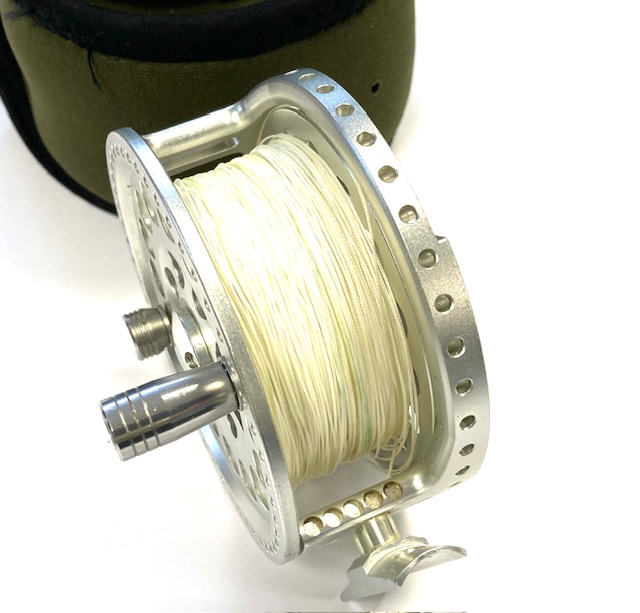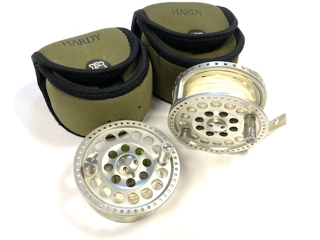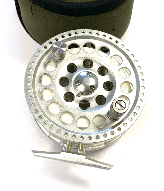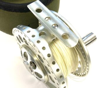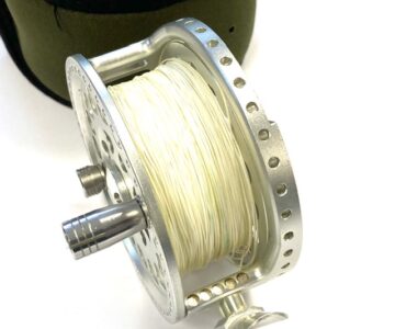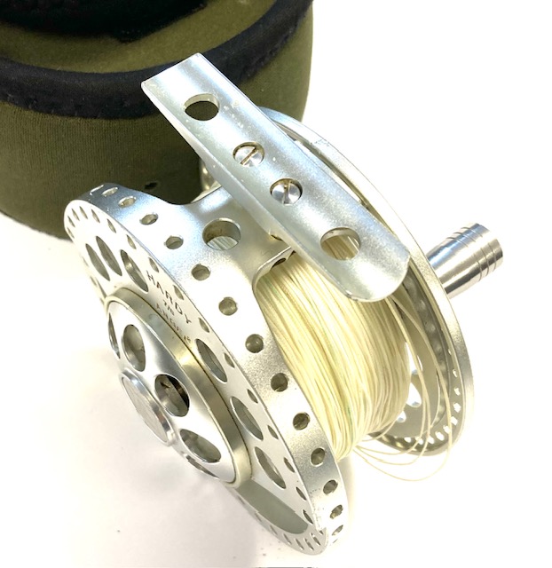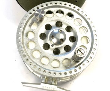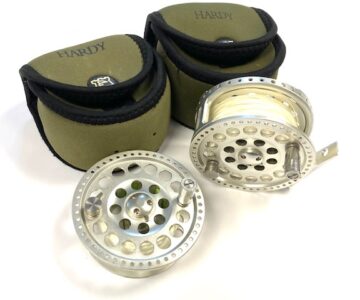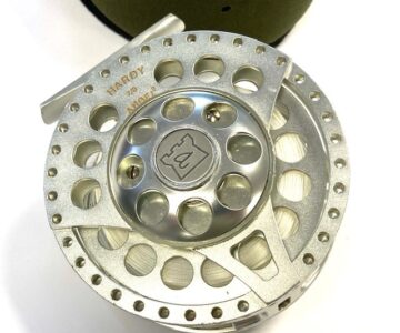 TT opinion: A lovely Hardy Angel-2 7/8 large arbour fly reel in as excellent condition, it has seen very little use. 3.5″ diameter and 40mm wide across the frame. Large rear drag adjuster, low noise check clicker. The reel can be fished left or right-hand wind. It comes with spare spool and two Hardy soft neoprene reel cases.