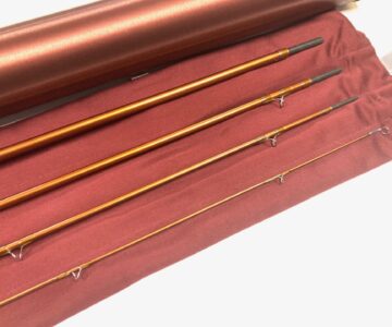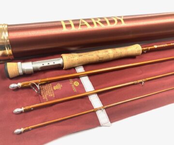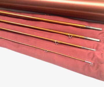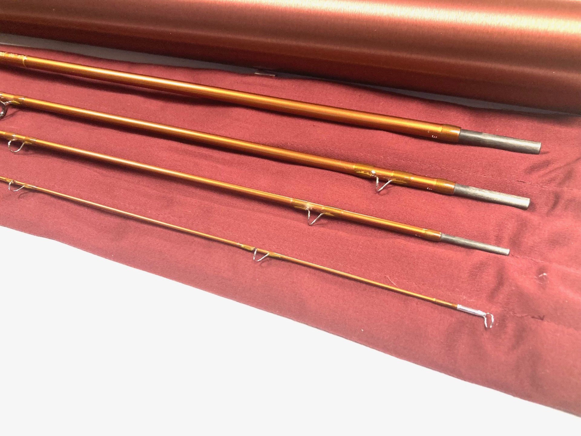 Notes: A super quality rod in fine pre-owned condition. Copper finish blank with lined butt and stripper rings, polished ferrule stoppers. 7” cork handle. Alloy machine cut reel seat. High quality travel trout fly rod in makers original cloth bag and Hardy Cordura zip top tube.