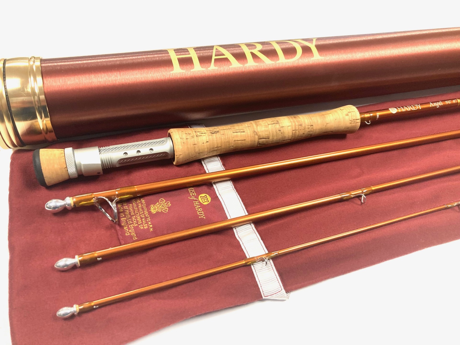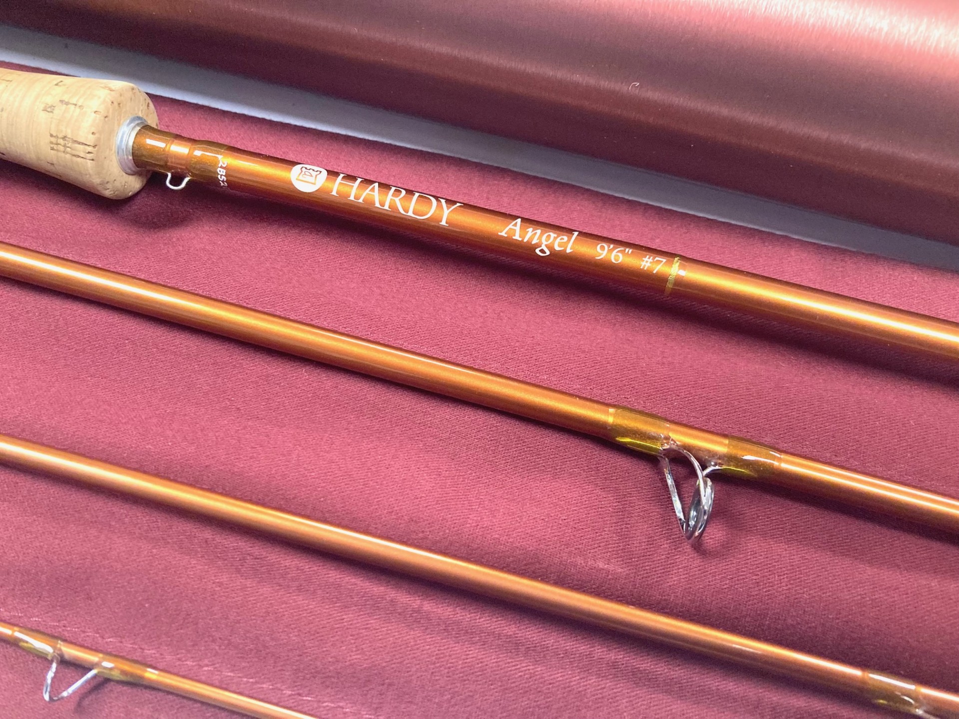Hardy Angel 9’ 6″ four piece carbon travel fly rod #7, fine with bag and alloy Hardy tube