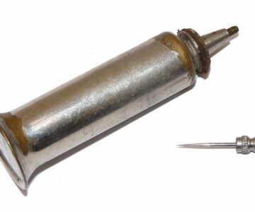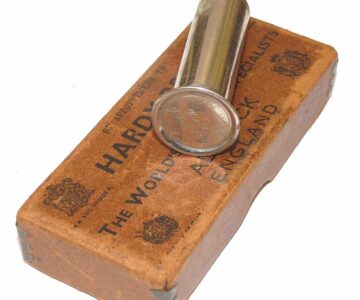 TT opinion: A scarce Hardy nickle on brass reel oiler, Standing 3.25″ tall, with screw removable pin to top. The Base stamped Hardy’s Fishing tackle, Made in England. It is factory original, with some plating loss as usual, and comes with an early Hardy card box making great display pieces