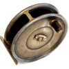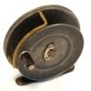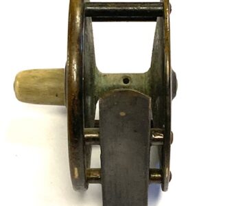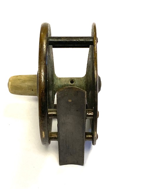 TT opinion: A nice little Hardy brass Birmingham reel with good strong constant check, tapered horn handle and brass foot. Rod in hand and enclosed oval logos to face plate. Turns fine with no stiffness.