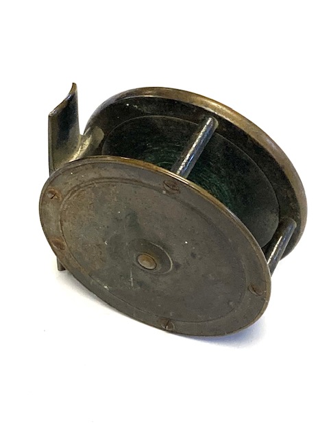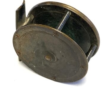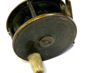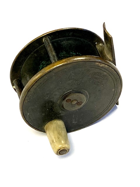 Hardy Brass Birmingham 2.75″ fly reel with rod in hand