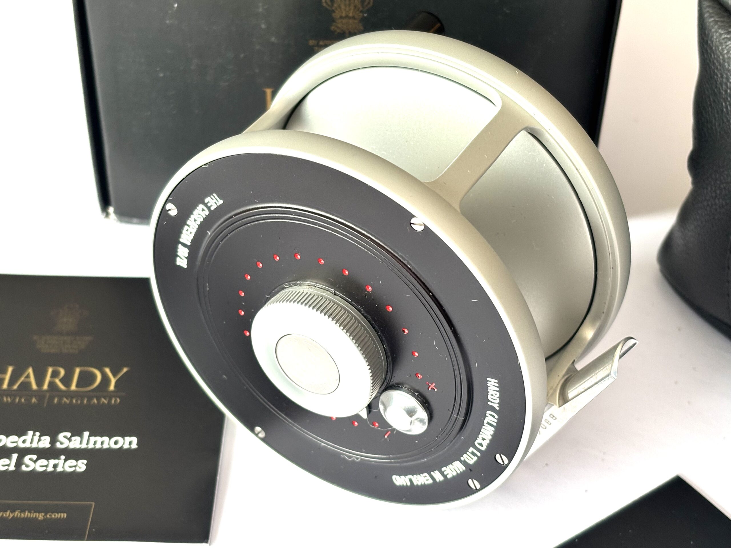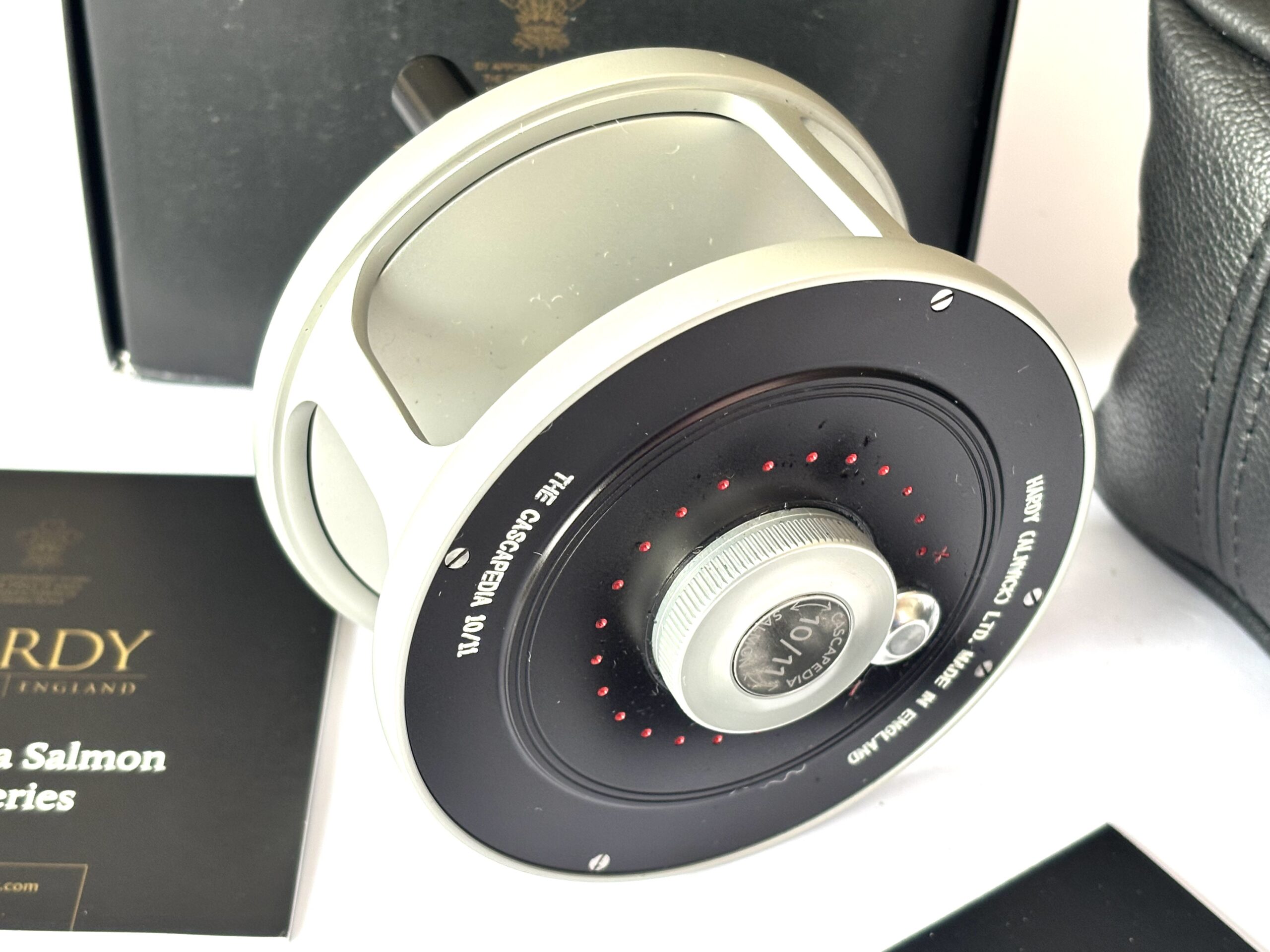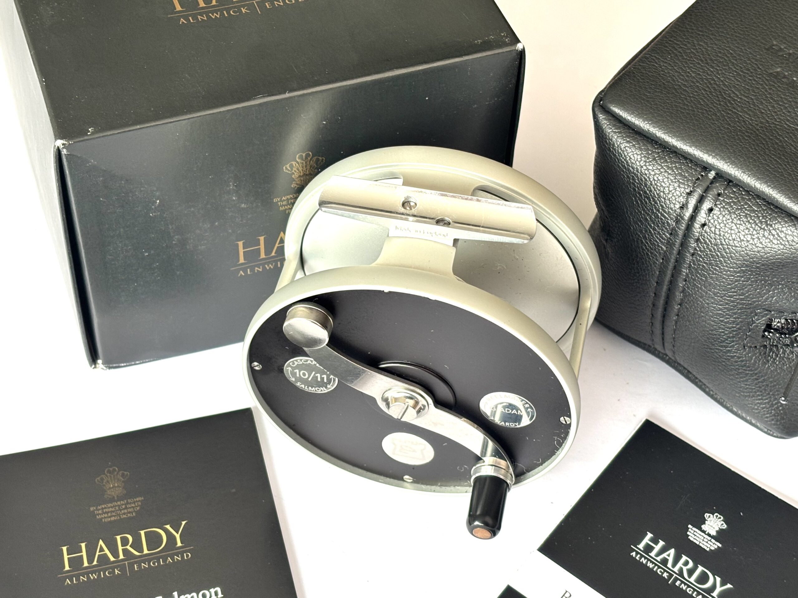 Just arrived — this mint Hardy Cascapedia salmon fly reel, built by G. Adam, can be fished left or right-hand wind and features an adjustable disc brake, counterbalance, and black handle with three polished Hardy discs to the faceplate. A stunning reel complete with original paperwork, Hardy woollen pouch, and outer box.