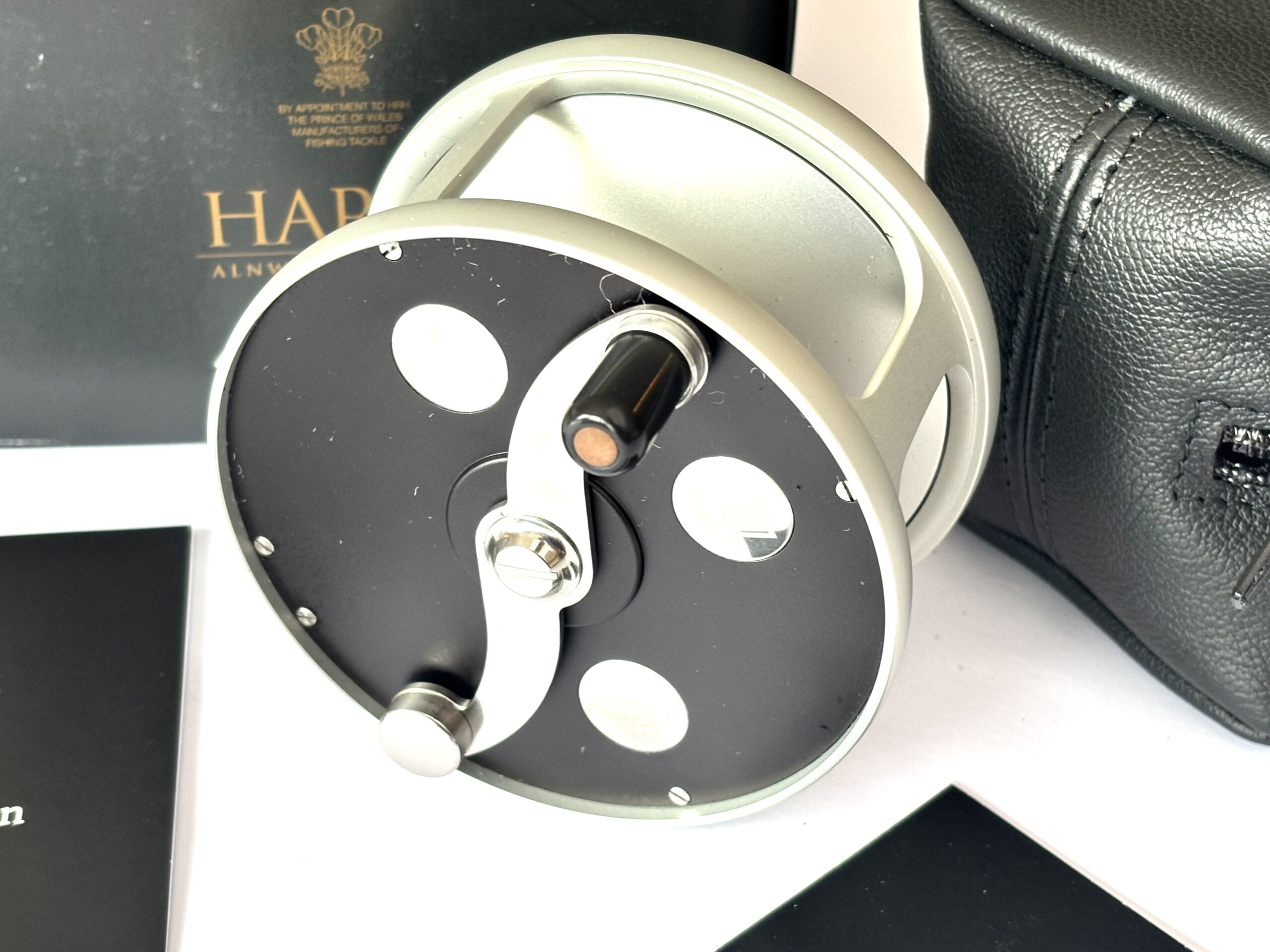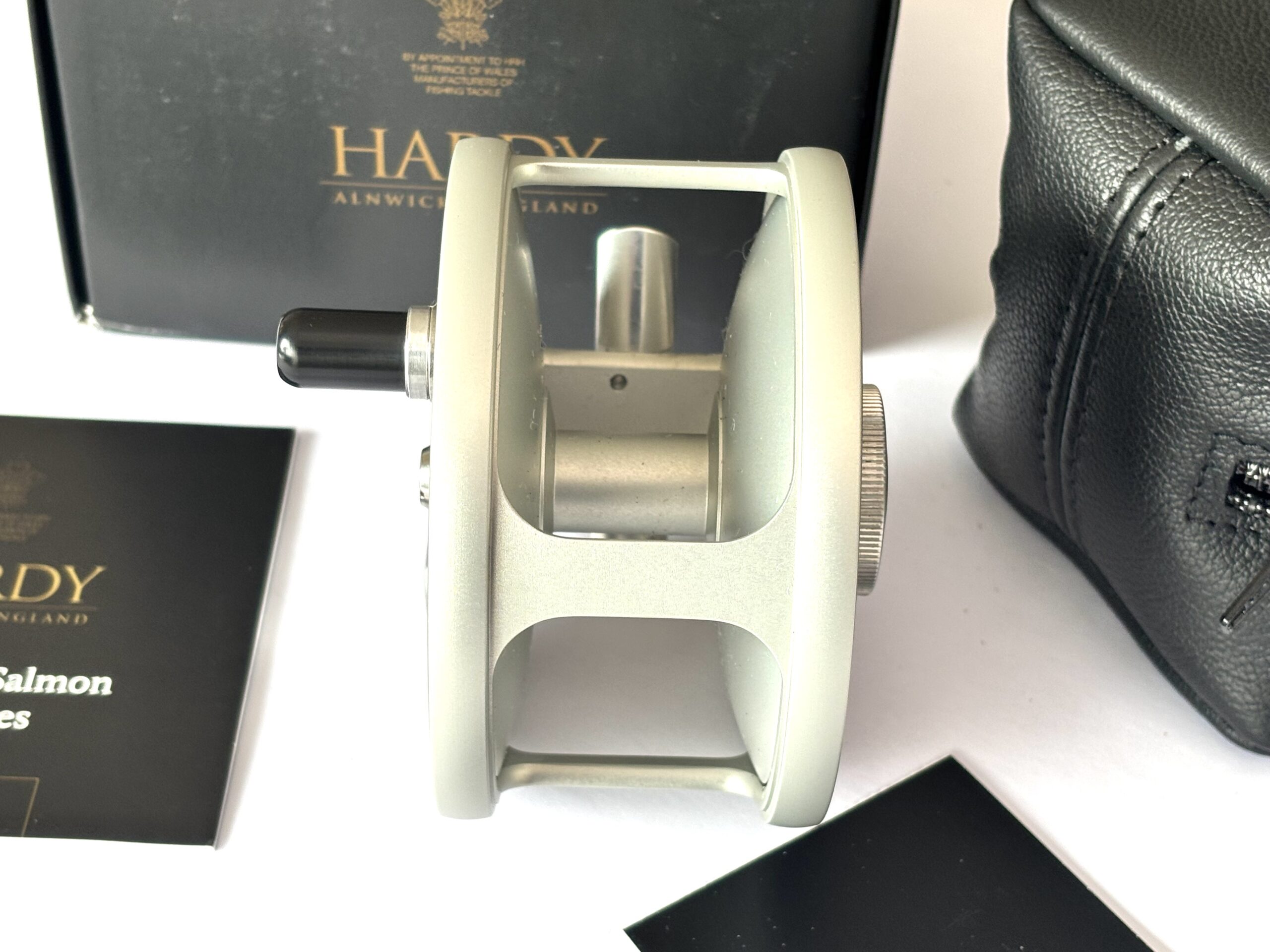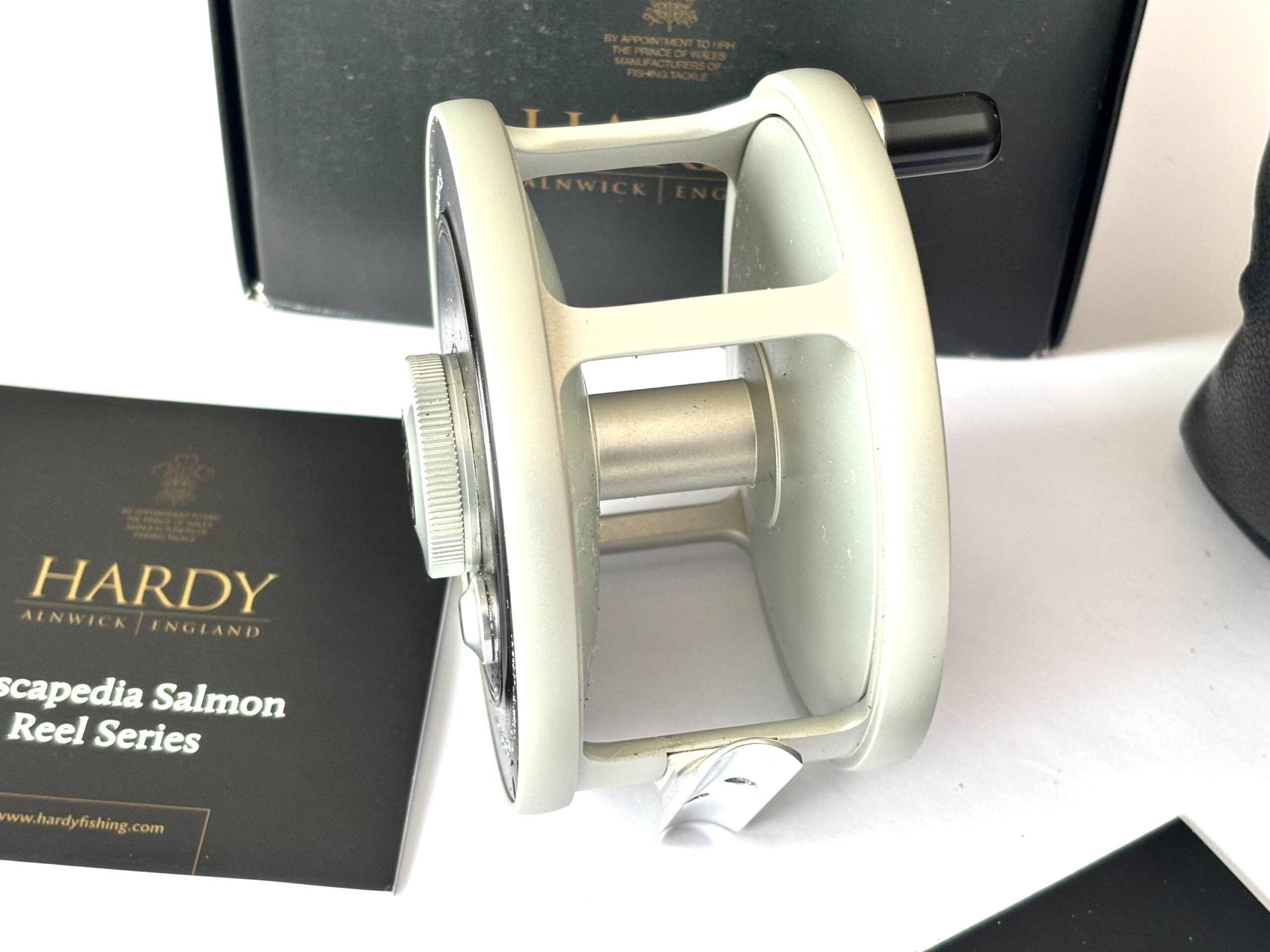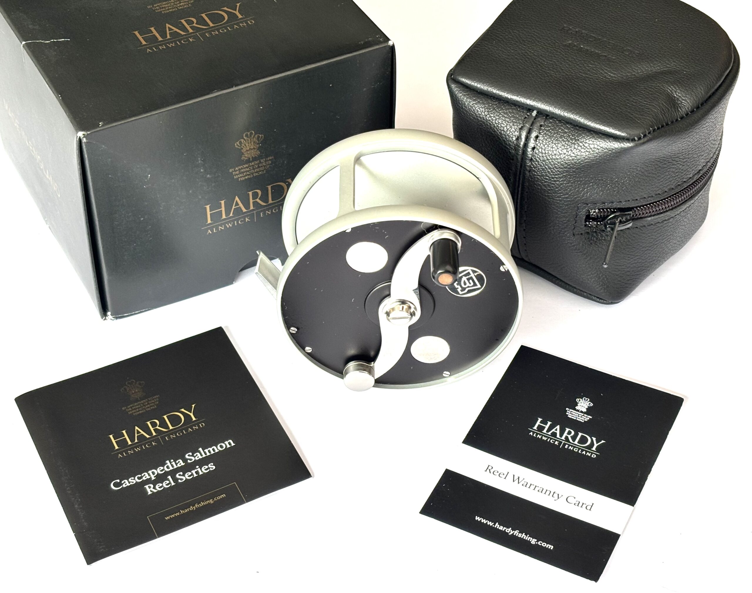 Just arrived — this mint Hardy Cascapedia salmon fly reel, built by G. Adam, can be fished left or right-hand wind and features an adjustable disc brake, counterbalance, and black handle with three polished Hardy discs to the faceplate. A stunning reel complete with original paperwork, Hardy woollen pouch, and outer box.