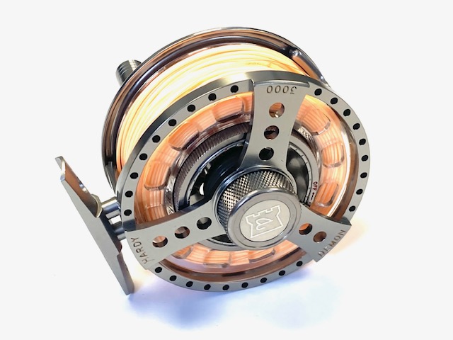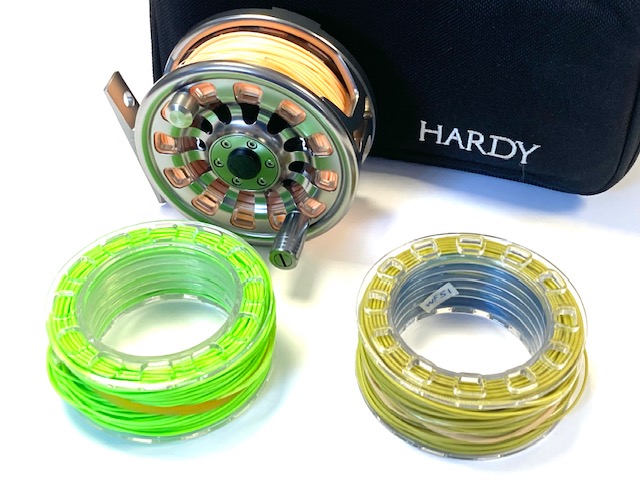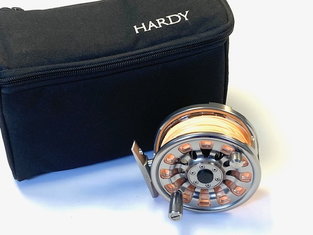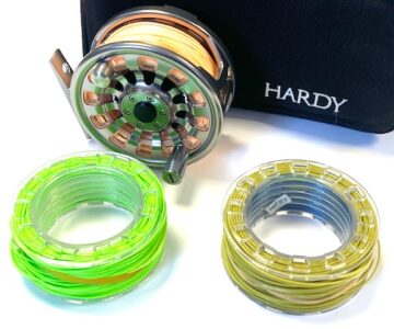 TT opinion: A very nice Hardy Demon 3000 large arbor fly reel in fine condition, foot stamp J23039. 3.25″ diameter, rear drag adjustor, low noise check clicker. Comes with 2 spare cassettes all with line, and makers padded case. A great set up ready to fish!