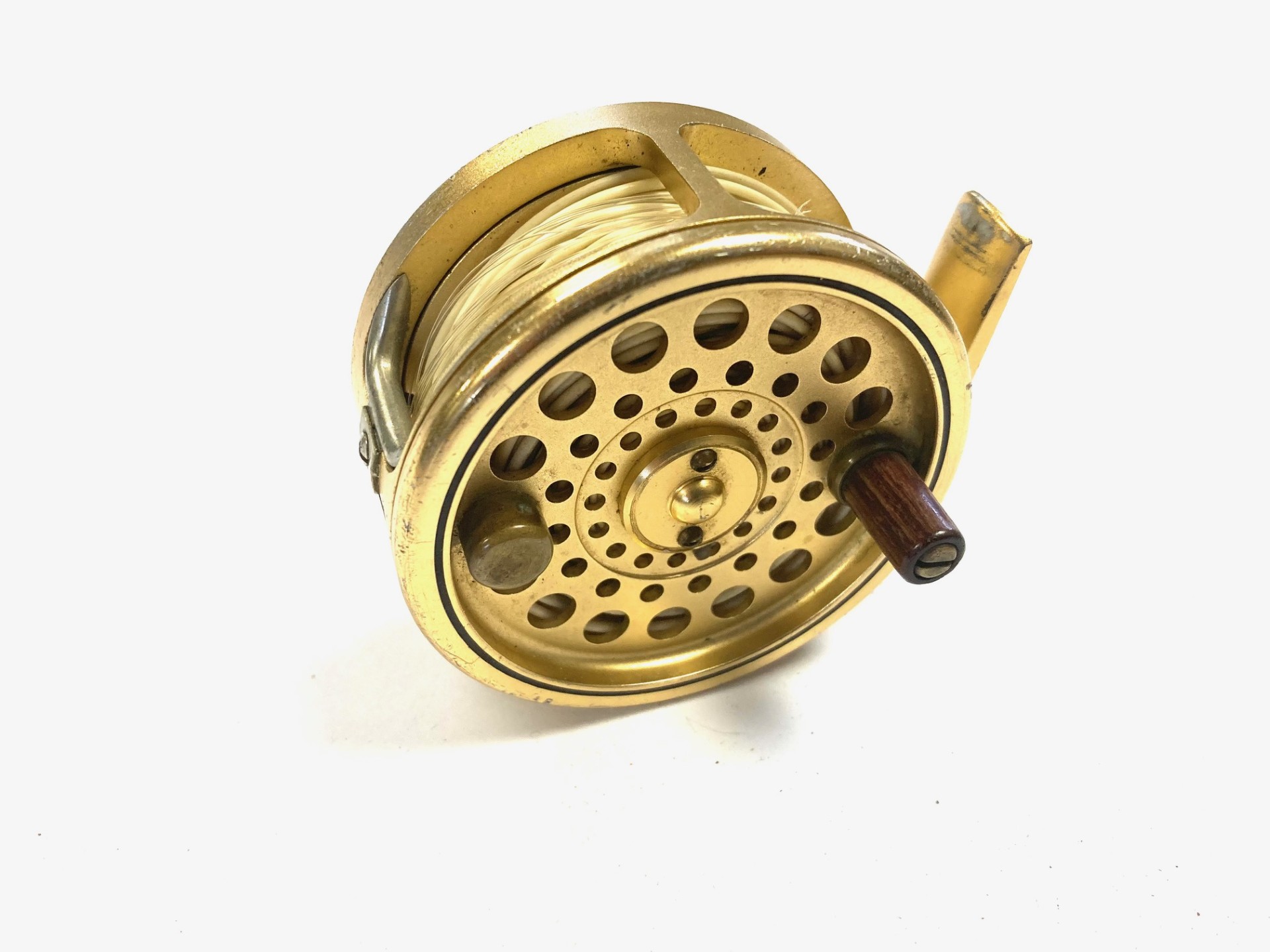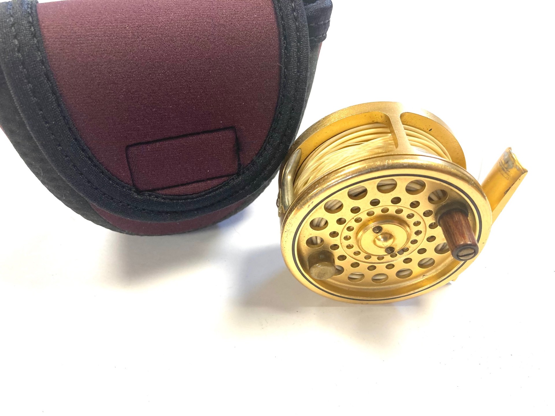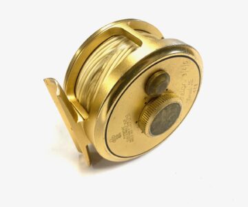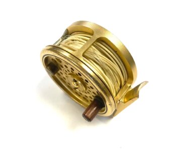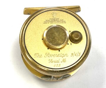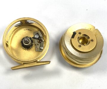 TT opinion: A very good Hardy Sovereign in the super small 2.75″ size with two screw latch, counter balance opposite handle, disc tensioner to rear plate and U shaped removable line guard so can be fished right or left hand wind. Over all a very good used reel in perfect working order and ready to fish with purple Hardy pouch.