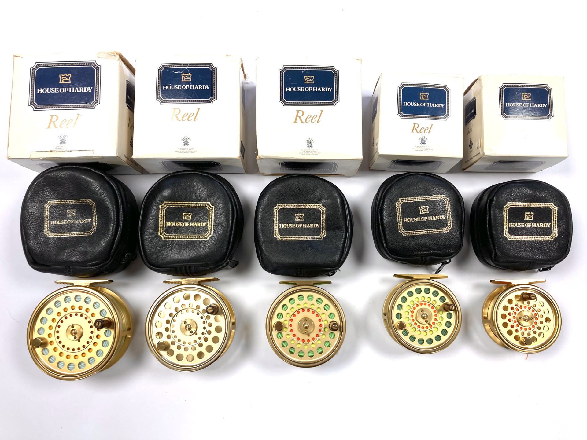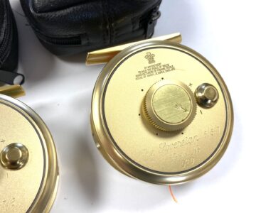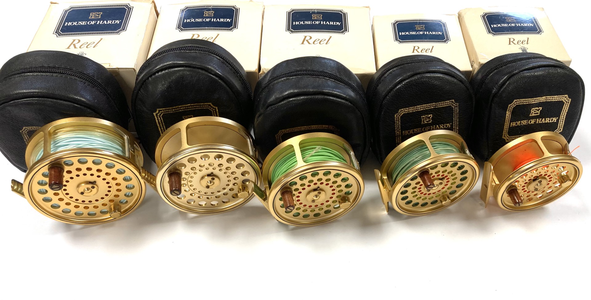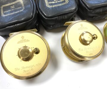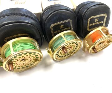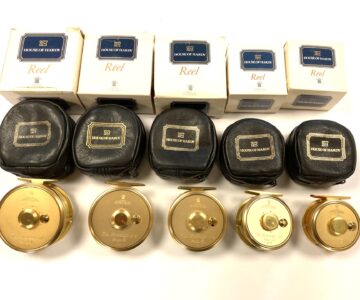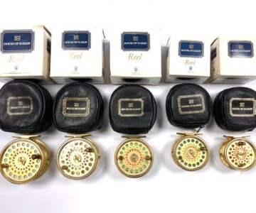 Just arrived as part of a large 60+ Hardy reel collection, this super set of 5 Hardy Gold Sovereign reels. Limited edition, all numbered 070. These gold Hardy Sovereigns are in in lovely condition with tapered wood slim wood handle with counter balance opposite, with perforated face and brass foot complete with Hardy black woolen zip reel case and their original Hardy cardboard boxes. Ready to fish or collect.