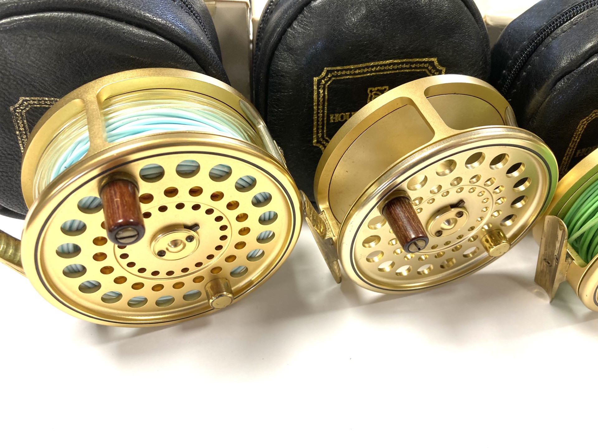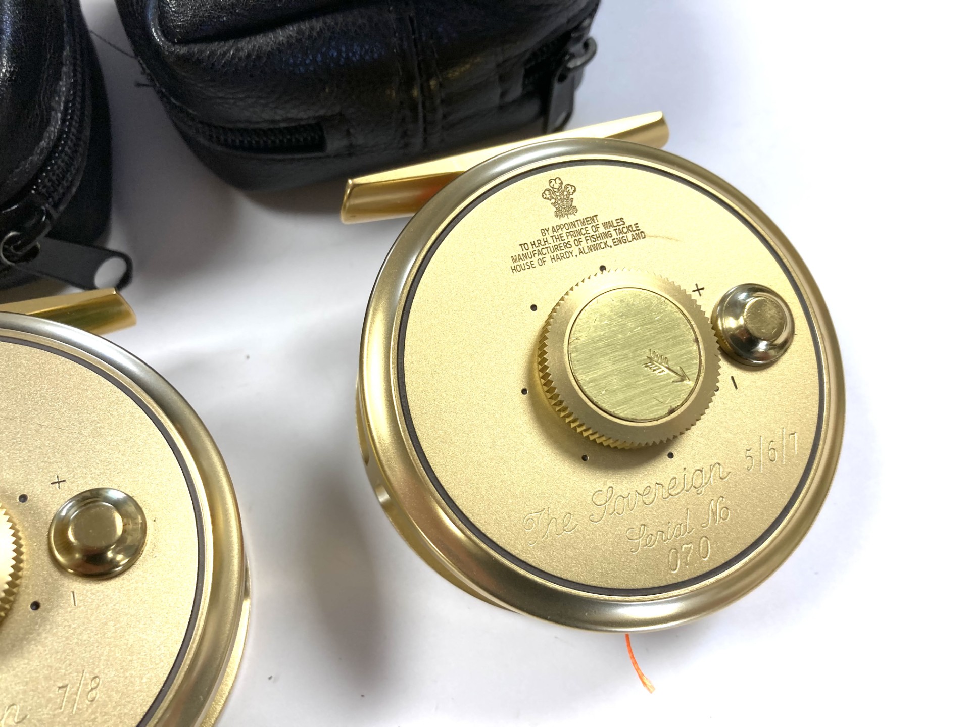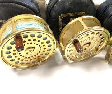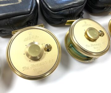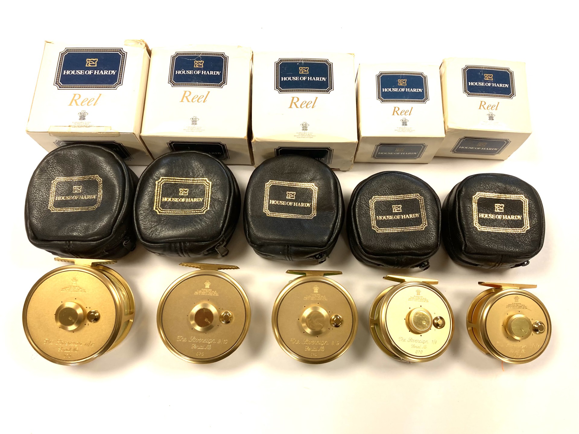 Just arrived as part of a large 60+ Hardy reel collection, this super set of 5 Hardy Gold Sovereign reels. Limited edition, all numbered 070. These gold Hardy Sovereigns are in in lovely condition with tapered wood slim wood handle with counter balance opposite, with perforated face and brass foot complete with Hardy black woolen zip reel case and their original Hardy cardboard boxes. Ready to fish or collect.