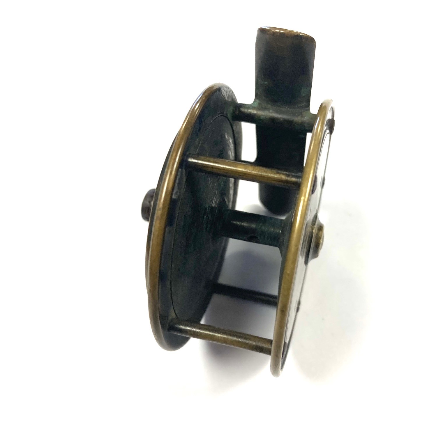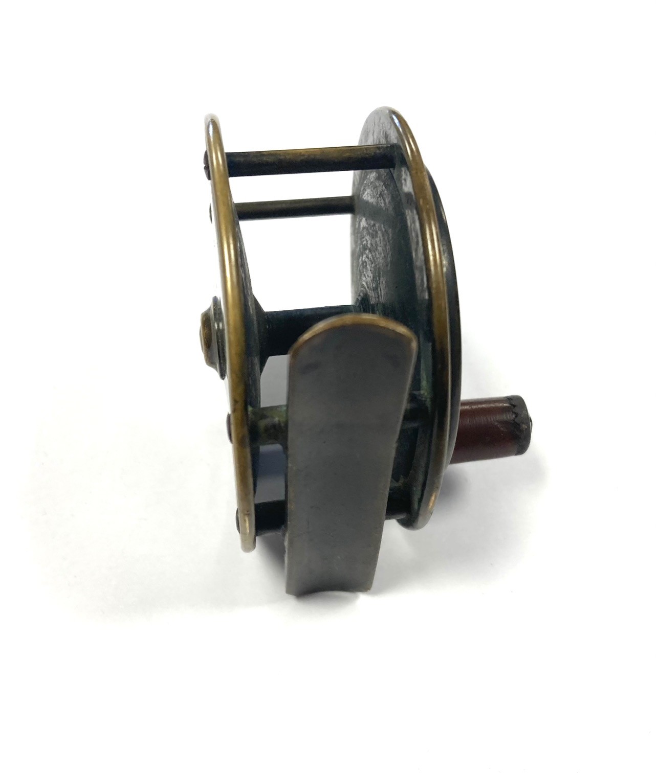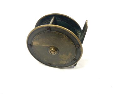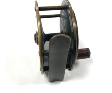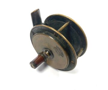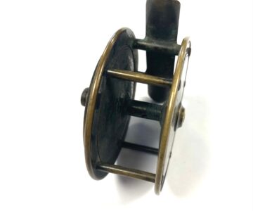 TT opinion: Here we have a tiny Hardy all brass 2/5″ trout fly fishing reel with raised check housing with enclosed oval logo. The handle has been replaced we think but is mounted correctly and spins as it should. Straight brass foot and good constant check mechanism. Circa 1895.