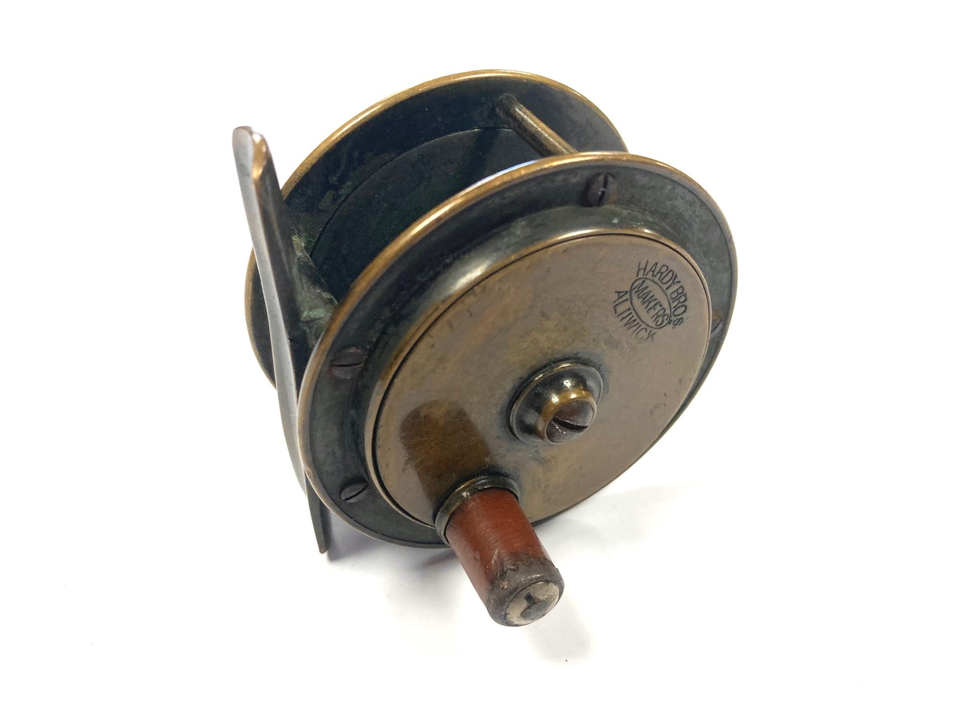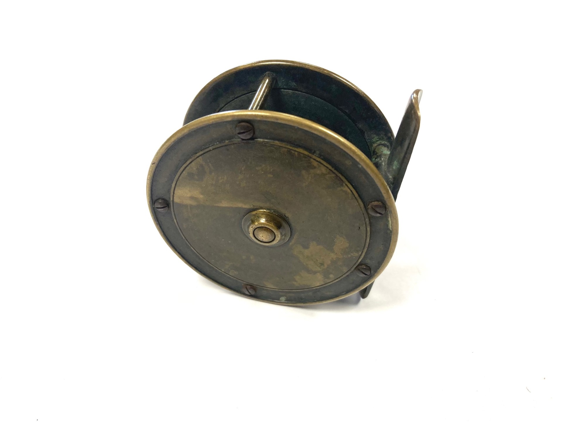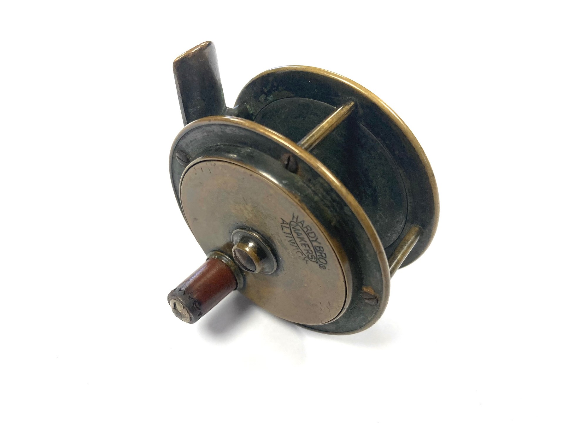 TT opinion: Here we have a tiny Hardy all brass 2/5″ trout fly fishing reel with raised check housing with enclosed oval logo. The handle has been replaced we think but is mounted correctly and spins as it should. Straight brass foot and good constant check mechanism. Circa 1895.