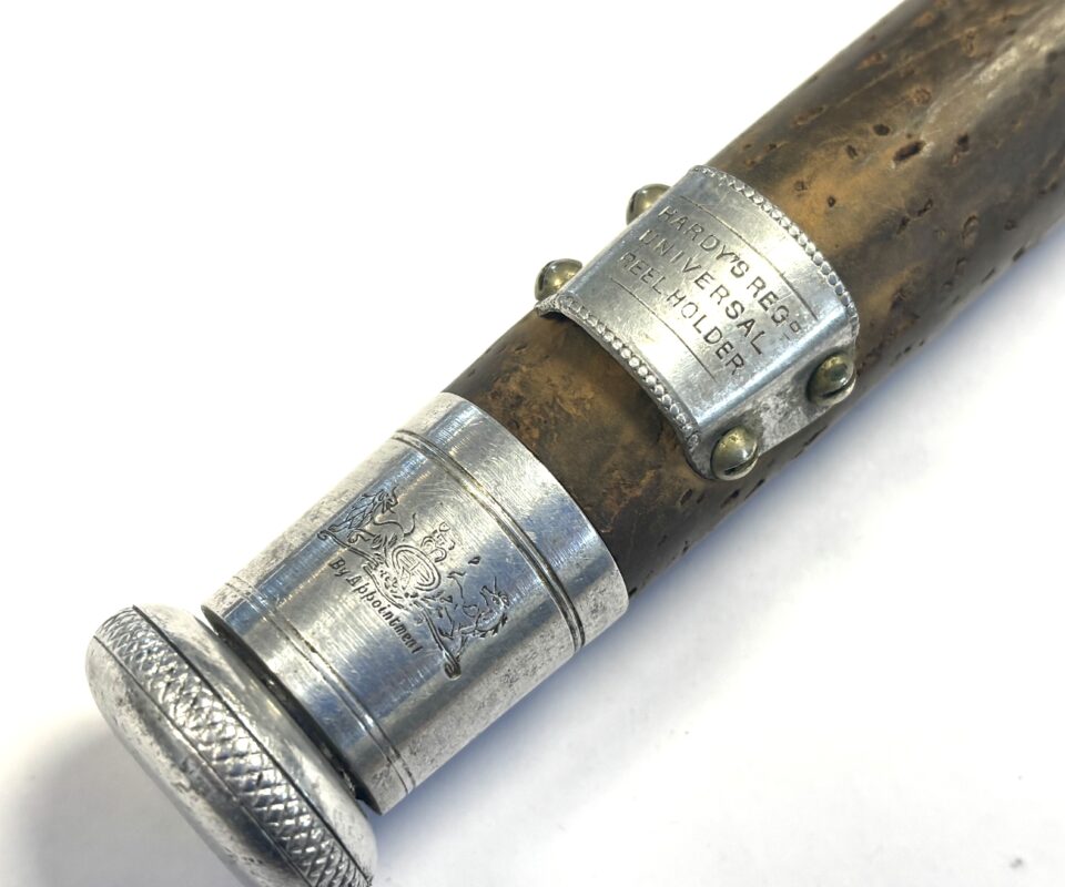 TT Opinion: Just arrived, this Hardy Houghton 10’ three-piece trout fly rod with spare tip. Green close whipped with lined guides, dark stained cork handle with sliding brass reel fitting. Comes with original worn Hardy beige cloth bag.