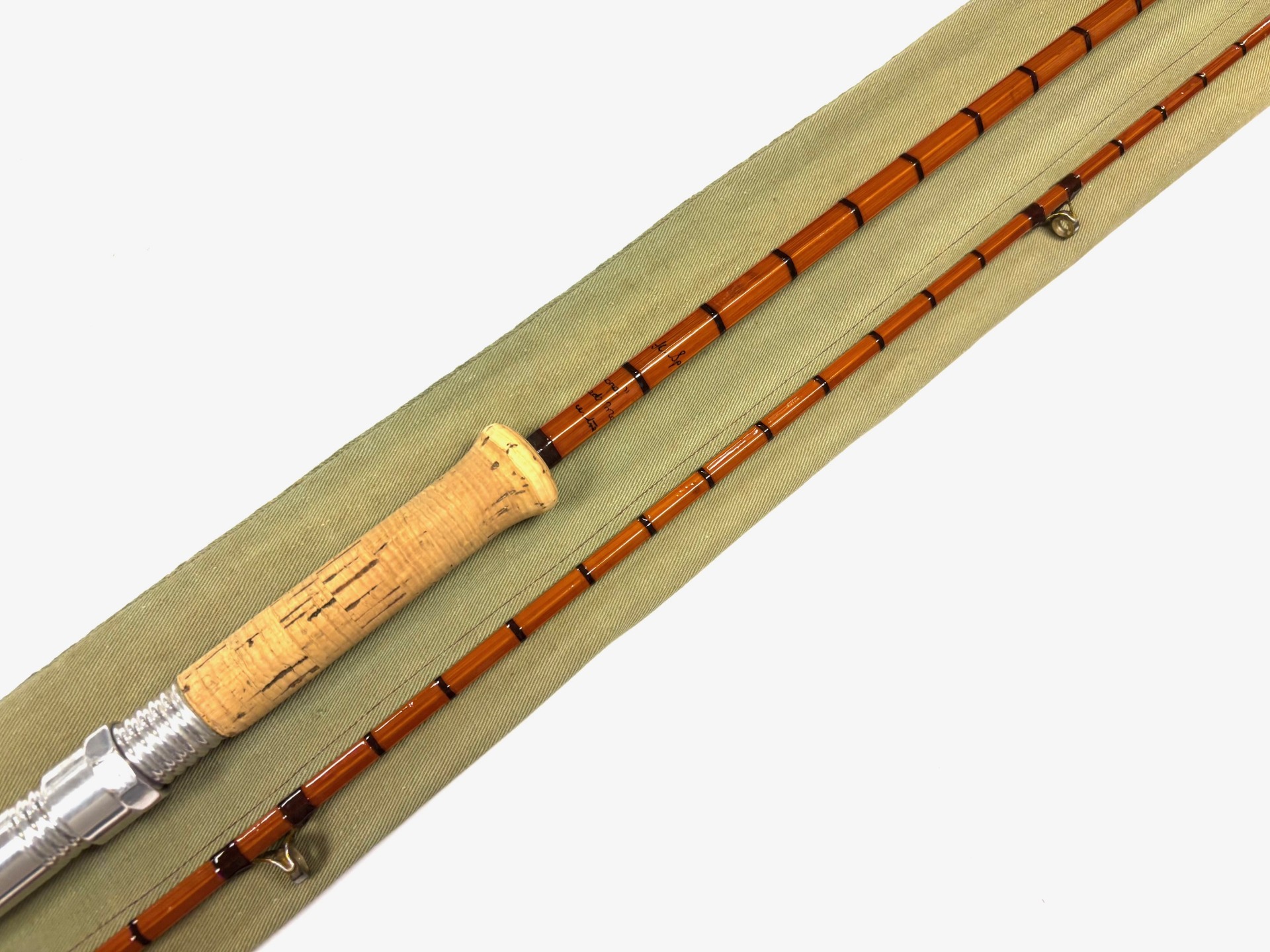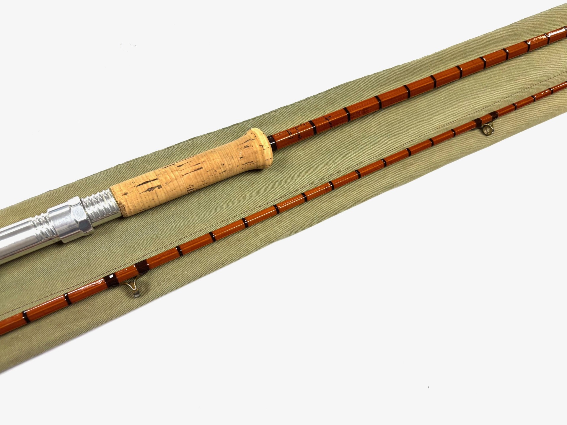 A rare Hardy JJH Spinning, 10’ 2 piece Palakona spinning rod, a light professional restoration, dark magenta whipped guides, bronze suction ferrule with stopper, with a 24” cork handle. Lovely rod, ready to fish, the cane is straight & the ferrule is good. Comes in maker’s original green cloth bag.