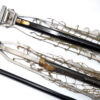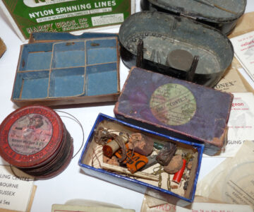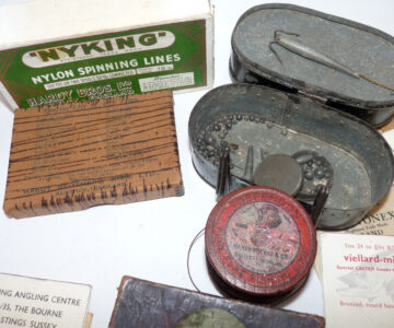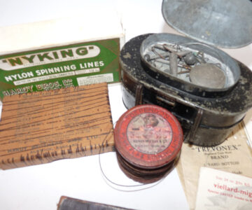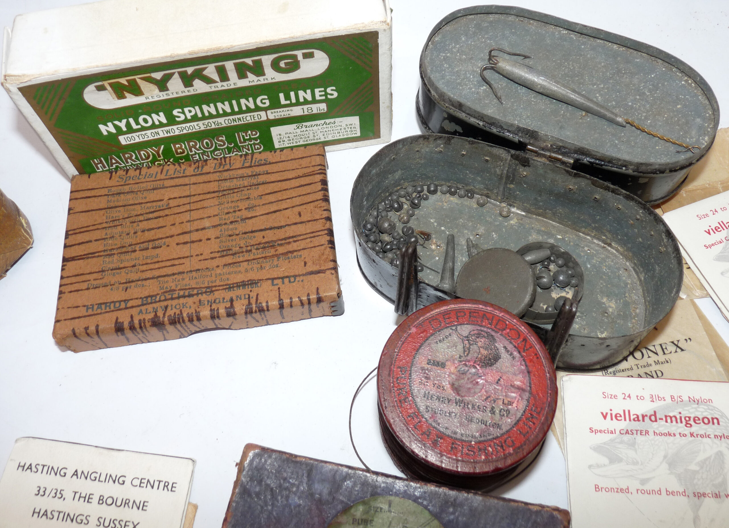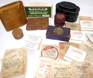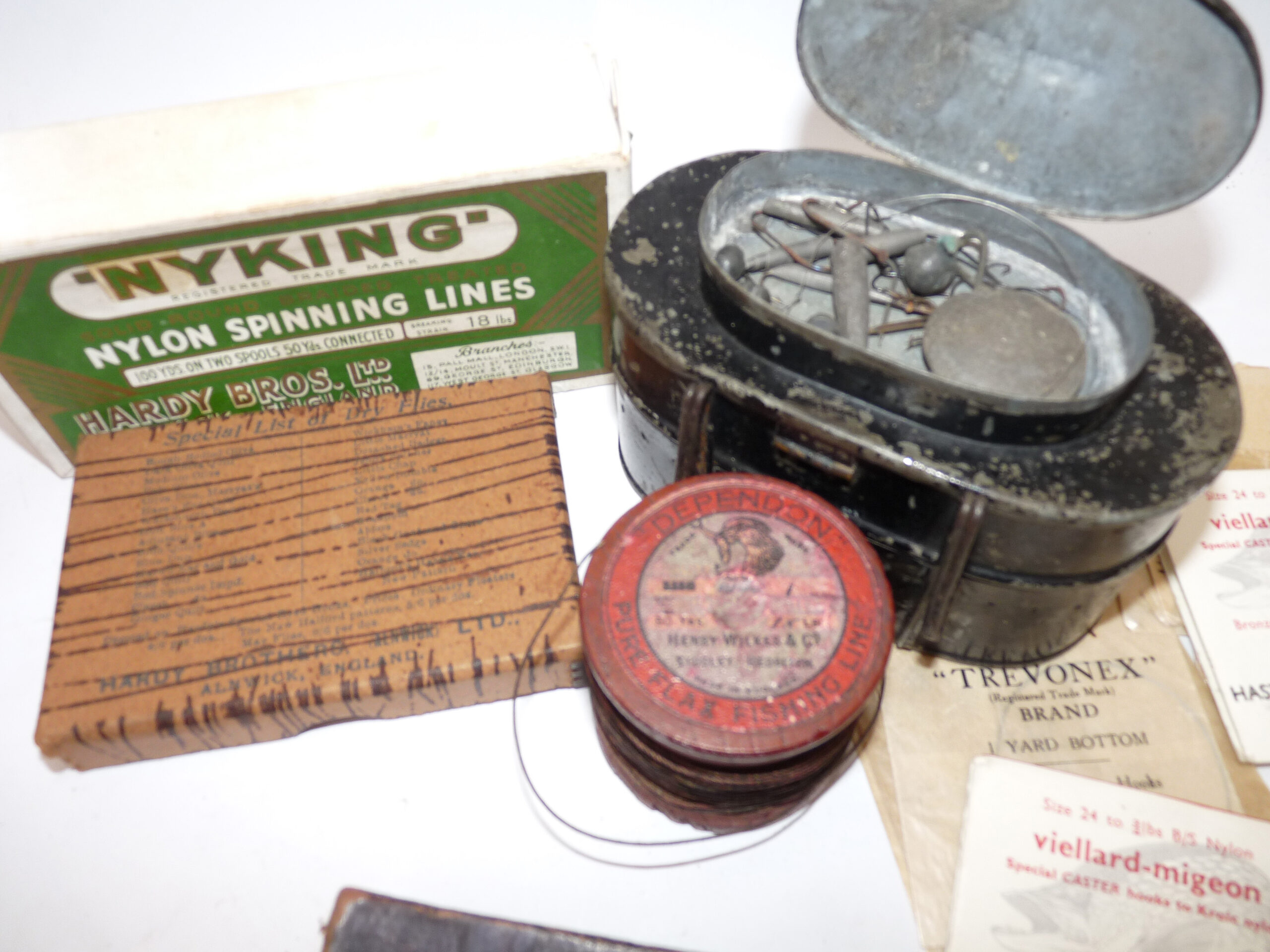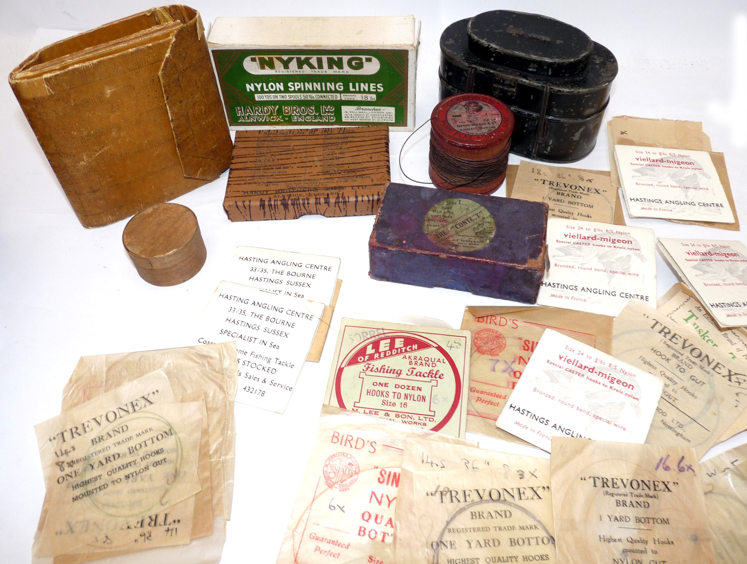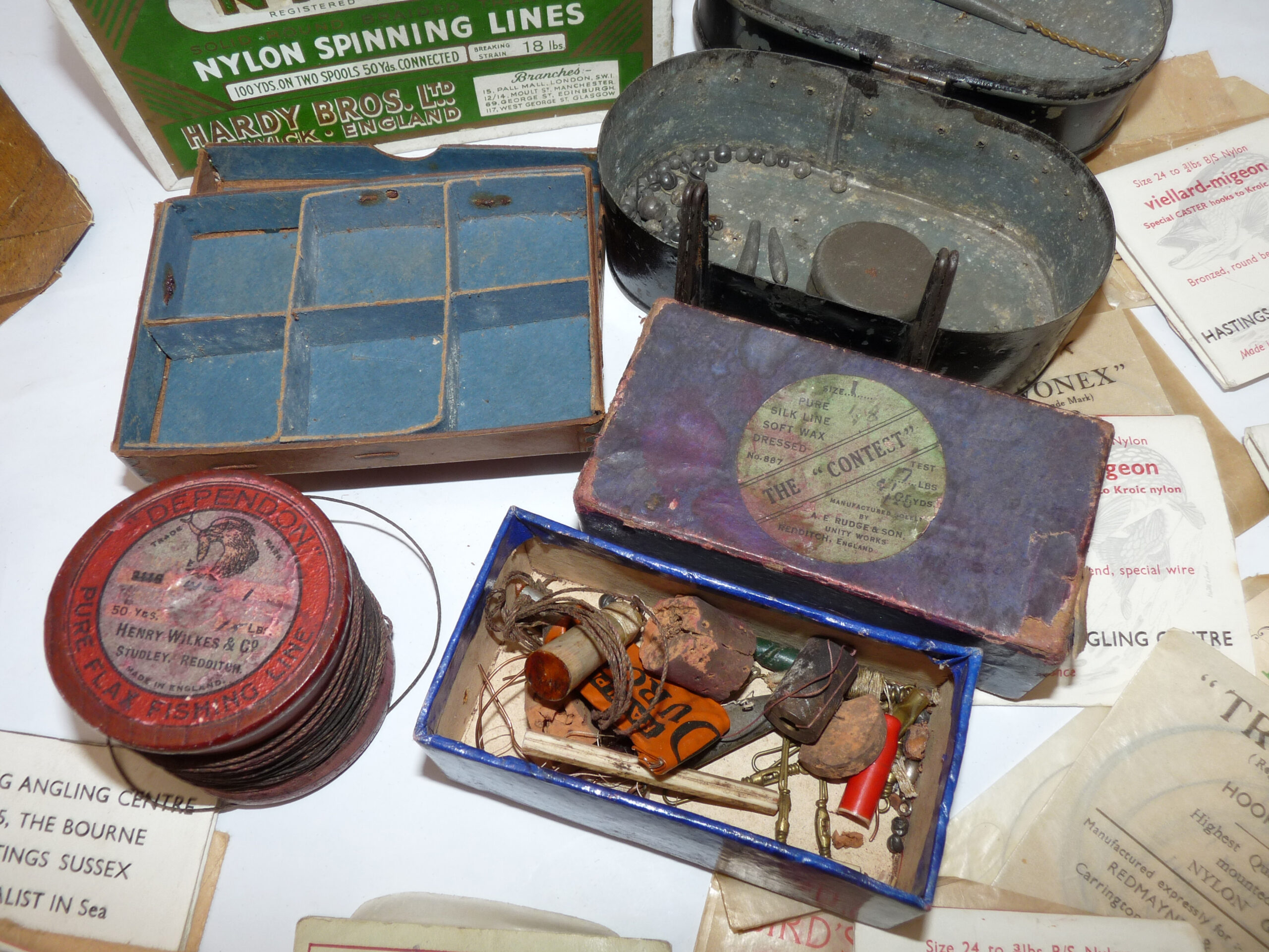 Interesting collection of antique & vintage tackle accessories including a Patent Applied For black japanned belt fitting tin, measuring 5” x 3” x 3”, with 2 hinged compartments holding an assortment of leads and an antique Gorge hooks, a Hardy Nyking empty line card box, Hardy Special dry fly card box, a Henry Wilkes of Redditch Dependon flax line on a wooden spool, with Otter trademark logo to rear, good quantity of assorted casts in packets by Trevonex, Viellard – Migeon, Birds & Lee of Redditch, all in an early card distressed pocket wallet. Good collectable display pieces for any tackle rod.