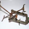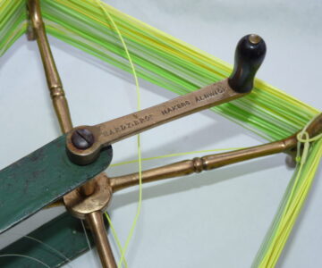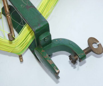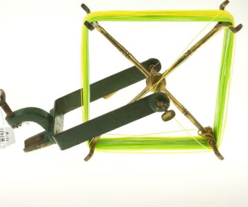 An antique and rare Hardy`s line winder. The cast-iron frame with brass mechanism and the arms are numbered 1 – 4. It can be secured to a table by way of a clamp on the base. This is the 1897 model with original green paint. Line winders were an important tool in the days of the silk line when one had to take the line off the reel for drying. It still has its use today for transferring the fishing line from one reel to another. Measuring at 10 ½ ” H x 13 ” W x 4 ½ “ D / 26 ½ cm H x 33 cm W x 11 ½ cm D.
