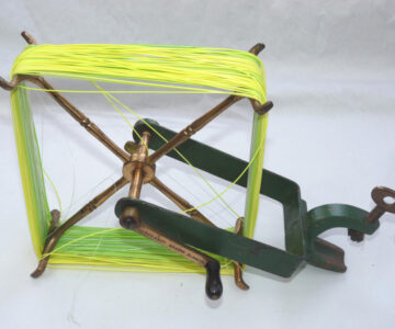 An antique and rare Hardy`s line winder. The cast-iron frame with brass mechanism and the arms are numbered 1 – 4. It can be secured to a table by way of a clamp on the base. This is the 1897 model with original green paint. Line winders were an important tool in the days of the silk line when one had to take the line off the reel for drying. It still has its use today for transferring the fishing line from one reel to another. Measuring at 10 ½ ” H x 13 ” W x 4 ½ “ D / 26 ½ cm H x 33 cm W x 11 ½ cm D.