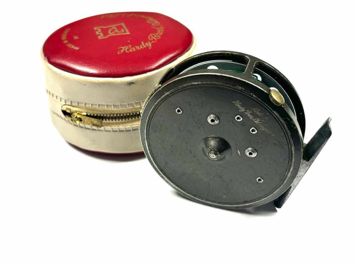 TT opinion: A good used Hardy LRH lightweight just arrived, with perforated front face, black handle and straight alloy foot, not filed. U shaped line guard and little side rim tensioner. Turns fine with constant check. Ready to fish complete with padded case.