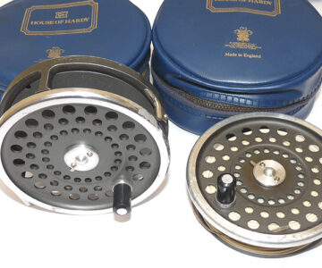 A classic Hardy fly reel in fine original condition. Black handle, 2 screw drum latch reversible U shaped line guide and internal metal check with backplate adjuster. The reel can be fished right or left-hand wind, retains good original finish, fully working reel, no faults. Comes with a spare spool and floating line plus two Hardy zip padded cases.