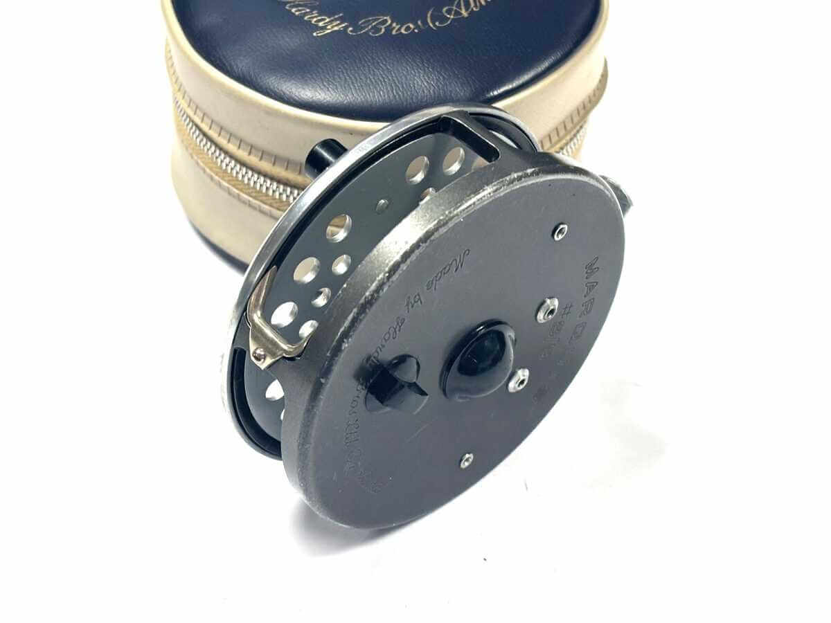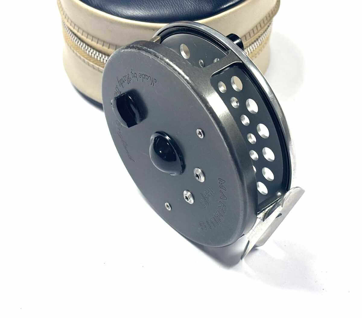 TT opinion: A very good Hardy Marquis trout fly fishing reel with perforated face plate, black handle, smooth alloy foot and U shaped line guard so can be fished right or left hand wind. Complete with case.