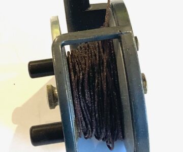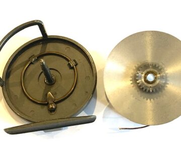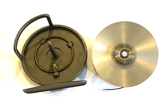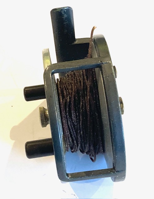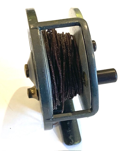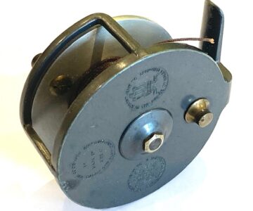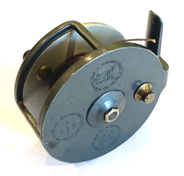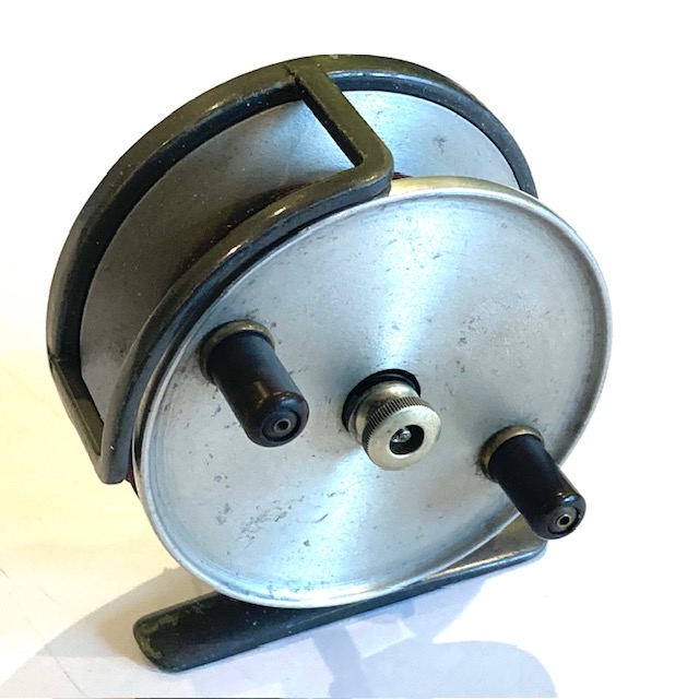 A very good alloy sea reel with twin ebonite tapered handles, brass central locking crew, line guide and brass on/off check button to rear plate.