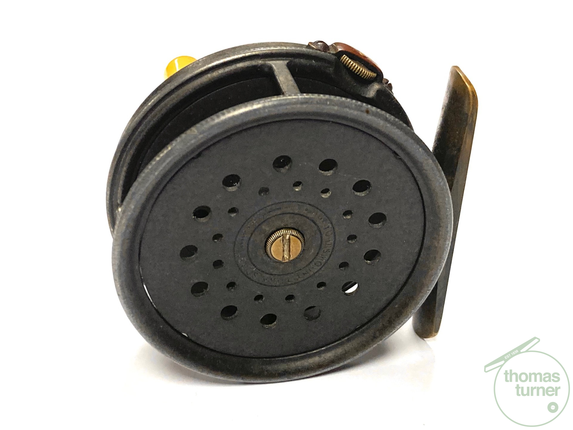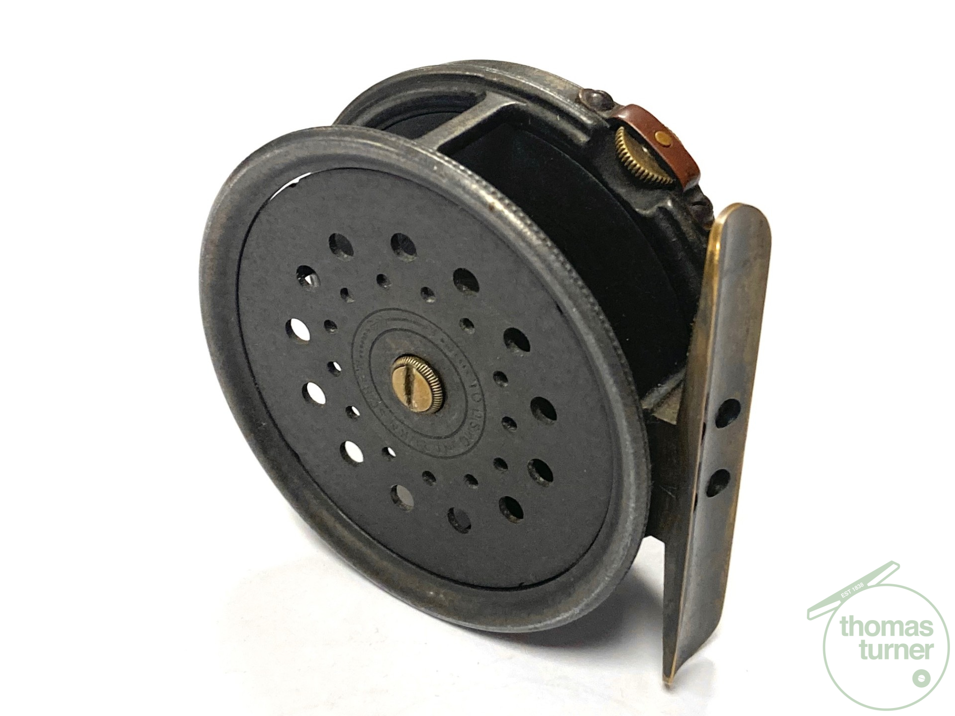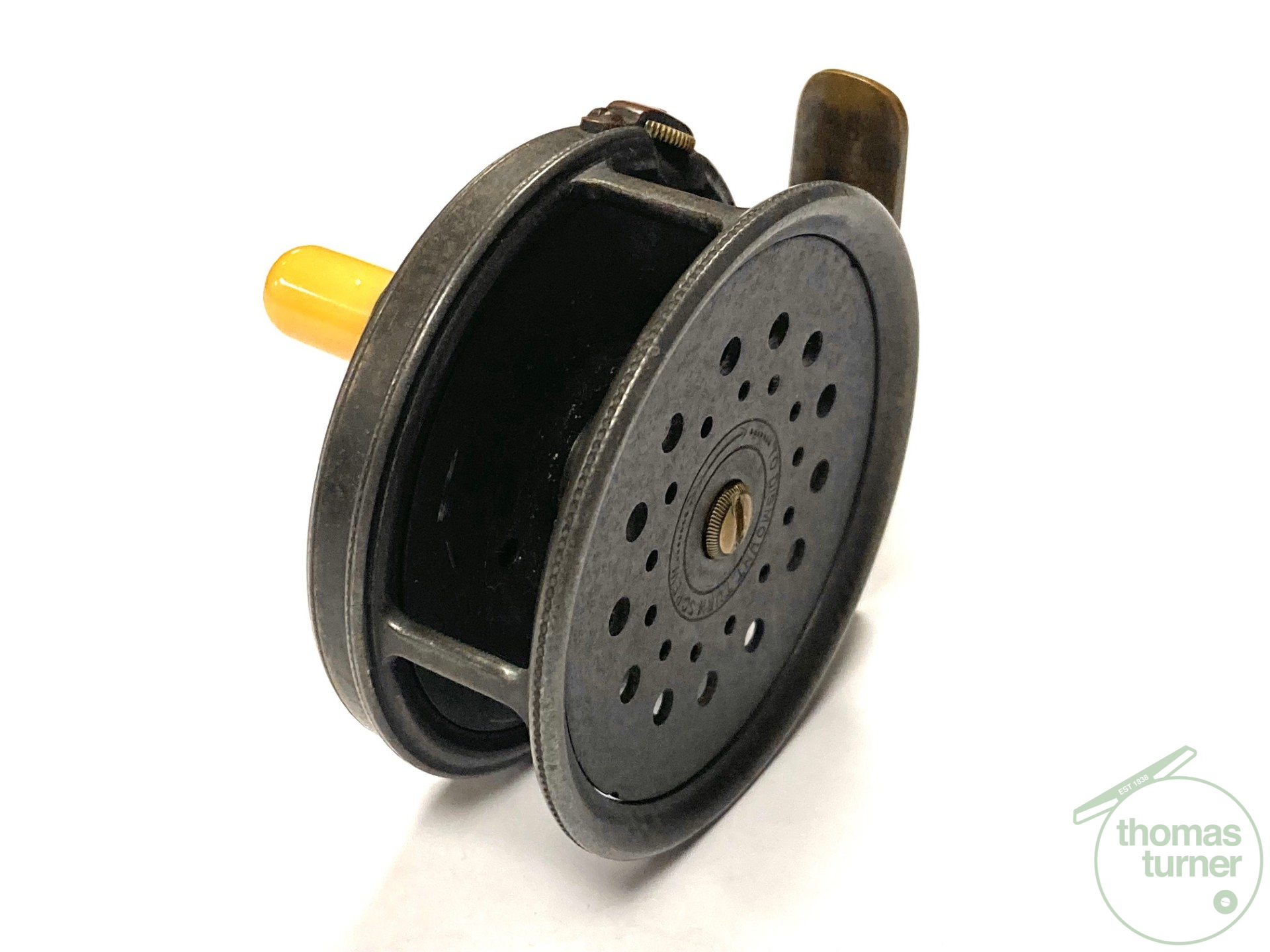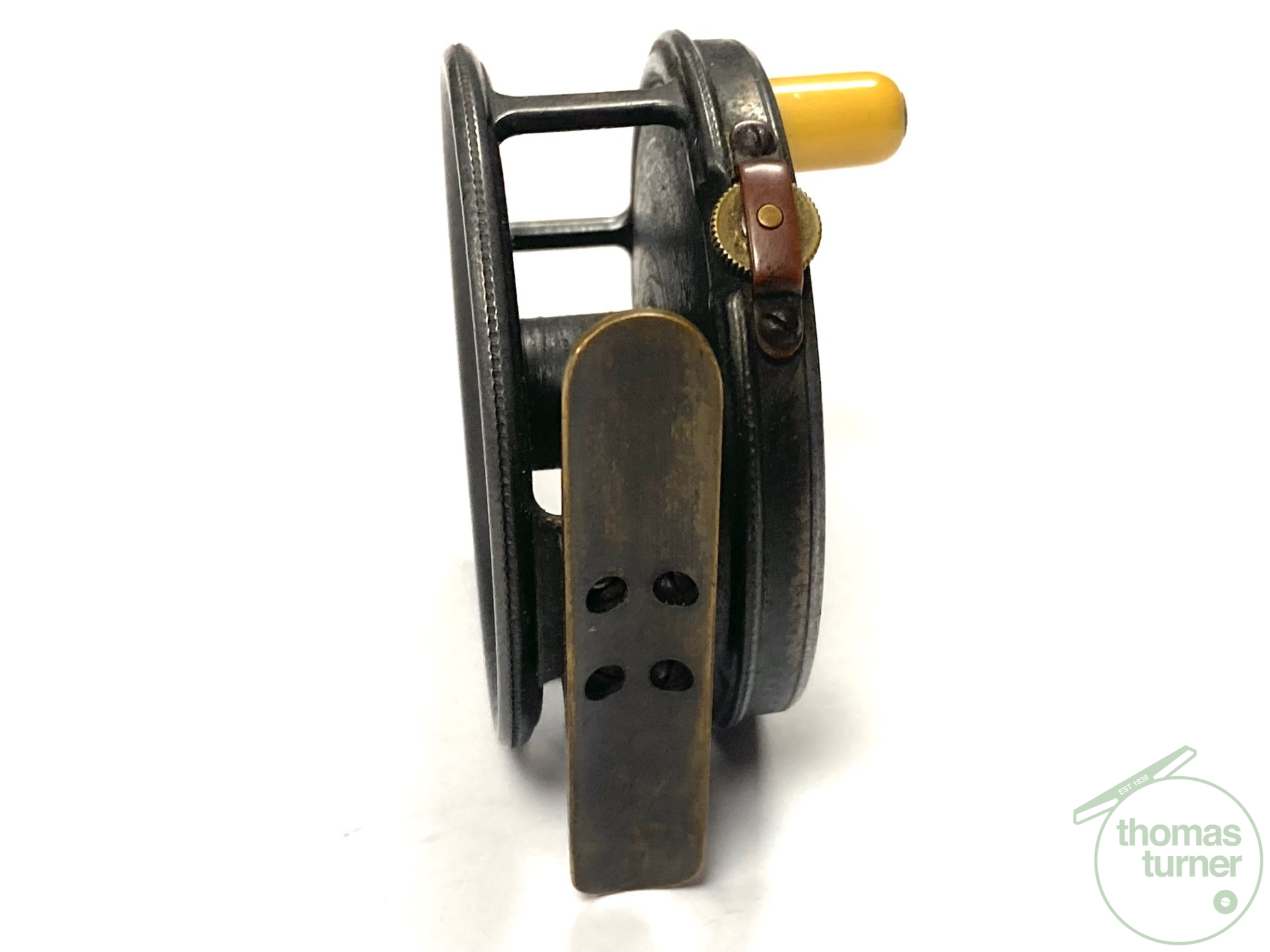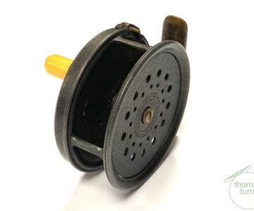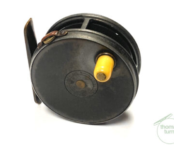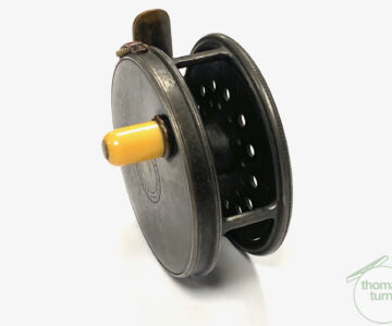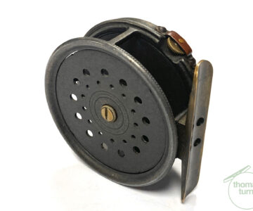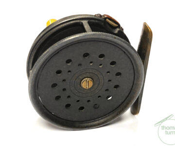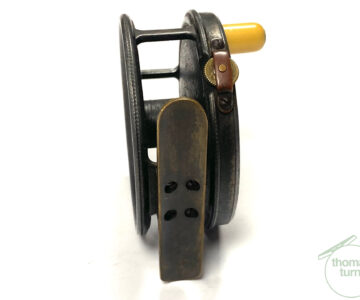 TT opinion: You don’t see many of these! A superb Hardy Perfect in the smallest contracted size made 2 3/4″ with the highly desirable 1912 check mechanism. Original white handle, brass strapped rim tension regulator, smooth brass foot and Hardy details stamped to face plate. Turns lovely with no drum rock. A very good tight reel. I’ve only seen a few 2 3/4″ with the 1912 check. Exceptionally rare.
