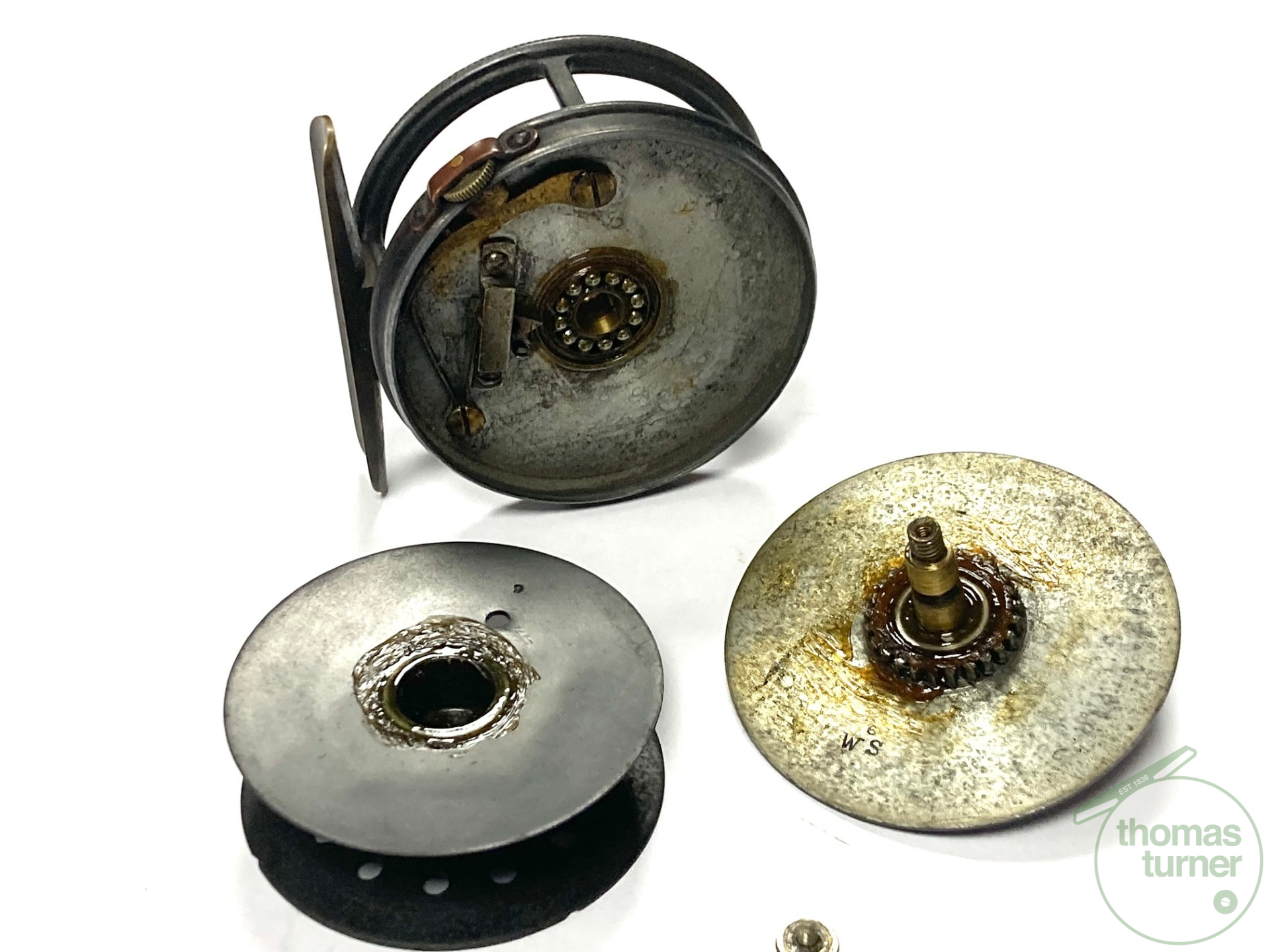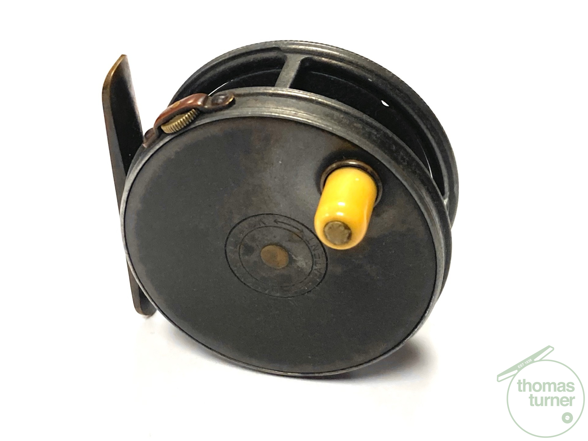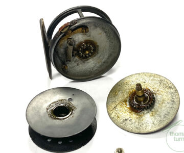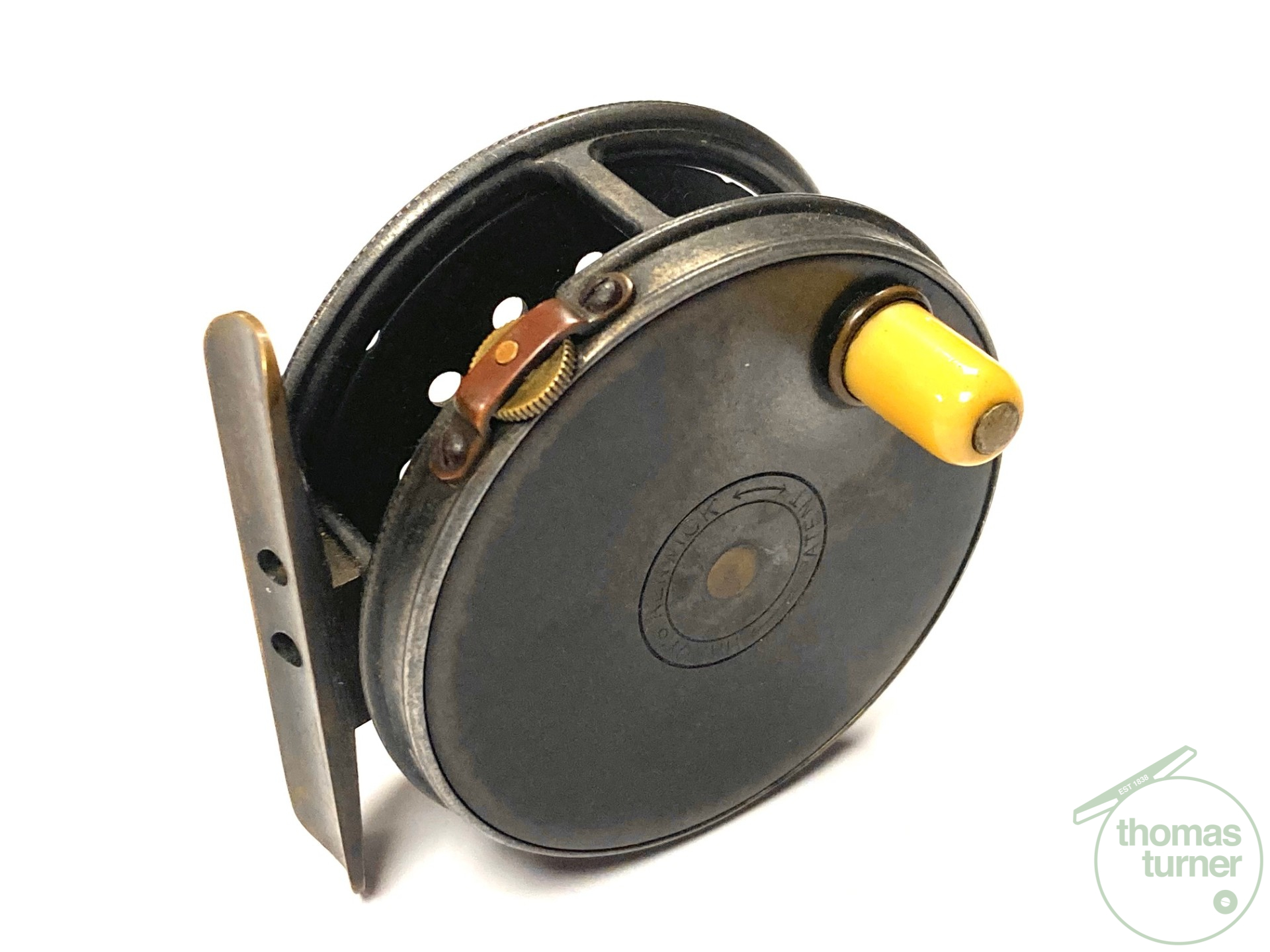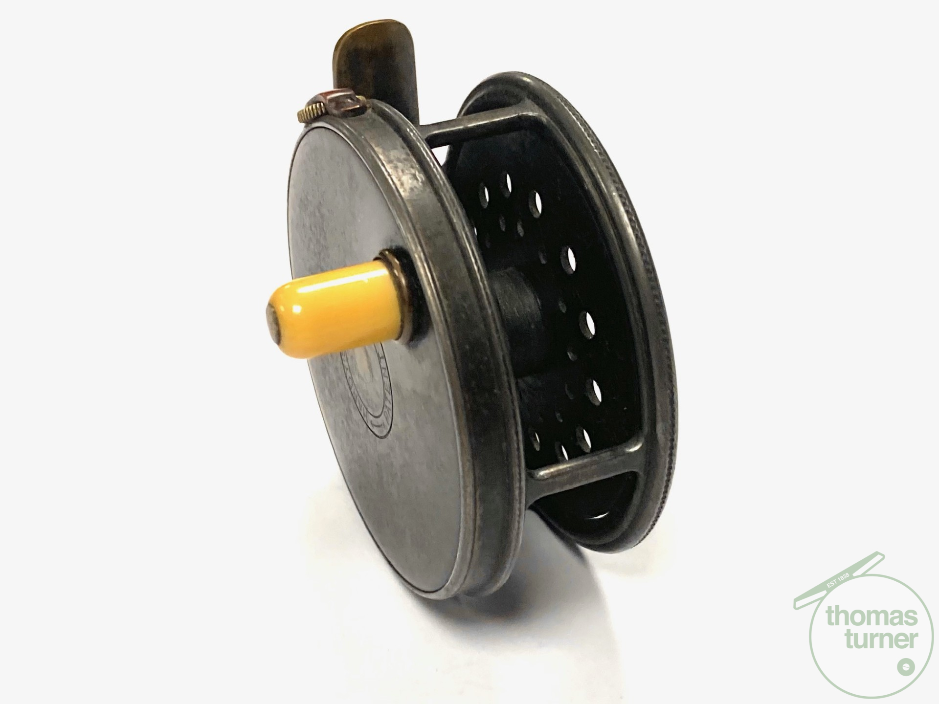 TT opinion: You don’t see many of these! A superb Hardy Perfect in the smallest contracted size made 2 3/4″ with the highly desirable 1912 check mechanism. Original white handle, brass strapped rim tension regulator, smooth brass foot and Hardy details stamped to face plate. Turns lovely with no drum rock. A very good tight reel. I’ve only seen a few 2 3/4″ with the 1912 check. Exceptionally rare.