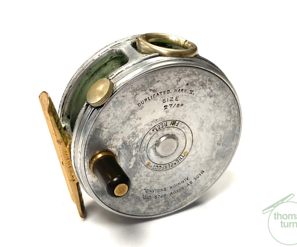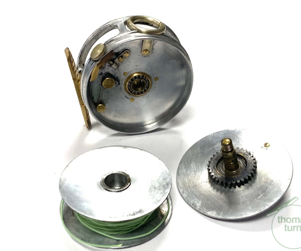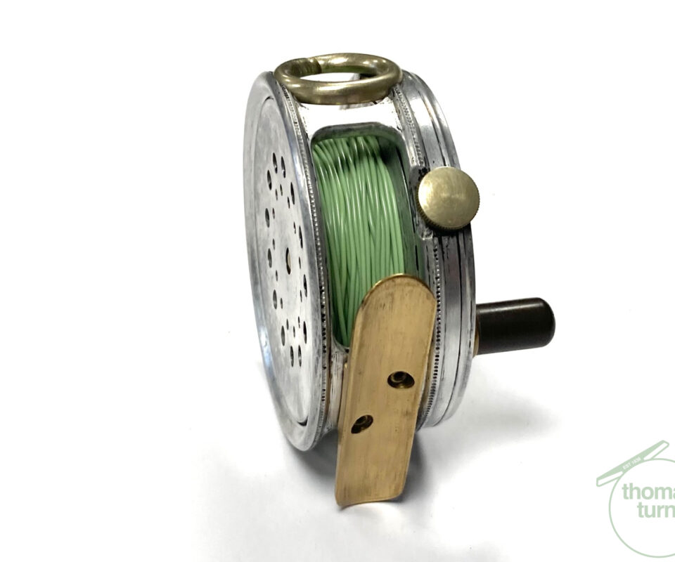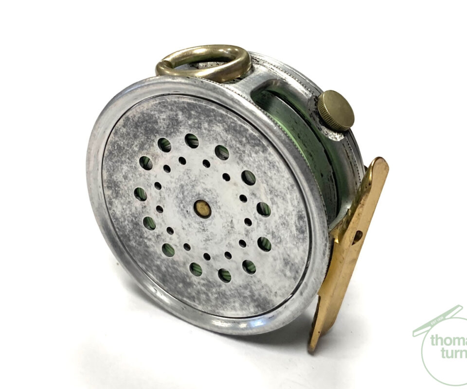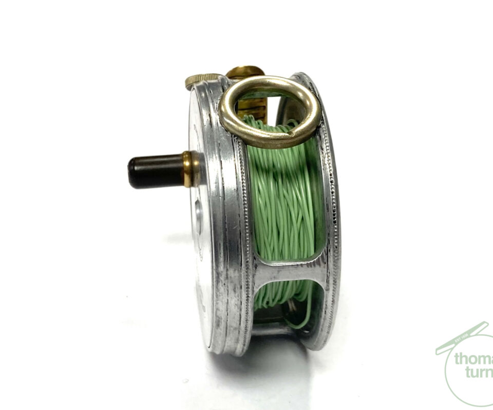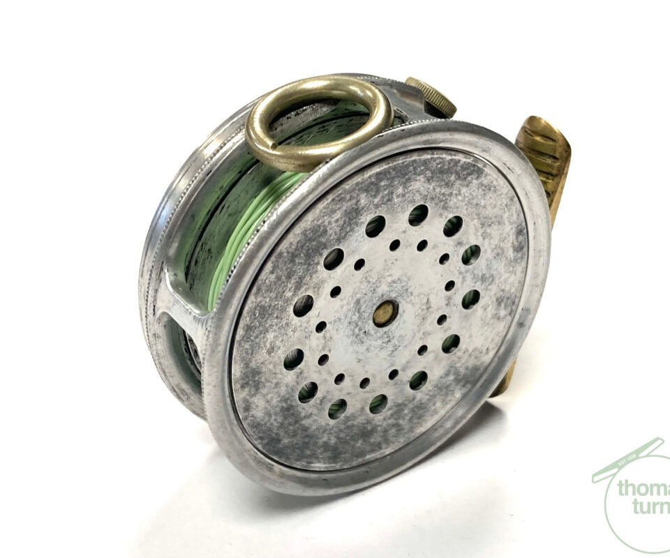 TT opinion: A fine vintage Hardy Perfect 2 7/8″ alloy fly reel in full working condition fitted with MK I check. Nickle line guide with one groove. Black handle and working rim tension adjuster. Correct 60mm ribbed brass foot. The reel runs smooth and well without play or drum rock. Silvery lead finish, ready to fish or add to any collection