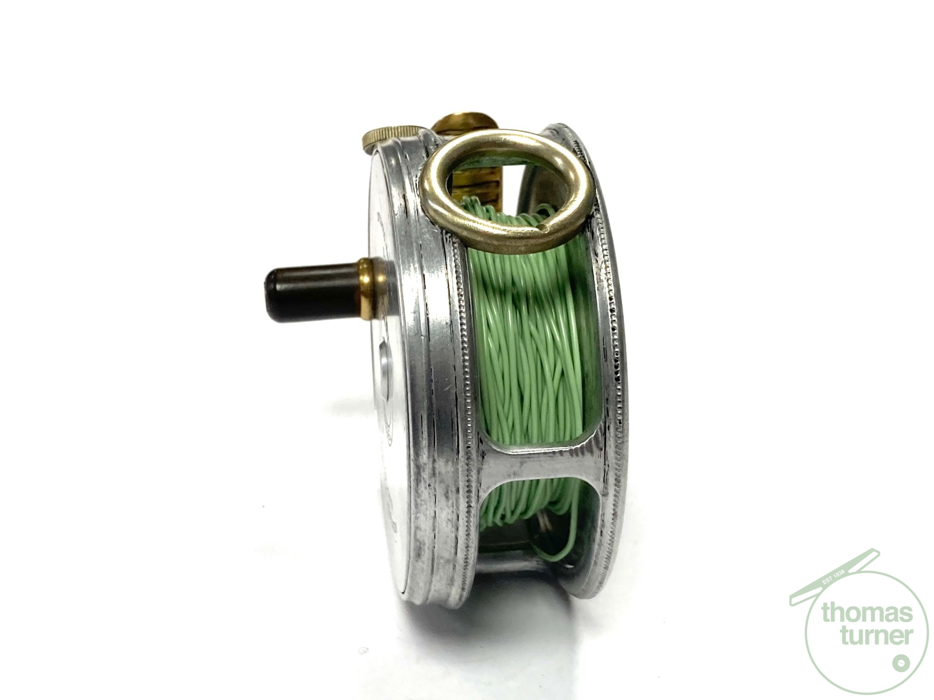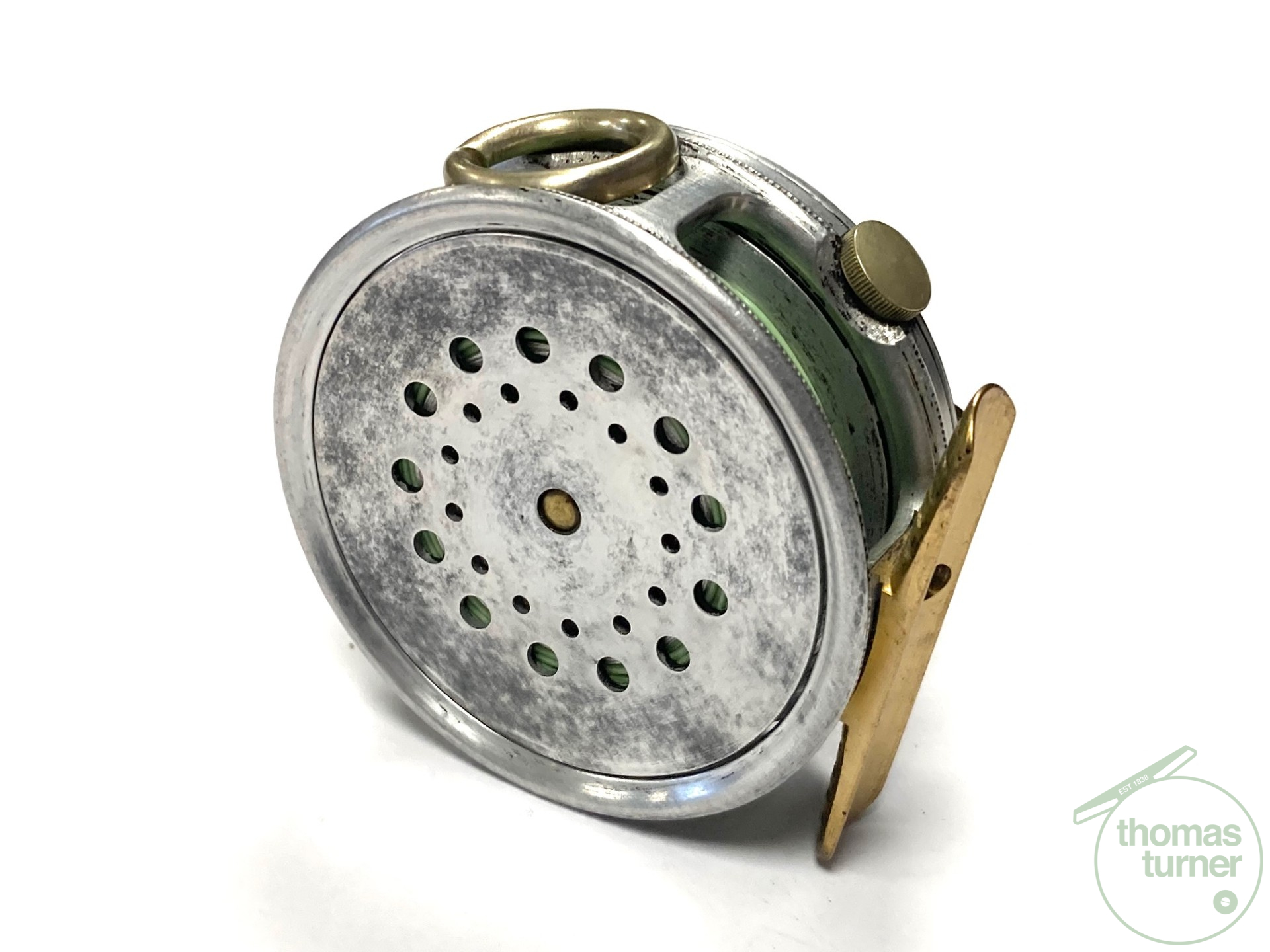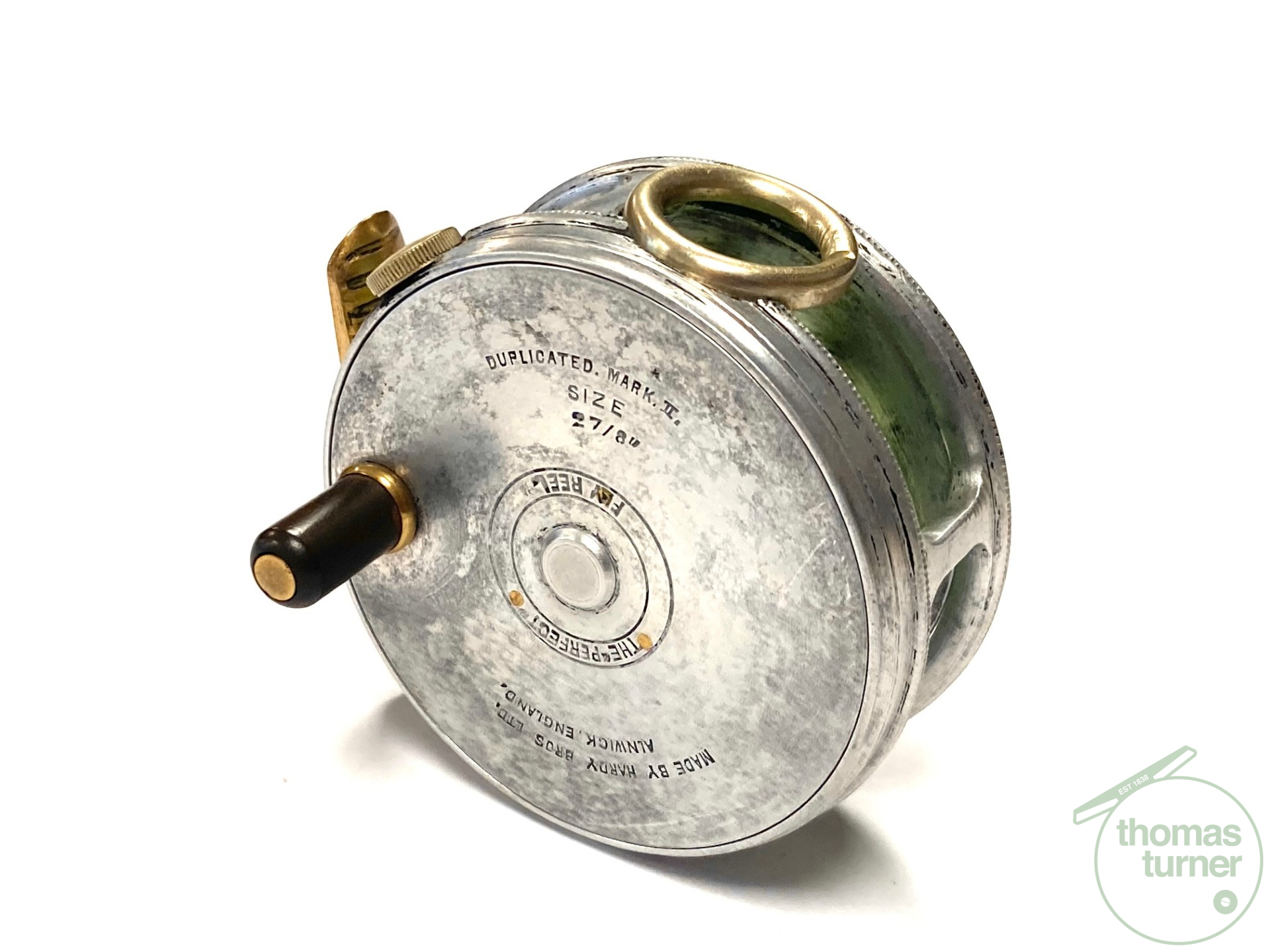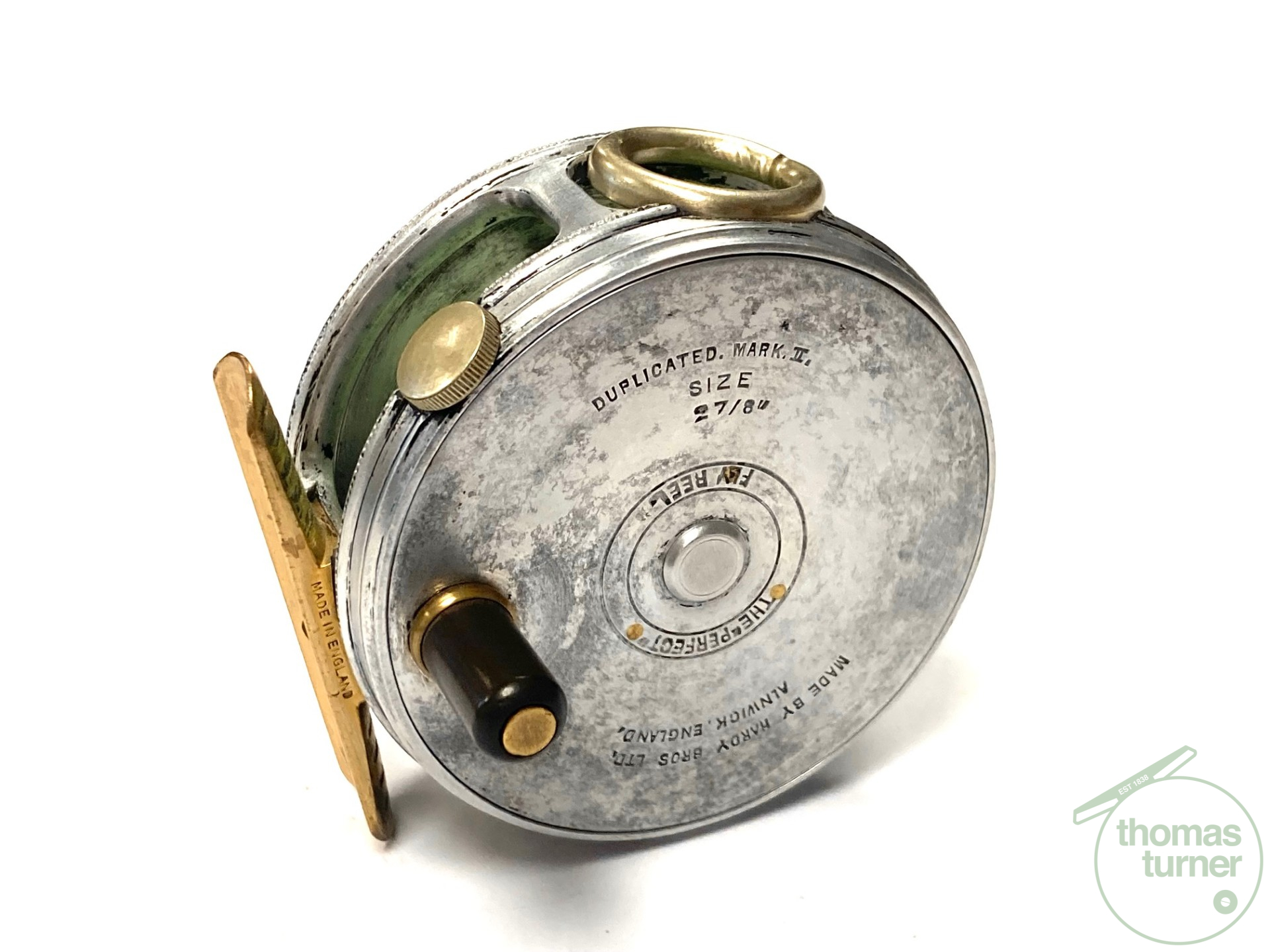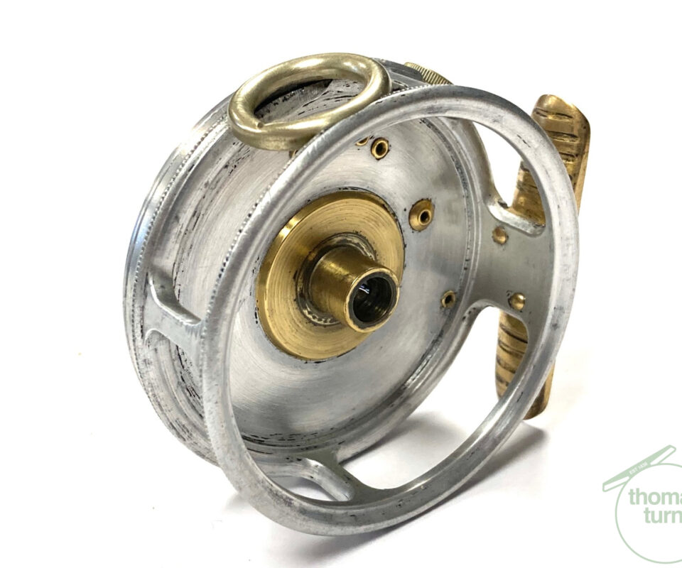 TT opinion: A fine vintage Hardy Perfect 2 7/8″ alloy fly reel in full working condition fitted with MK I check. Nickle line guide with one groove. Black handle and working rim tension adjuster. Correct 60mm ribbed brass foot. The reel runs smooth and well without play or drum rock. Silvery lead finish, ready to fish or add to any collection