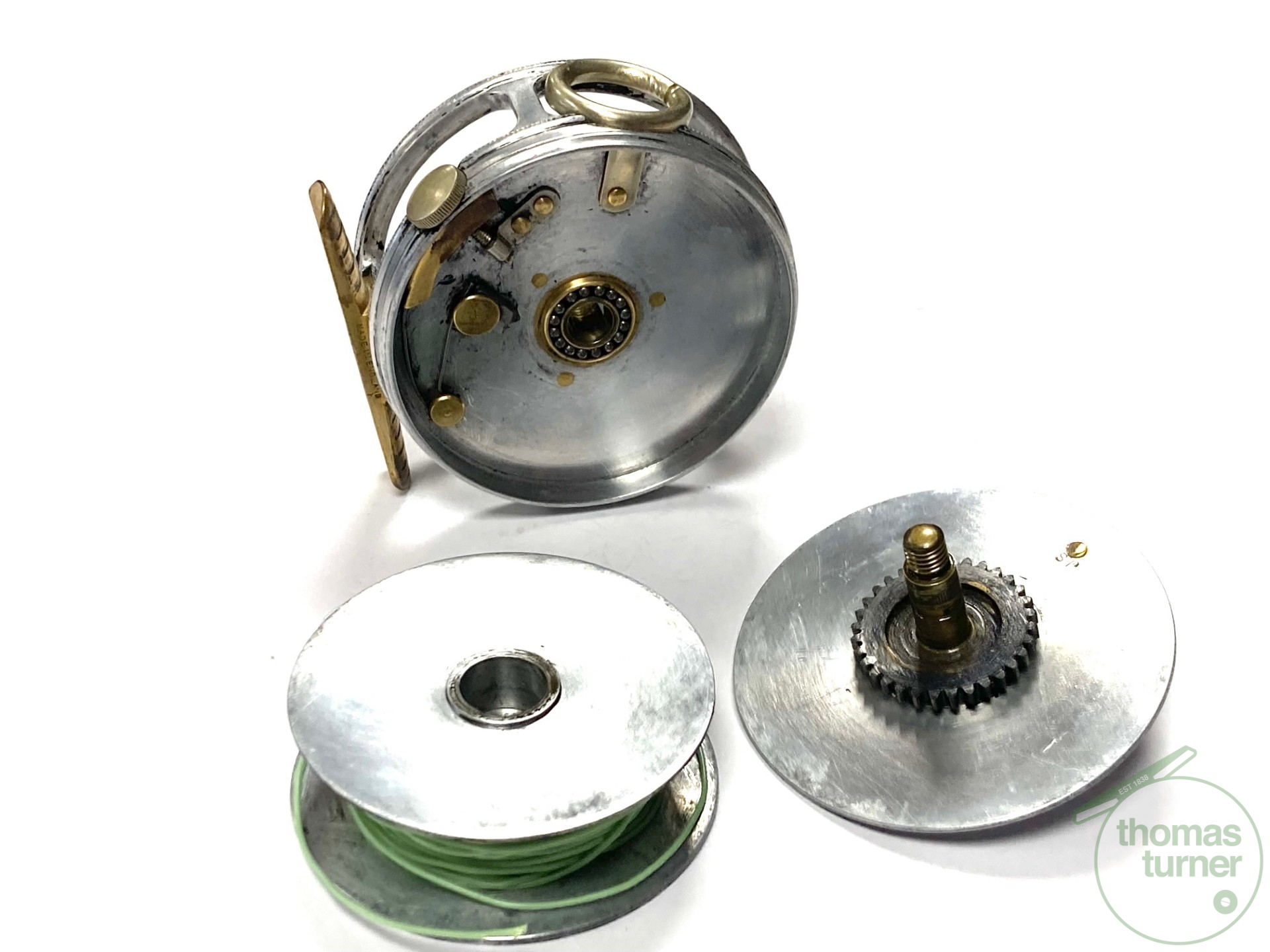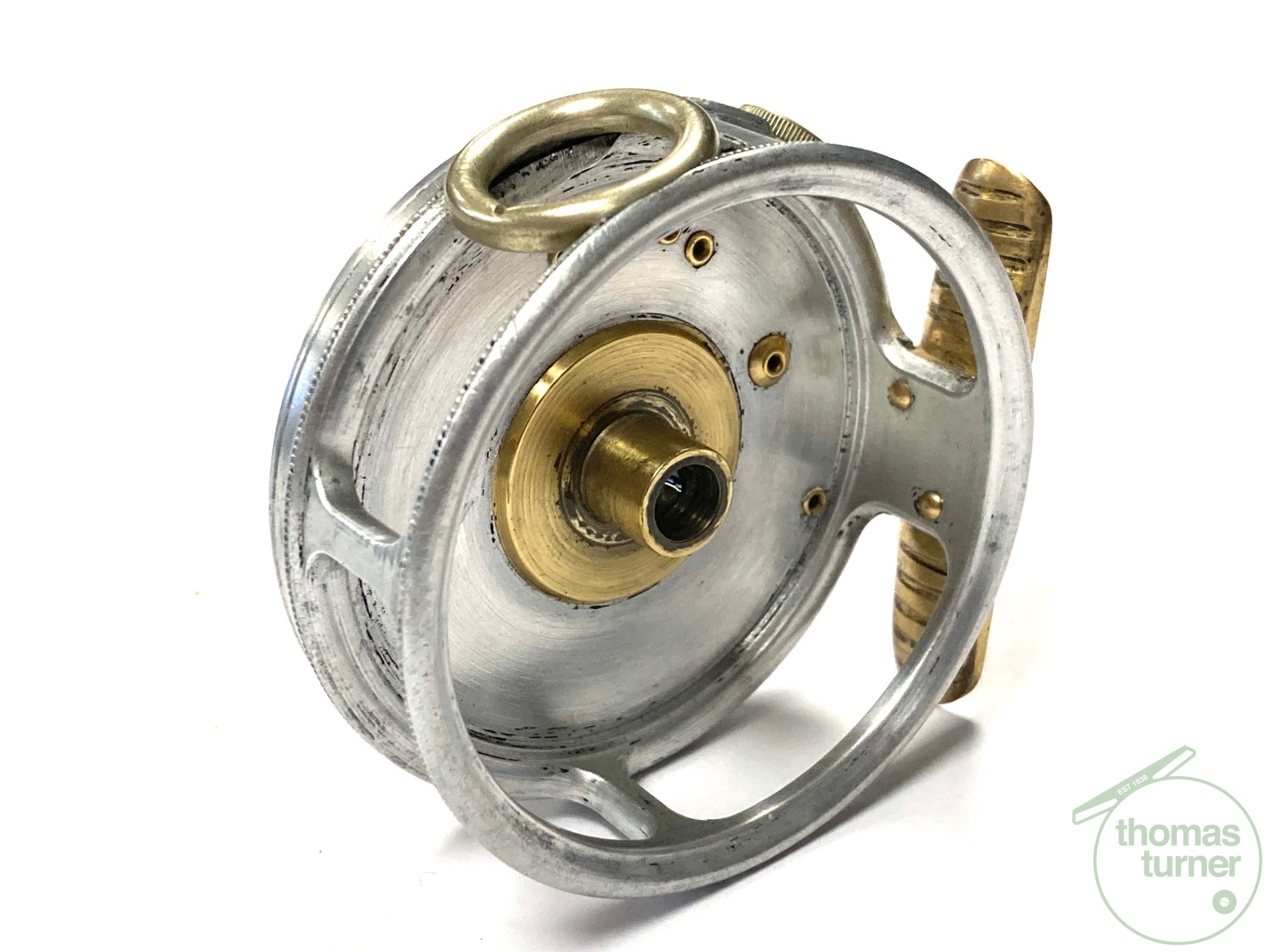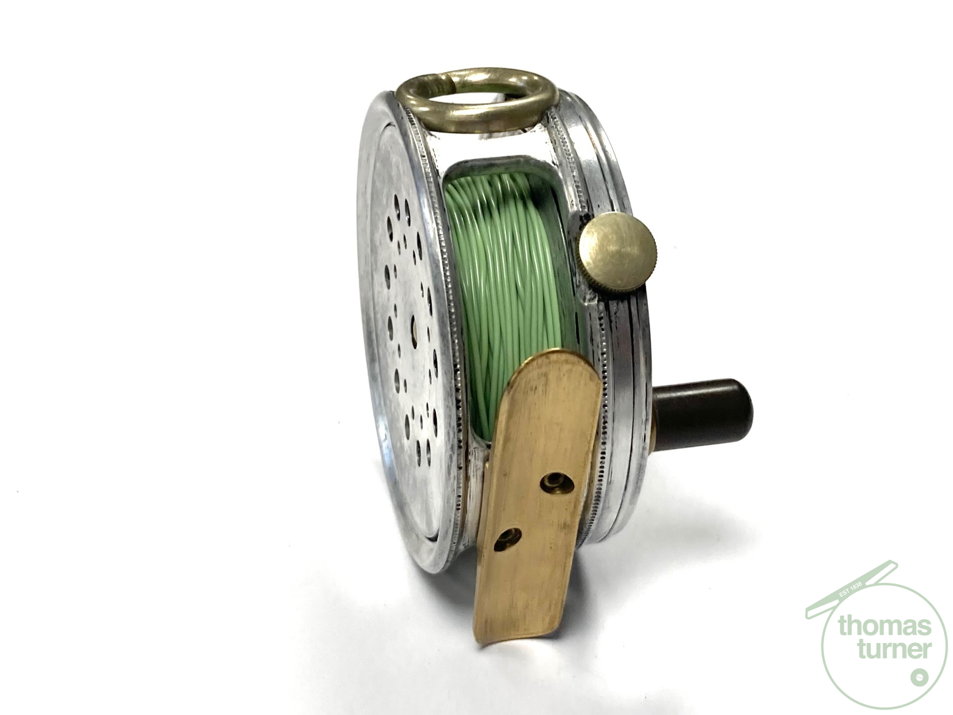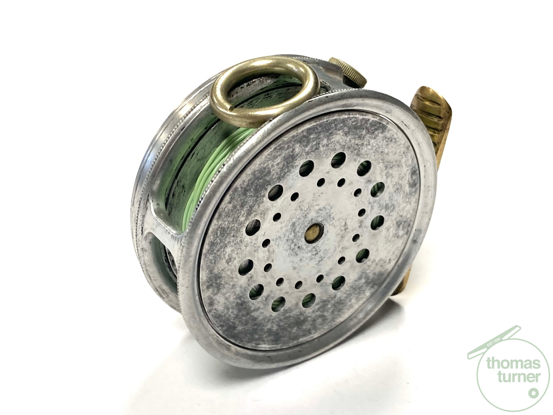 TT opinion: A fine vintage Hardy Perfect 2 7/8″ alloy fly reel in full working condition fitted with MK I check. Nickle line guide with one groove. Black handle and working rim tension adjuster. Correct 60mm ribbed brass foot. The reel runs smooth and well without play or drum rock. Silvery lead finish, ready to fish or add to any collection