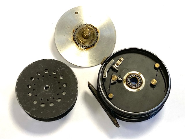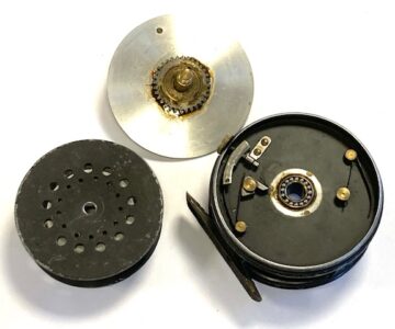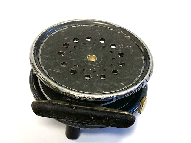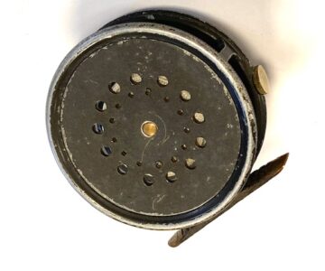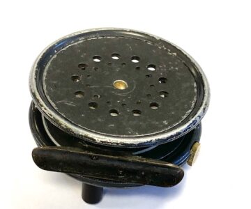 TT opinion: A very good used Hardy Perfect trout fly reel size 3 1/8″ with black ebonite handle, ribbed brass foot ( not filed), rim tensioner and spare spool. Winds fine, no drum rock or play. Ready to fish!