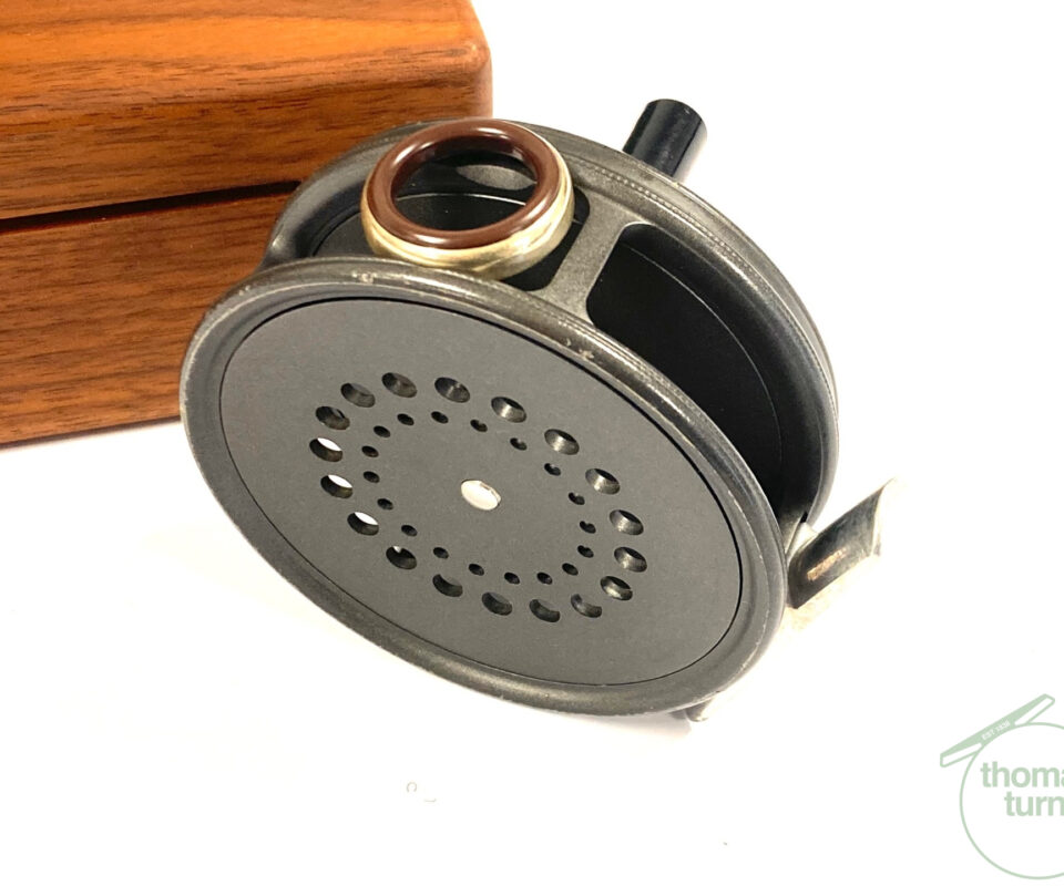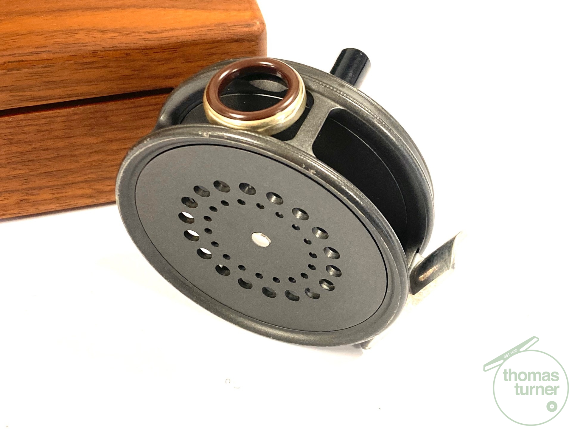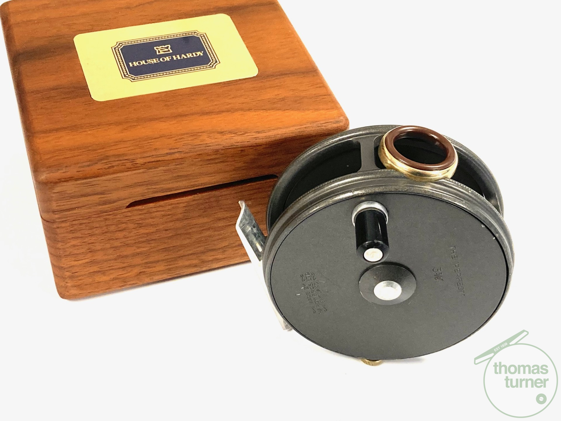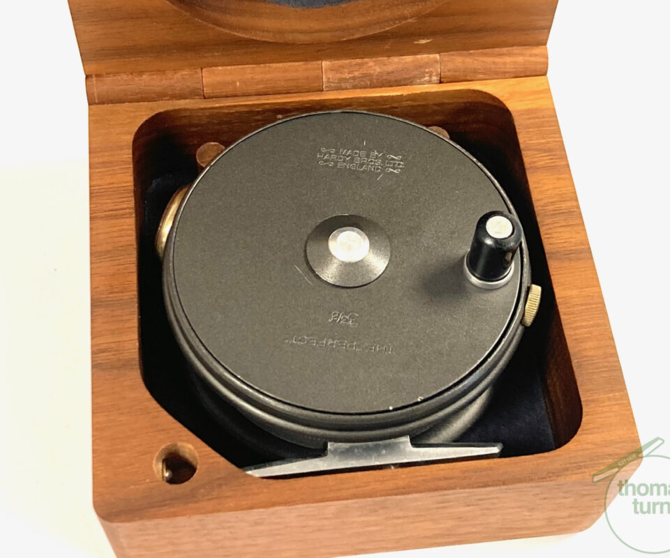 TT opinion: Just in from a nice Hardy collection this very good Hardy Perfect 3 3/8″ narrow drum alloy fly reel with good smoke dark red line guide. Right hand wind. Hand-built in Alnwick by craftsman reel makers. The black handle turns freely. Working rim tension adjuster. Light wear to rims. Twin internal springs and checks. The reel runs silky smooth, no play, no damage or alterations. Comes in rare Hardy walnut reel case. Check our other listing for more Hardy reels from this collection!!!