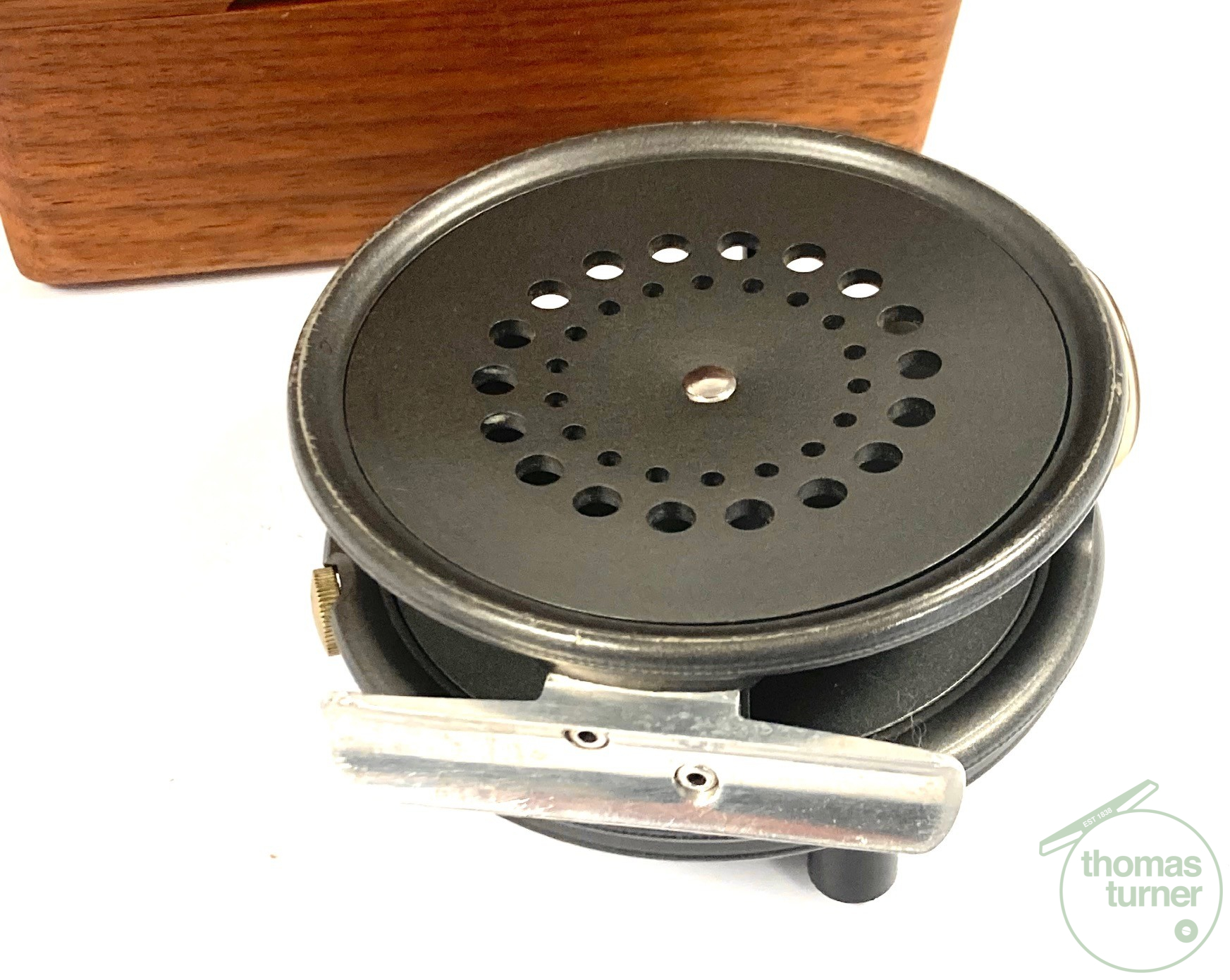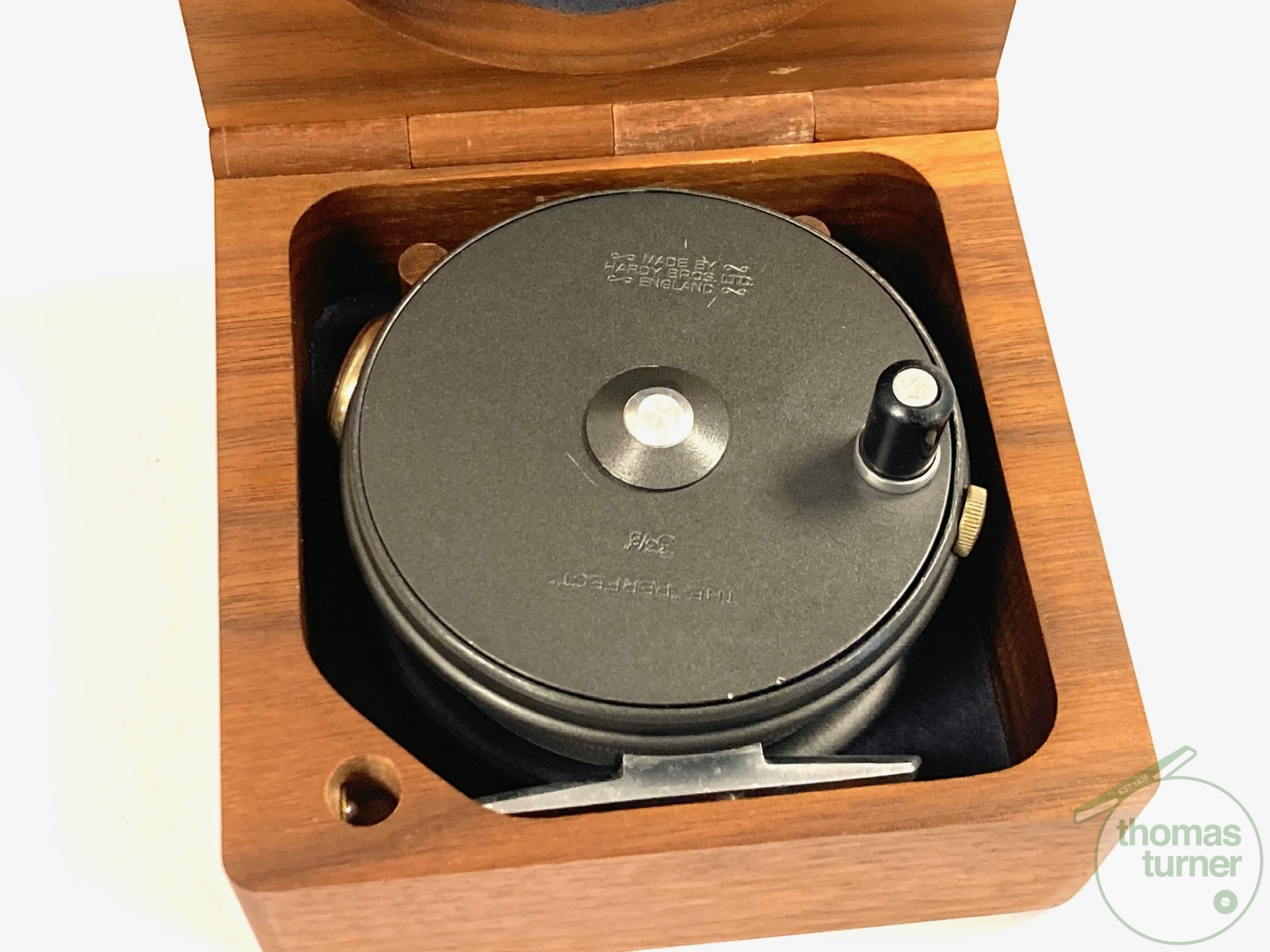 Hardy Perfect 3 3/8″ alloy fly reel with red guide and Hardy Walnut fitted case