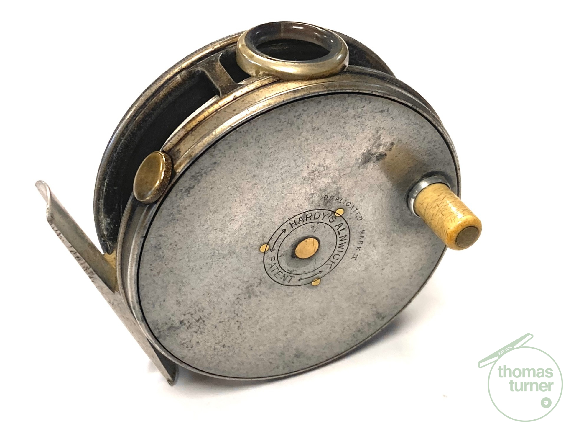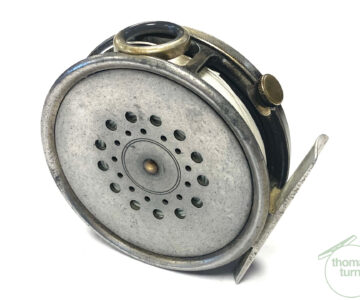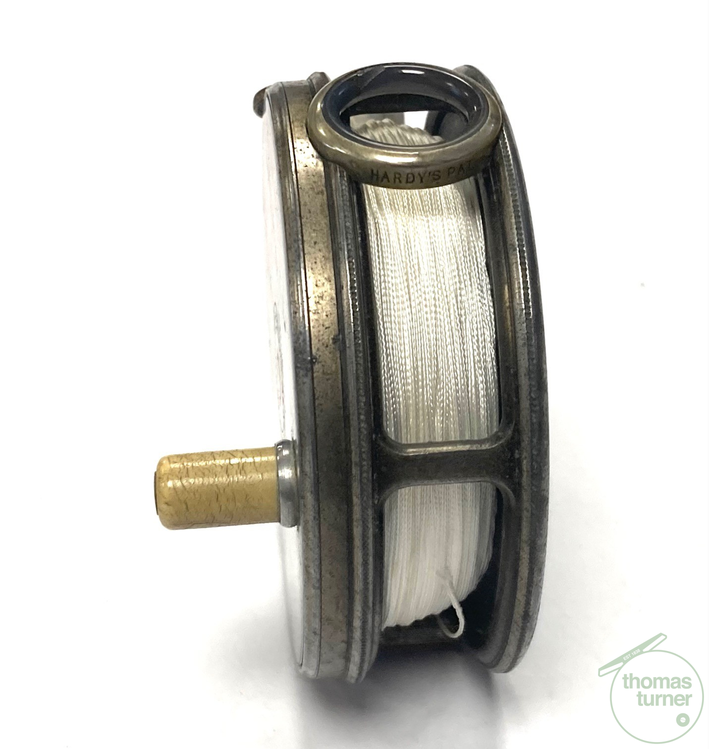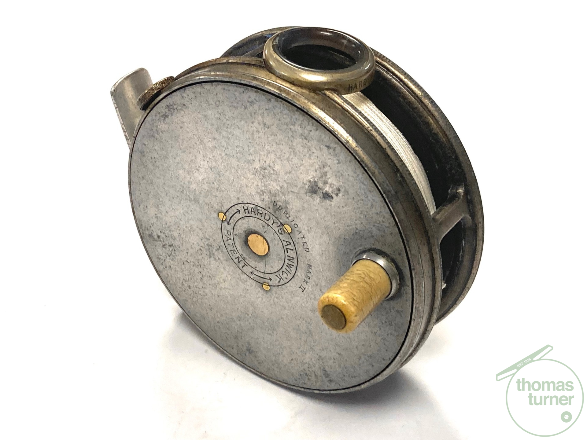 Another very good example of a fishable Hardy Perfect in size 3 3/8″ with xylonite handle, rim tensioner, 62mm straight alloy foot shortened at one end plus and line guard – one hair line. No drum rock or play. Right hand wind. Early ‘cross-over’ duplication mark with ‘HARDYS PATENT ALNWICK’ and ‘DULPCIATED MARK II’. Reels winds fine and all fully working. One to fish or collect!