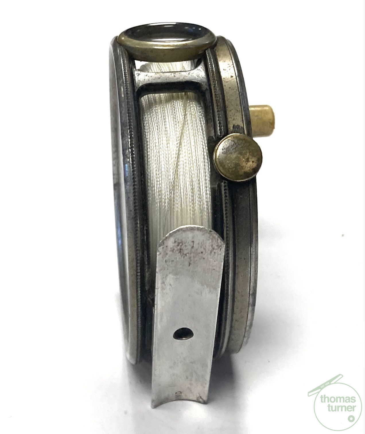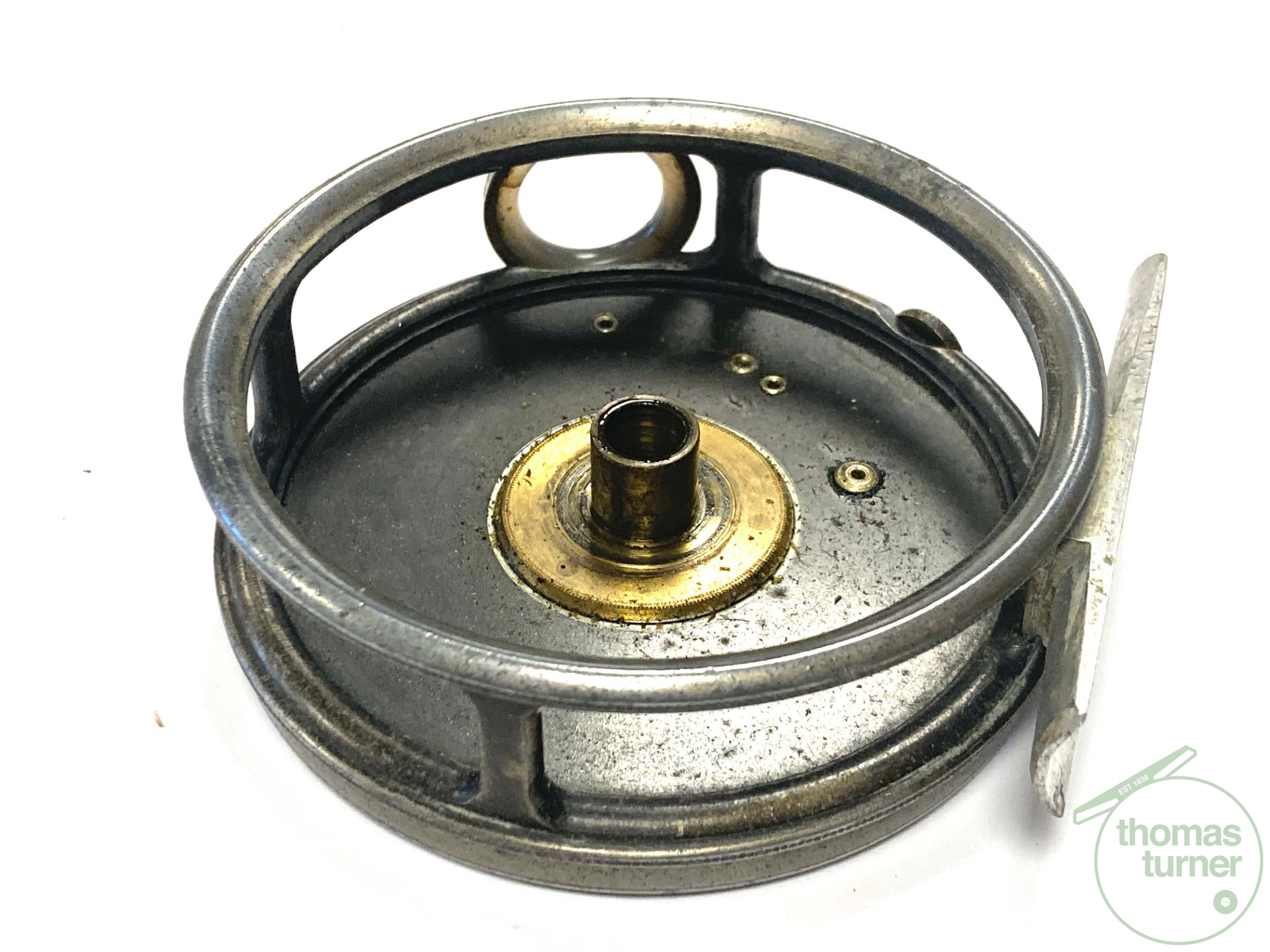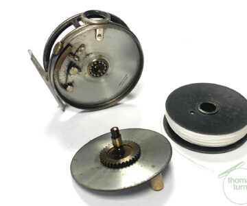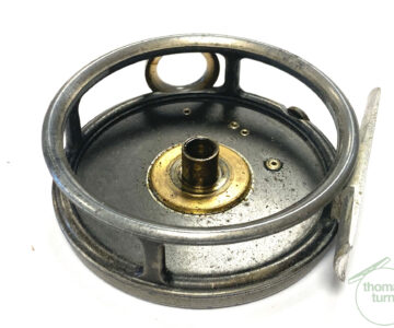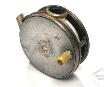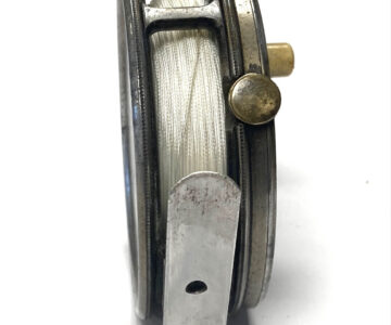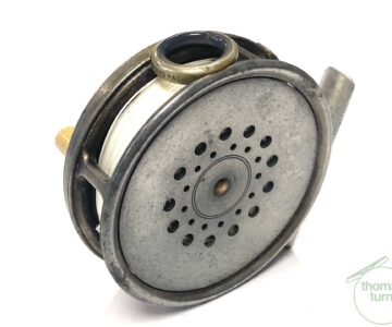 Another very good example of a fishable Hardy Perfect in size 3 3/8″ with xylonite handle, rim tensioner, 62mm straight alloy foot shortened at one end plus and line guard – one hair line. No drum rock or play. Right hand wind. Early ‘cross-over’ duplication mark with ‘HARDYS PATENT ALNWICK’ and ‘DULPCIATED MARK II’. Reels winds fine and all fully working. One to fish or collect!
