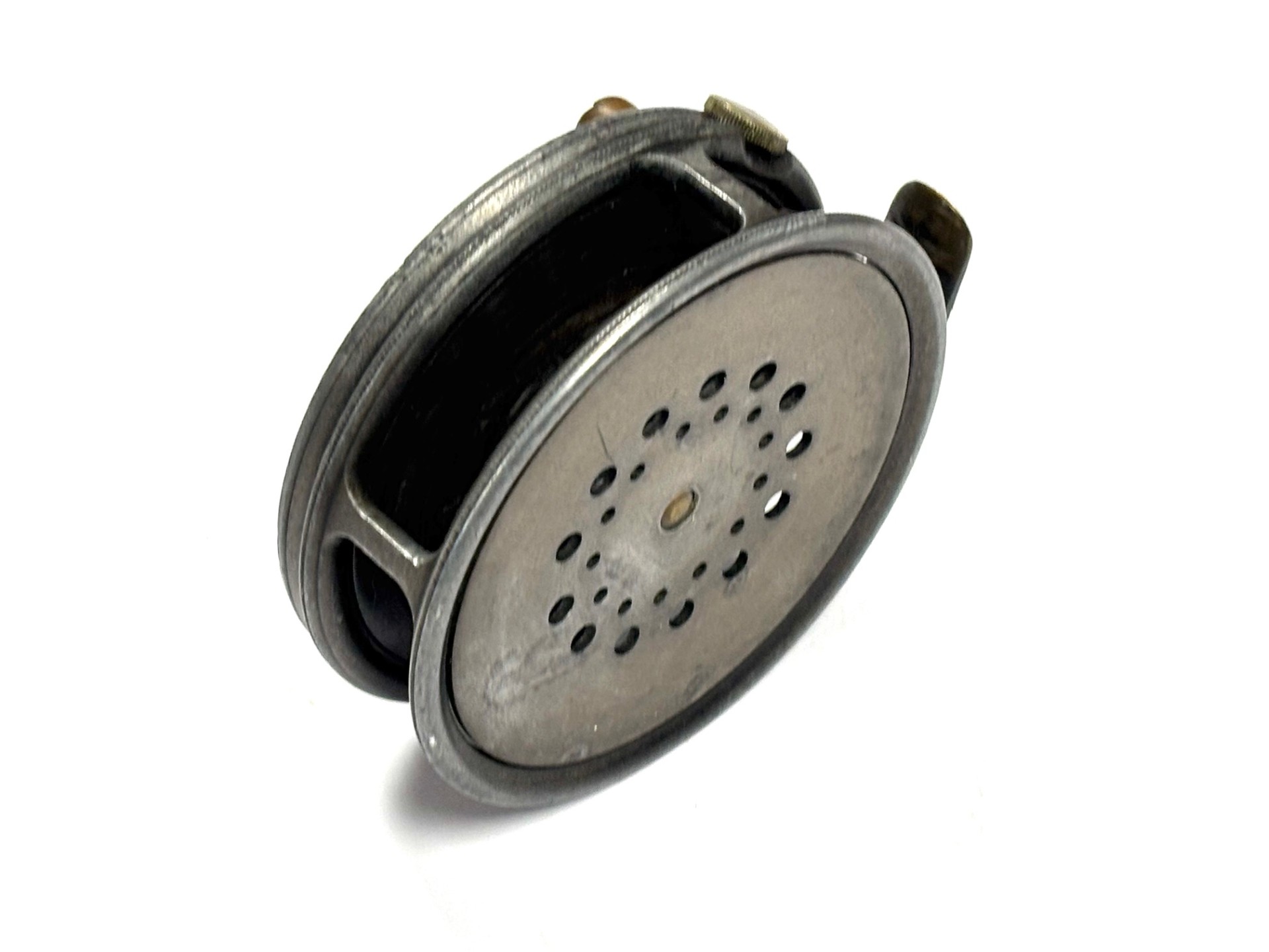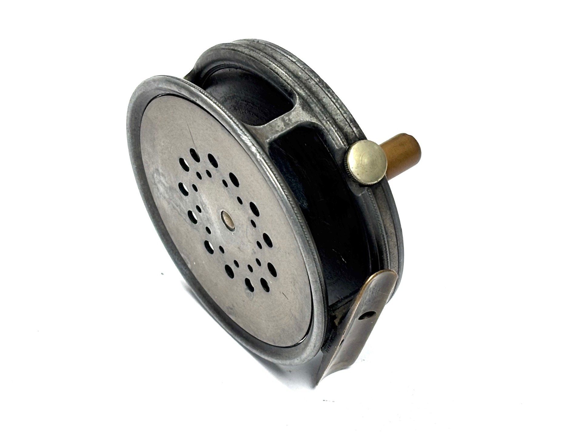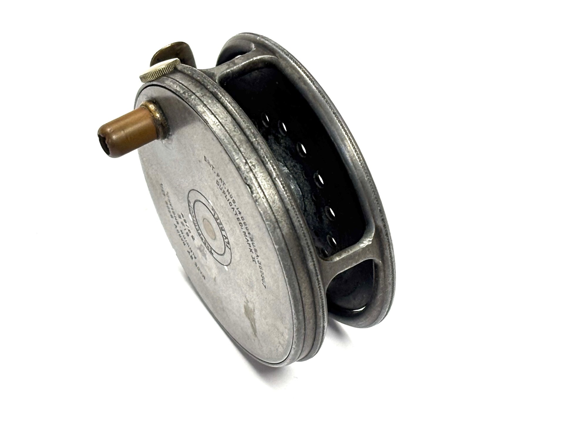 TT opinion: Another good used example of a fishable Hardy Perfect in size 3 3/8″ with replacement later handle, rim tensioner, 60mm ribbed brass foot. No drum rock or play. Right hand wind. Wear to rims. Good used reel. One to fish.