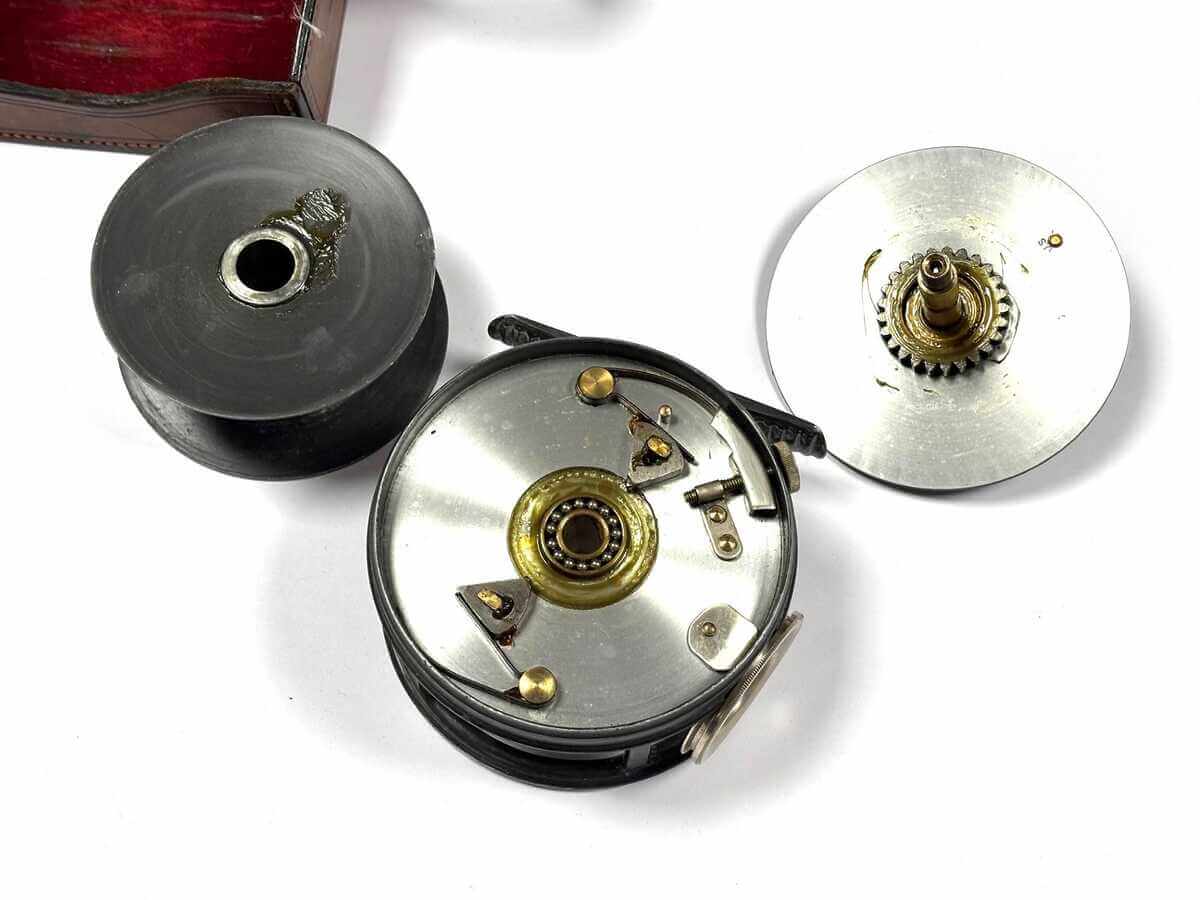 TT opinion: Just in as part of a nice collection this classic Hardy Perfect 4″ diameter MKII wide drum salmon fly reel. Revolving nickel lien guard. Factory original throughout, rim tension adjuster, original left-hand drum screw, the reel is right hand wind with twin internal springs and steel pawls. Smooth check clicker. No drum rock or play, complete with lovely leather case.